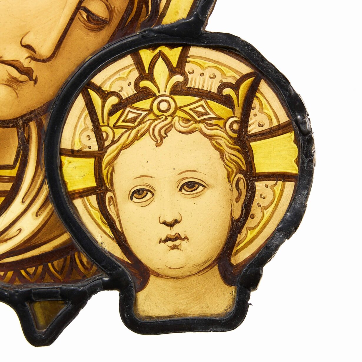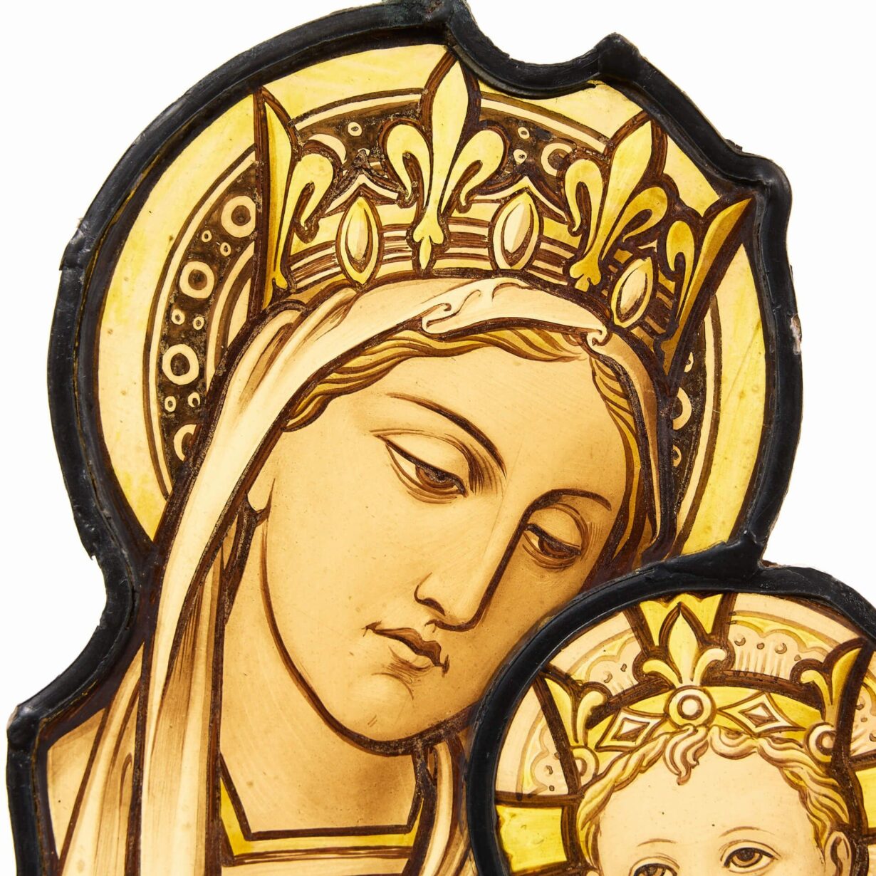 back to topA finely painted antique stained glass window hanging by Hardman & Co. depicting an ecclesiastical female alongside a youth, possibly baby Jesus, both with crowns and halos.