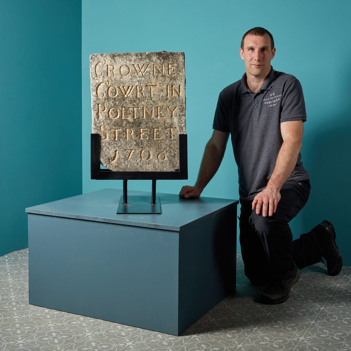 back to topHistoric London Street Plaque Dated 1706. The stone plaque reads “Crowne Cowrt in Poltney Street 1706” in gold lettering and it has been mounted onto a bespoke steel stand. We believe this relates to the Pulteney Street area in London when the Crown took possession of the land in 1699. Part of an area rebuilt after the Great Fire of London. It is an intriguing piece worthy of further research.