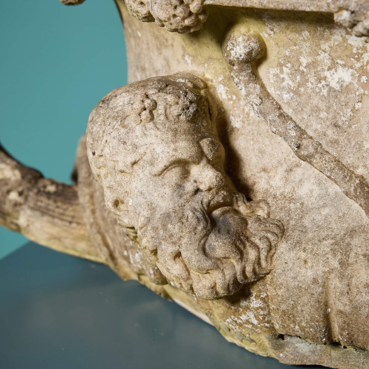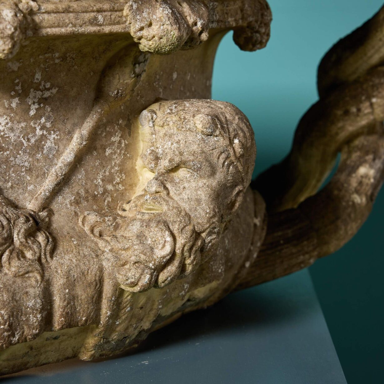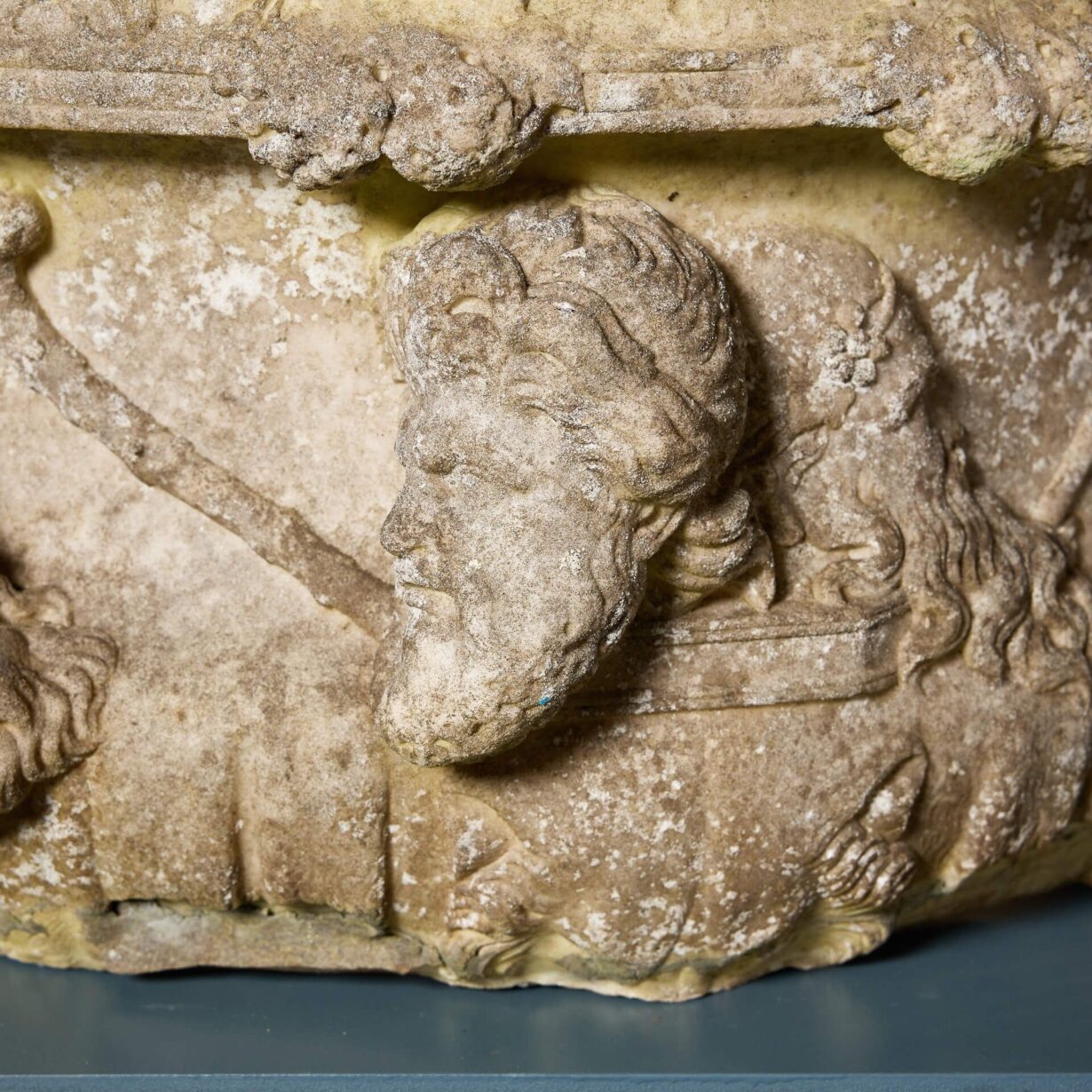 The detail of this beautiful fragmentary urn offers a glimpse into the styles of ancient Italy, the body finely carved with male and female profiles in high relief accompanied by an entwined handle reminiscent of the famous Warwick Vase.