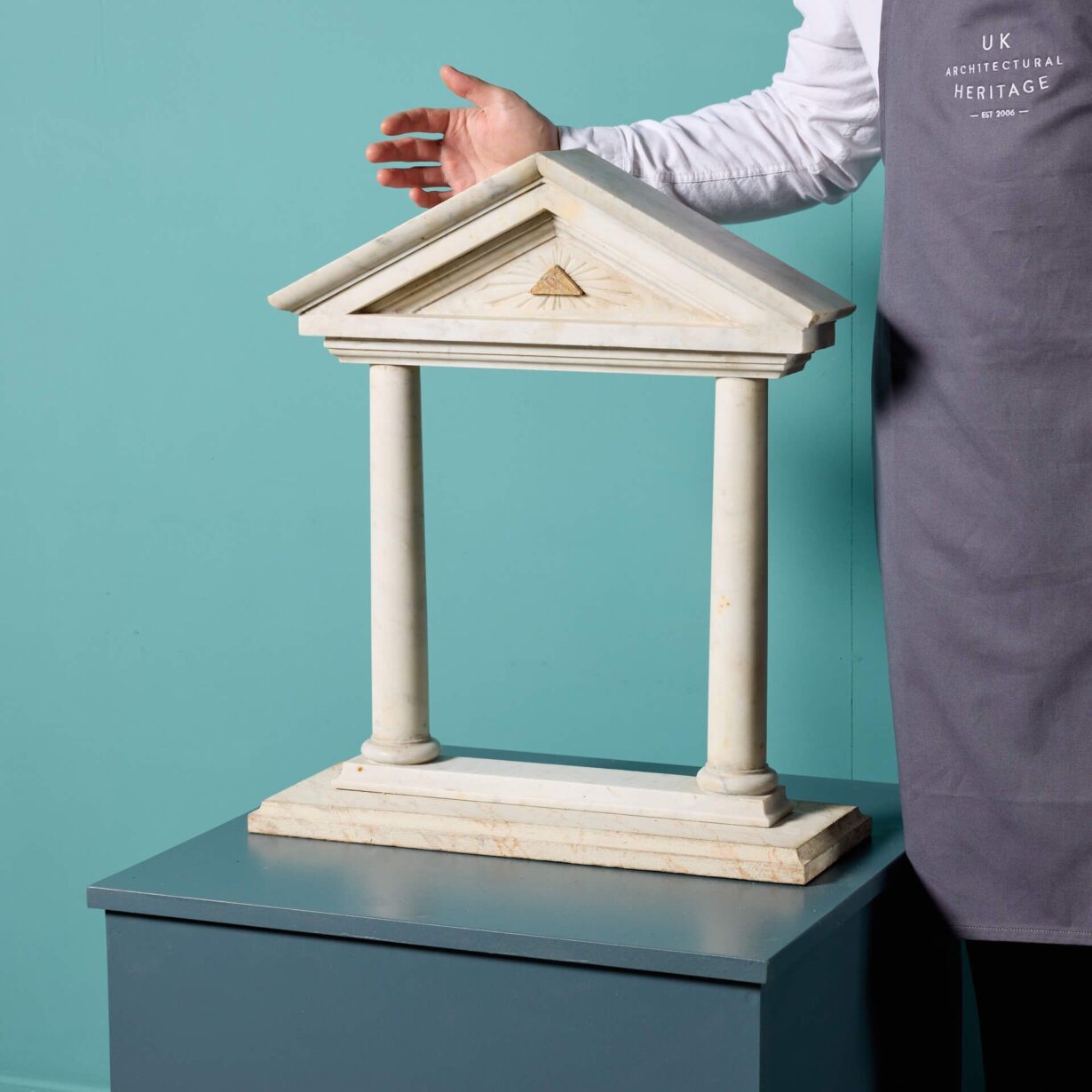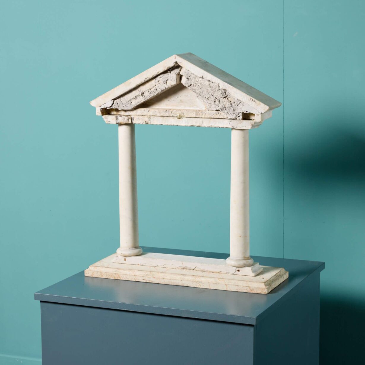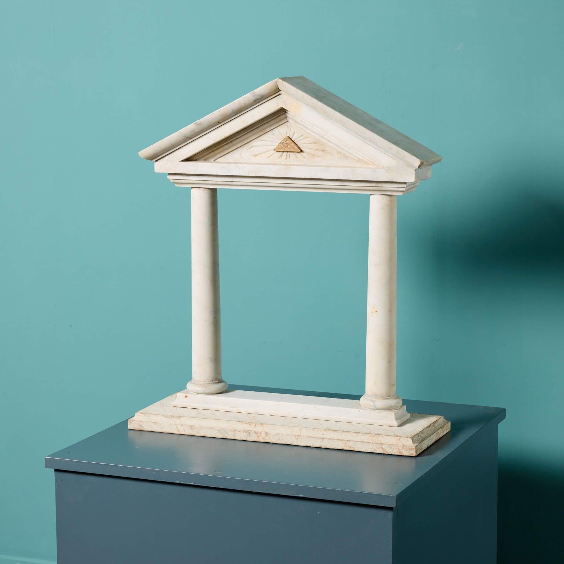 back to topAn antique Italian Grand Tour model of temple entrance in the manner of the ancient Greek Acropolis, Athens. The subject of this mid 19th century model is beautifully captured in fine quality Carrara marble, the apex inset with a triangle of coloured marble that radiates a striking sunburst. It is mounted onto a wooden board with a marble effect finish to match.
