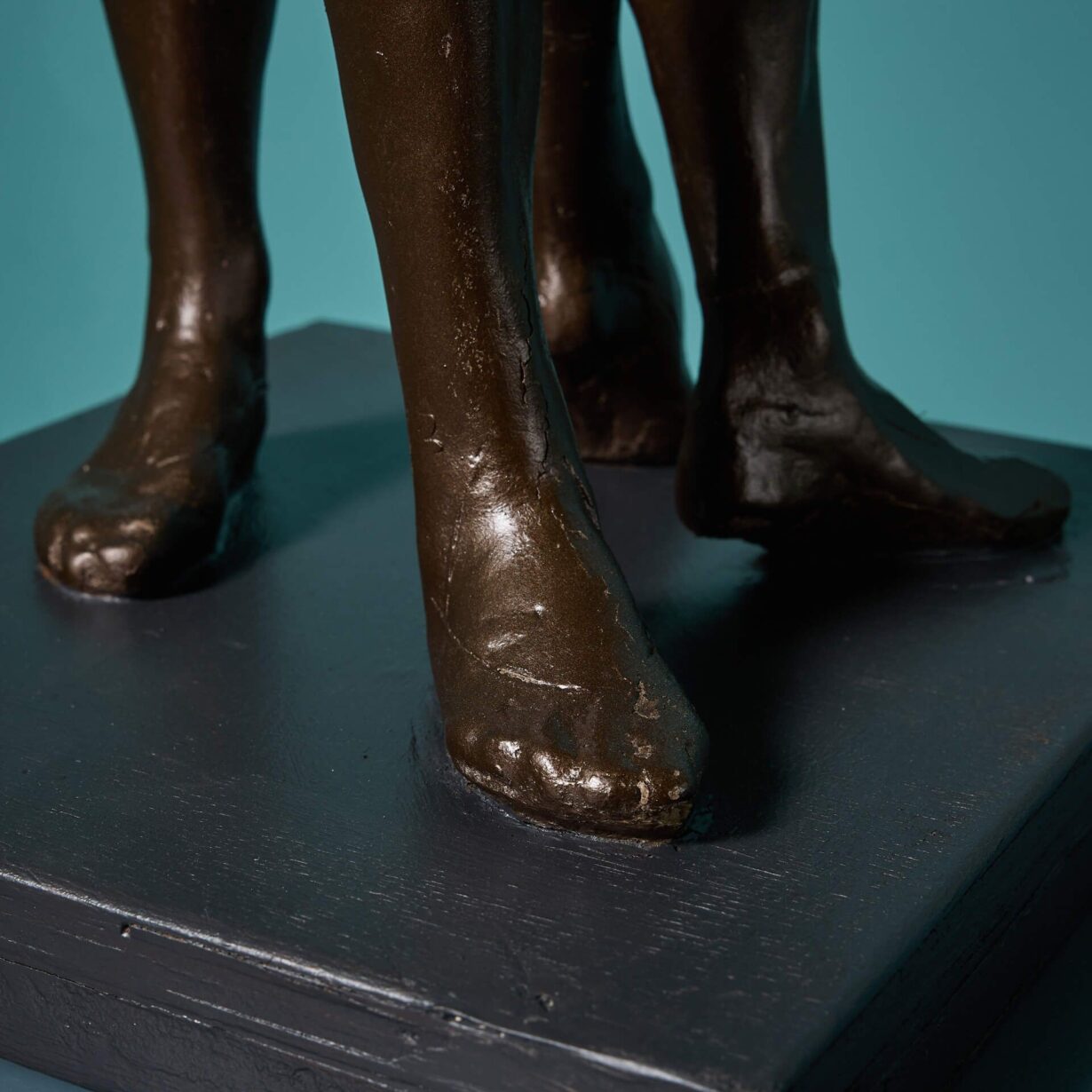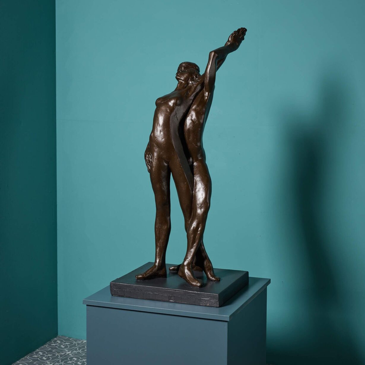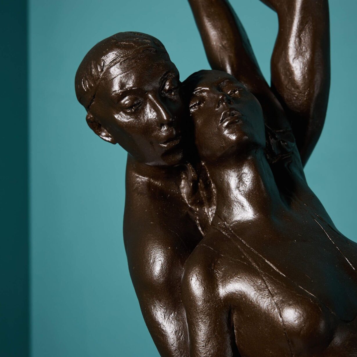Just one of various resin maquettes we are selling from the late artist’s collection, this bronzed resin sculpture would have been used as a model for the final bronze. Mounted on a wooden base, two figures dance together, each with an arm raised back in unison to create a sense of movement, bringing an air of elegance to your interior.