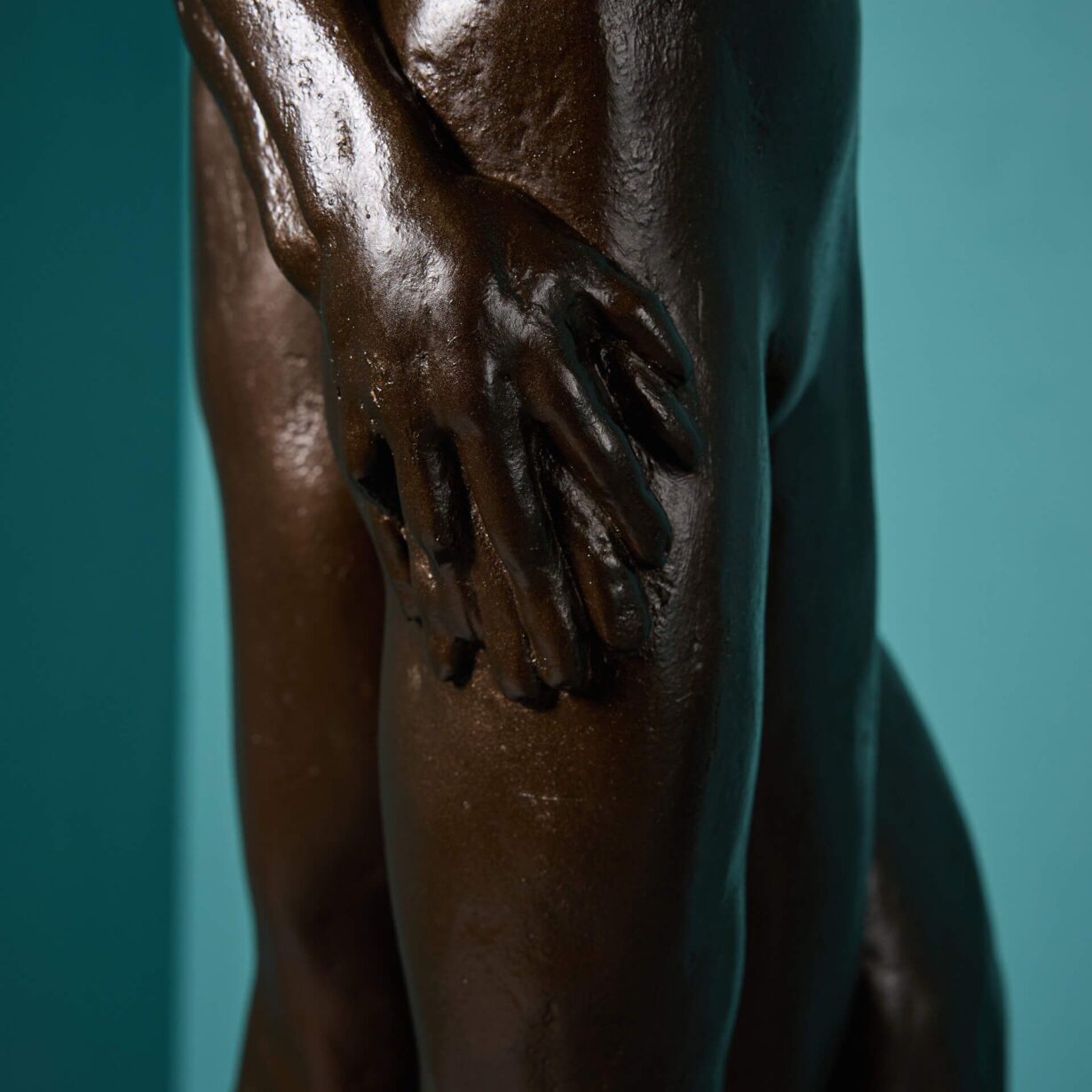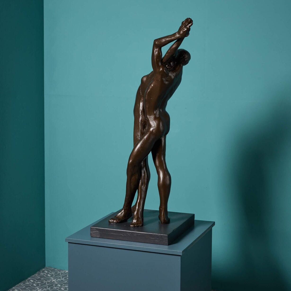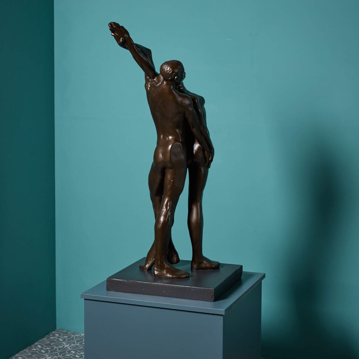 Just one of various resin maquettes we are selling from the late artist’s collection, this bronzed resin sculpture would have been used as a model for the final bronze. Mounted on a wooden base, two figures dance together, each with an arm raised back in unison to create a sense of movement, bringing an air of elegance to your interior.