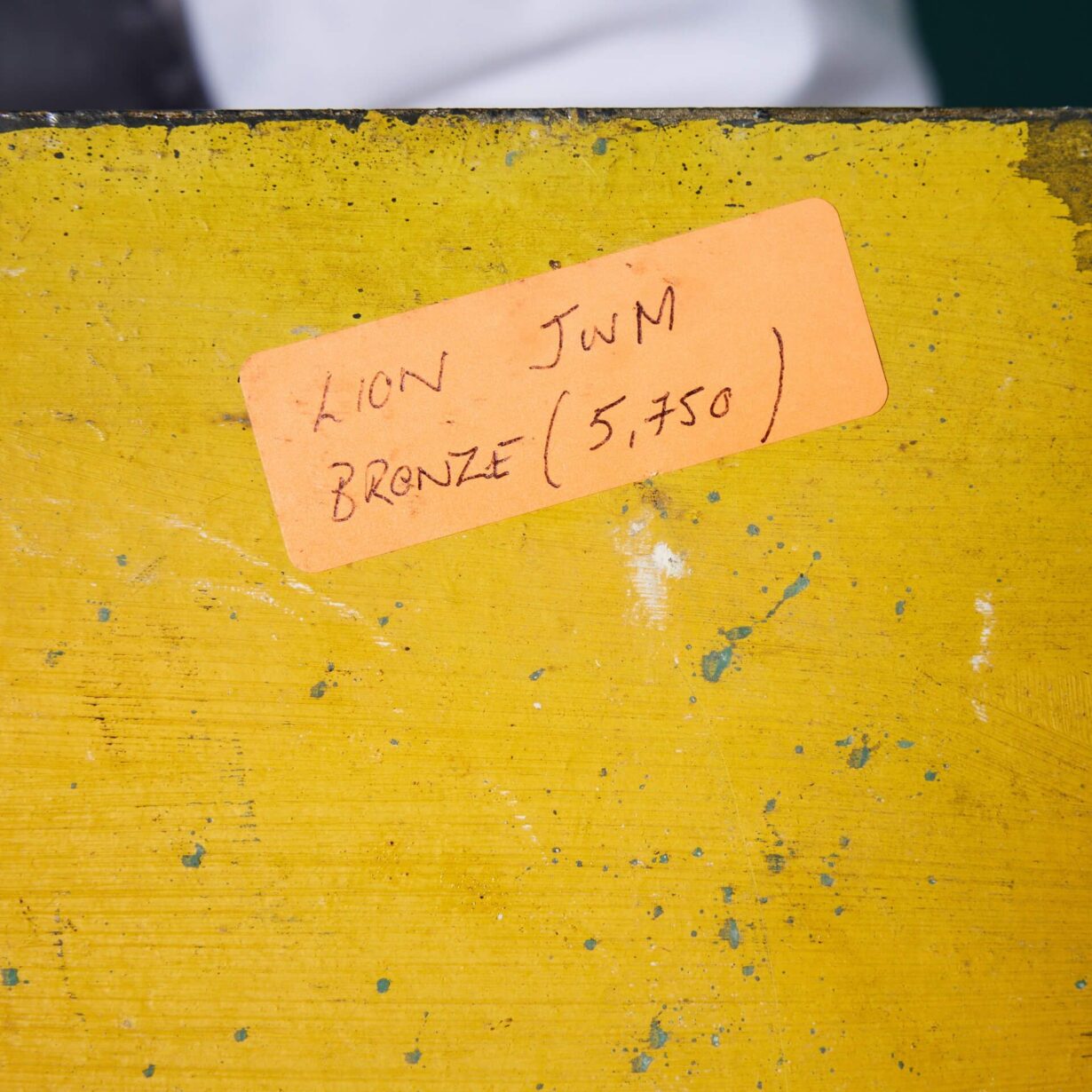 A handwritten pen inscription to the bottom of the base reads ‘Lion JWM Bronze 5,750’.