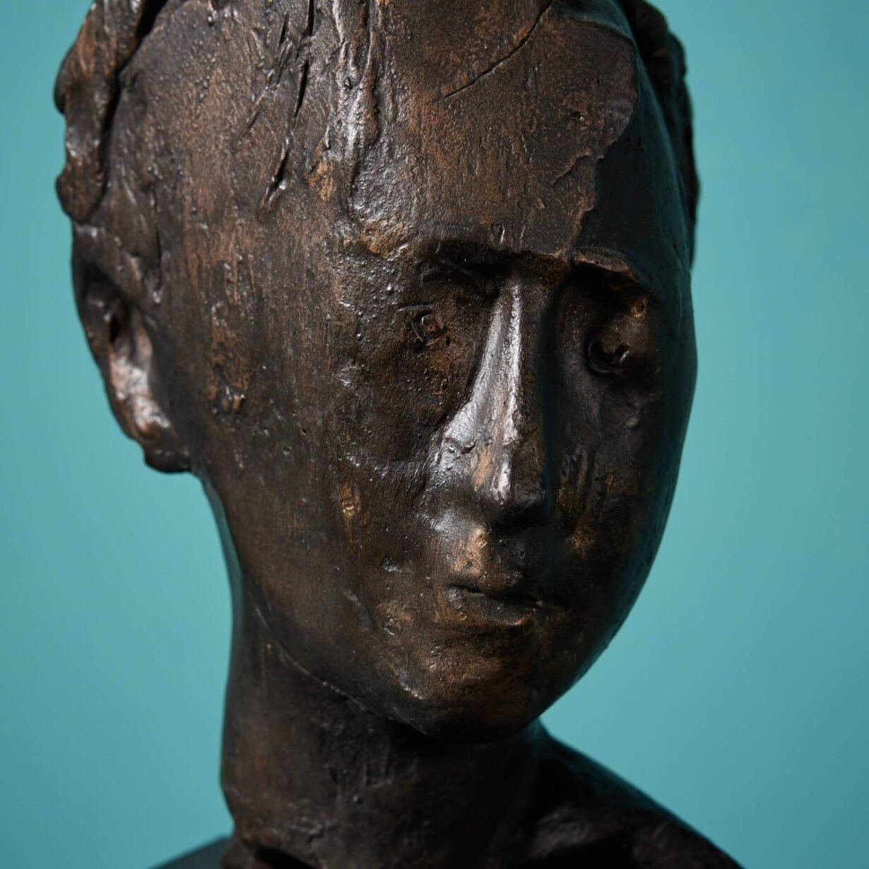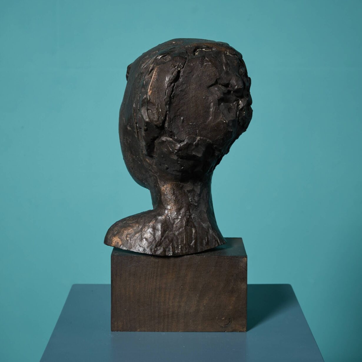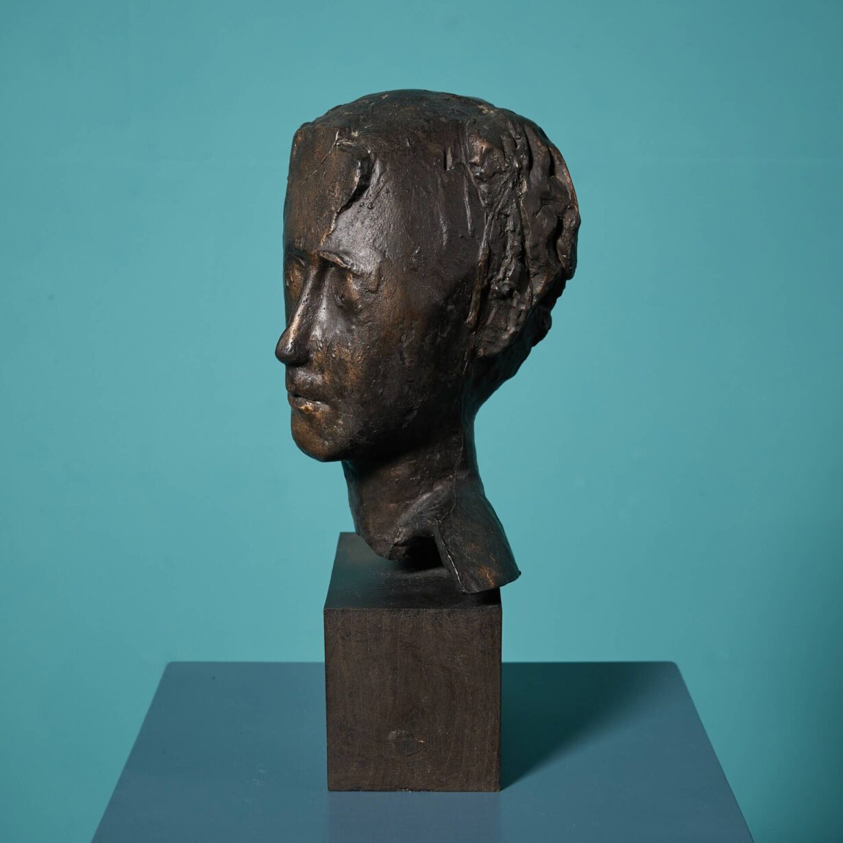 This freestanding, three-dimensional piece is one example of the sculptor’s more abstract works. Using unique maker’s marks showcased throughout the casting, the artist creates an impression of a male head in profile, with defined facial features and short hair, gazing to his left.
