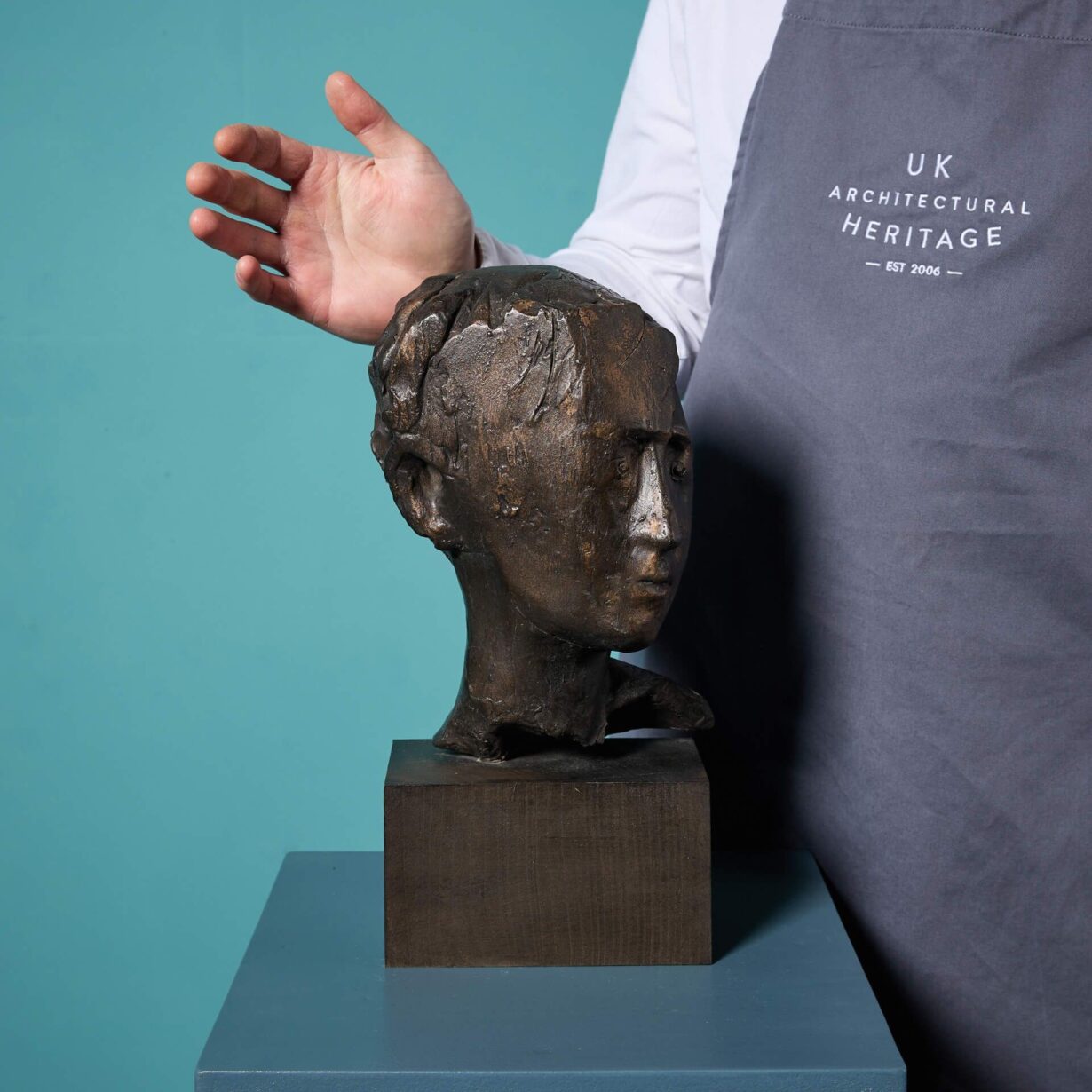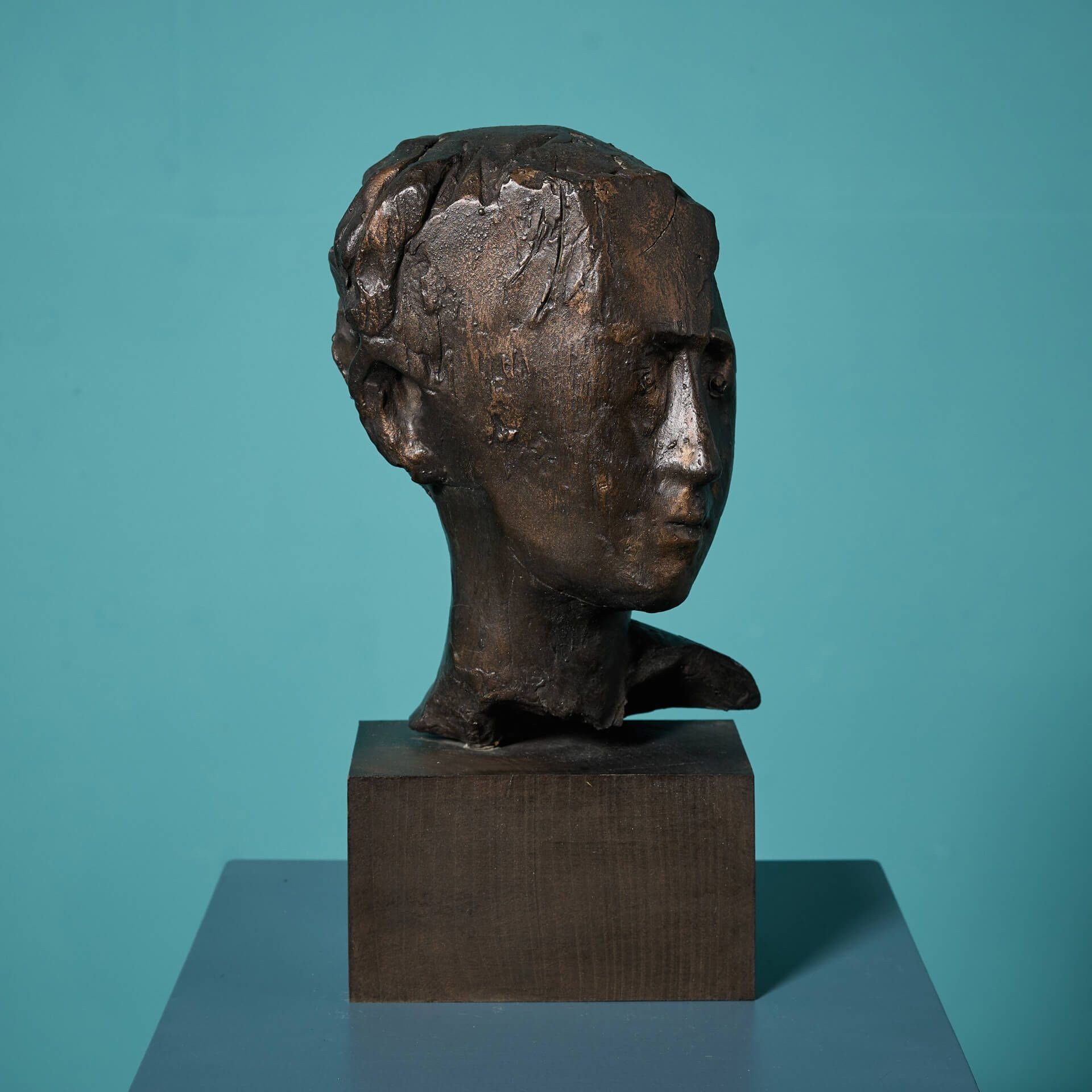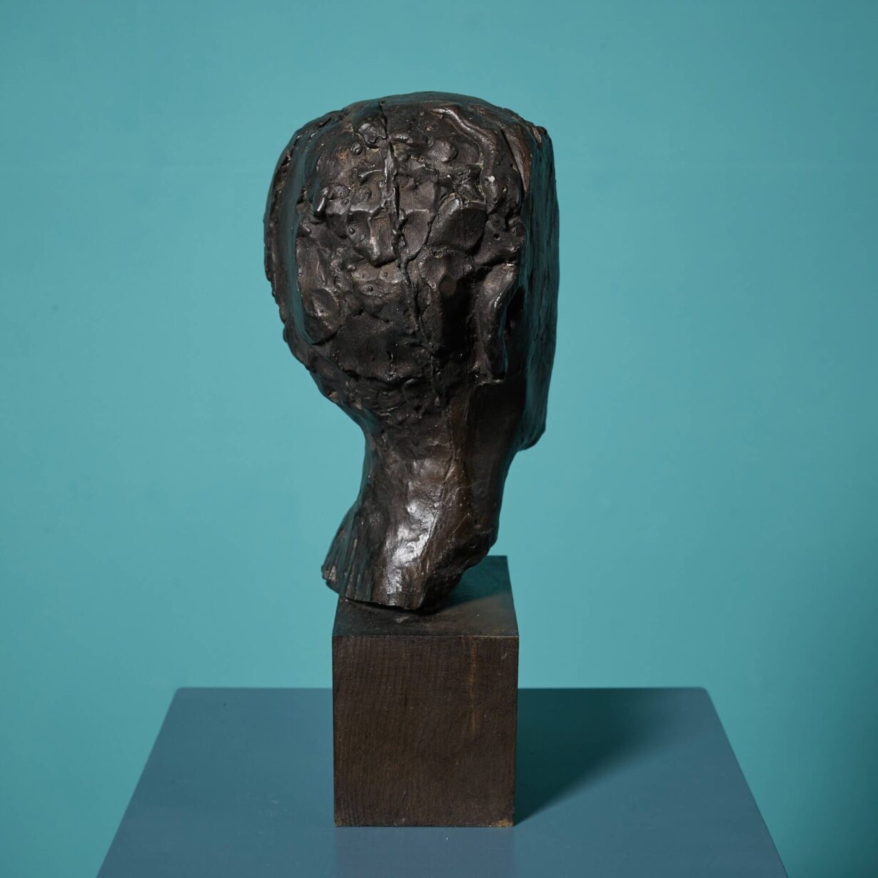 This freestanding, three-dimensional piece is one example of the sculptor’s more abstract works. Using unique maker’s marks showcased throughout the casting, the artist creates an impression of a male head in profile, with defined facial features and short hair, gazing to his left.