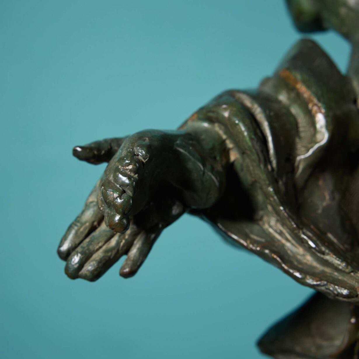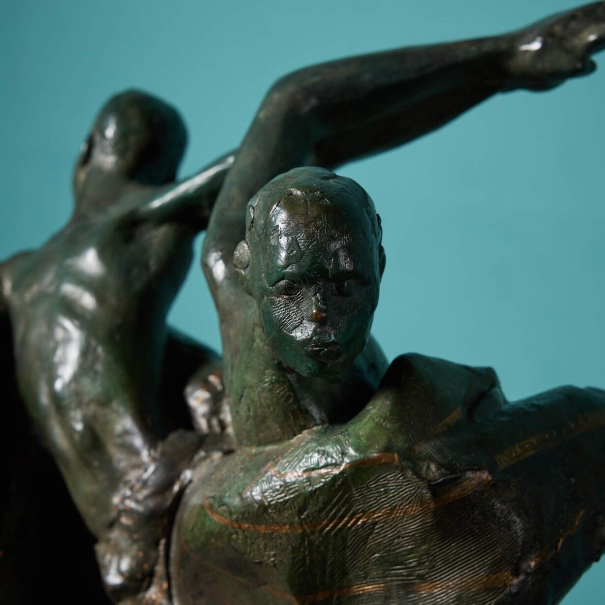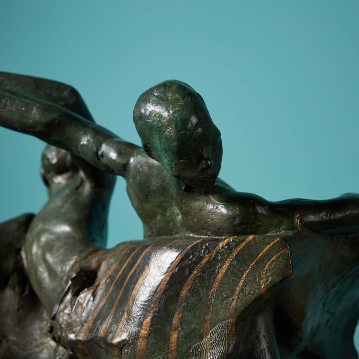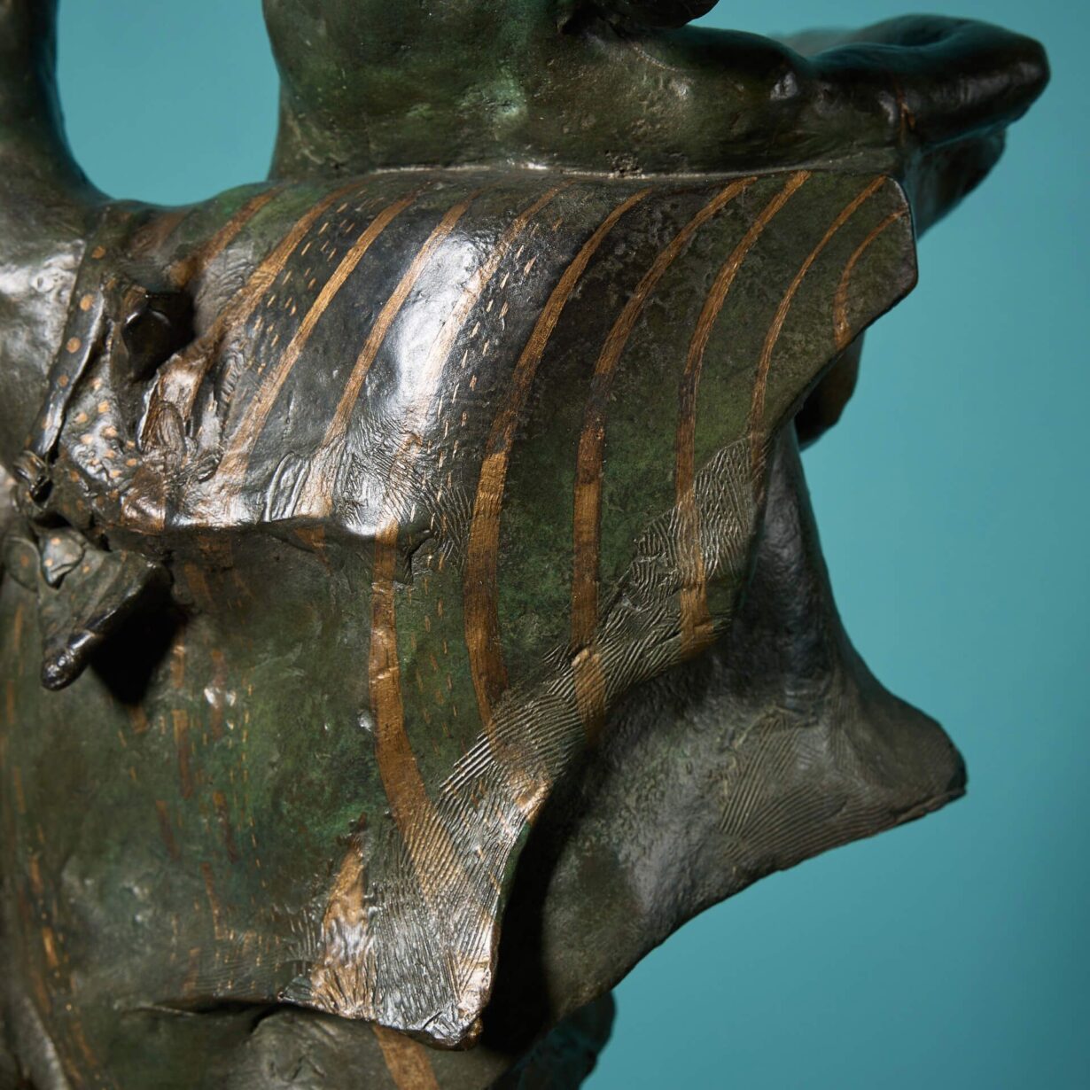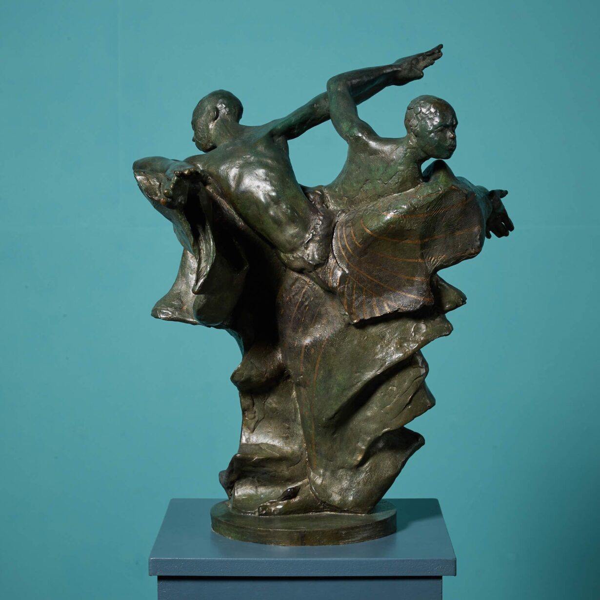 The verdigris patinated bronze finish creates a display of decorative lines and shapes adding texture and depth to the piece. An excellent sculptural display piece, intriguing and interesting from all angles.