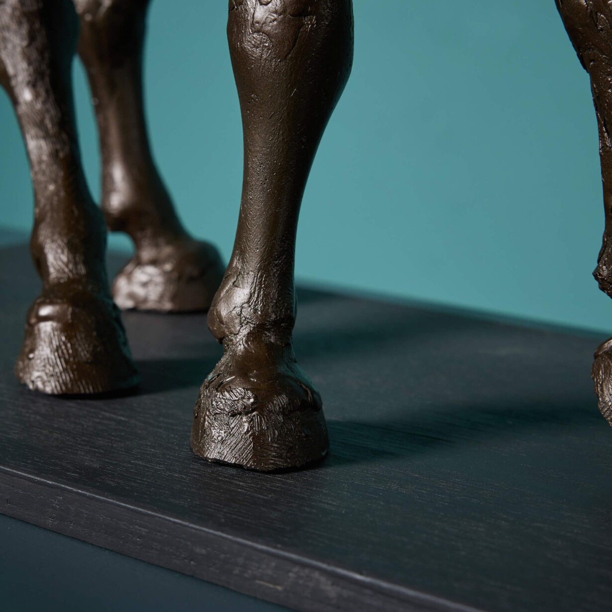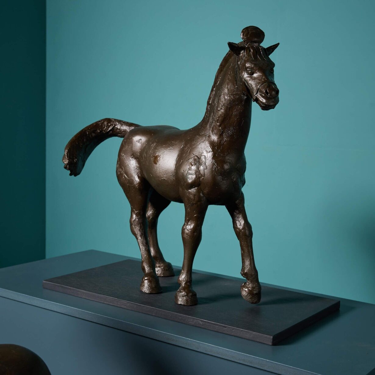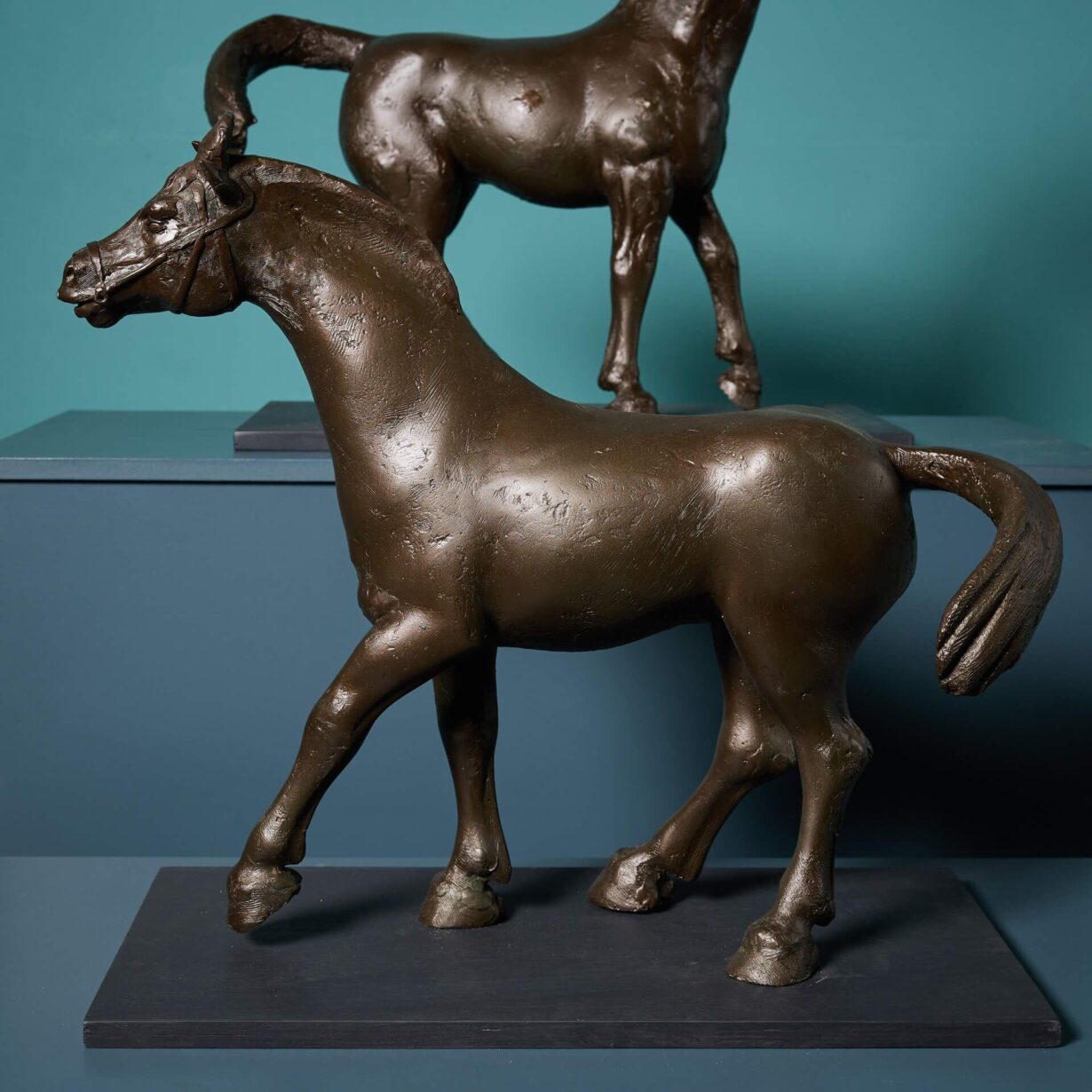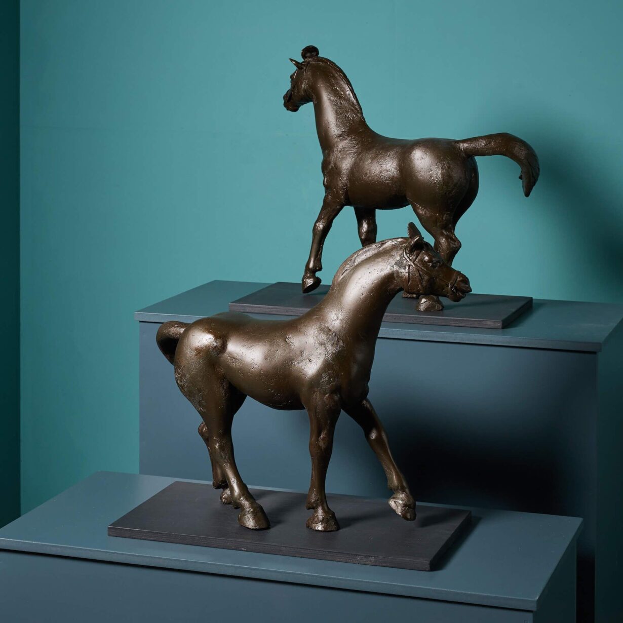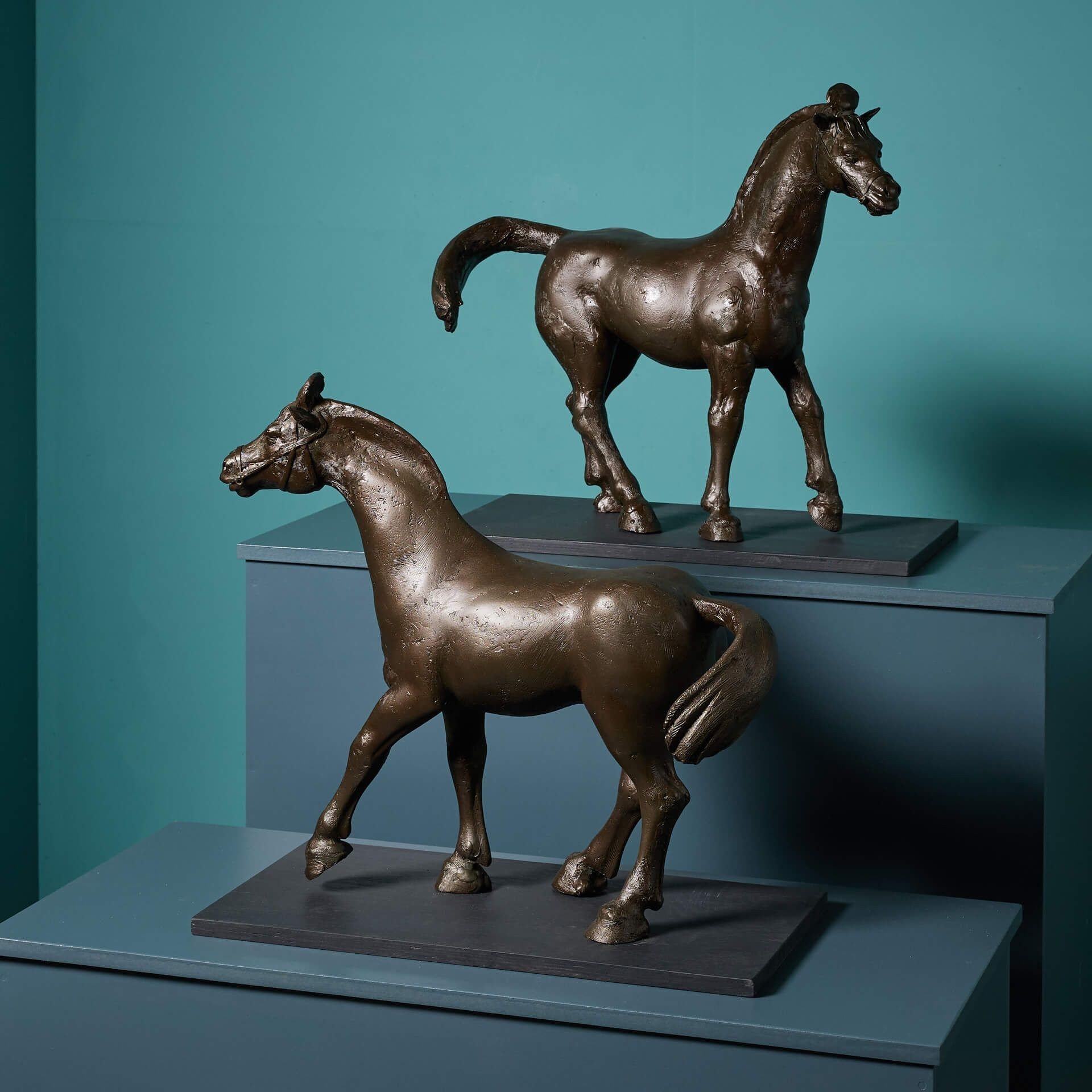 Also referred to as Chinese Dynamic style, these horse sculptures are depicted with one front leg and tails raised, evoking a sense of movement. Each is mounted onto a painted wooden base, ready for display as sculptural artwork pieces for an interior by a world-renowned artist.