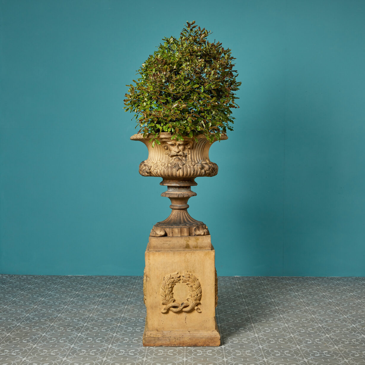 back to topAn intricately crafted and beautifully preserved large terracotta garden urn by Joseph Cliff & Sons, circa 1890. Standing proudly on a plinth, it looks striking amongst the gardens or courtyard of a country estate, the design instilling a sense of grandeur and majesty. It has a pale yellow colour and is highly detailed, decorated with a mysterious bearded mask on two sides, shell embellishments and wreaths to the base. Whether planted with flowers or used alone, this antique terracotta urn is a handsome object of statuary for traditionally styled gardens.