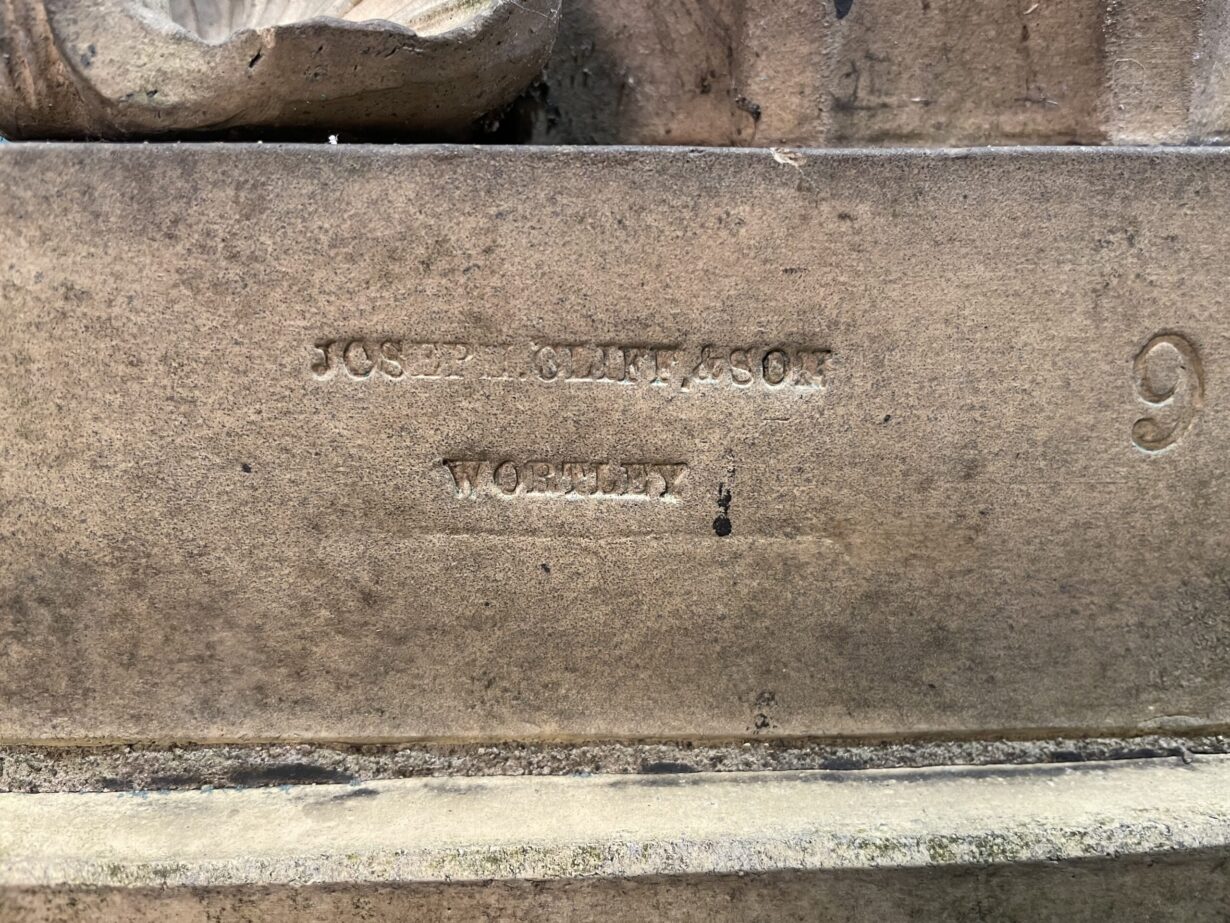 This antique terracotta urn is stamped with a marker’s mark reading ‘Joseph & Son, Wortley’. Established in 1795, Joseph Cliff & Son’s Fire Clay Works were renowned brick and pipe makers of the period, based in Upper Wortley, Leeds. In later years, the company extended their range, making porcelain baths, sinks and lavatories as well as stoneware and architectural terracotta, forming a branch of the Leeds Fire Clay Company (LEFCO).