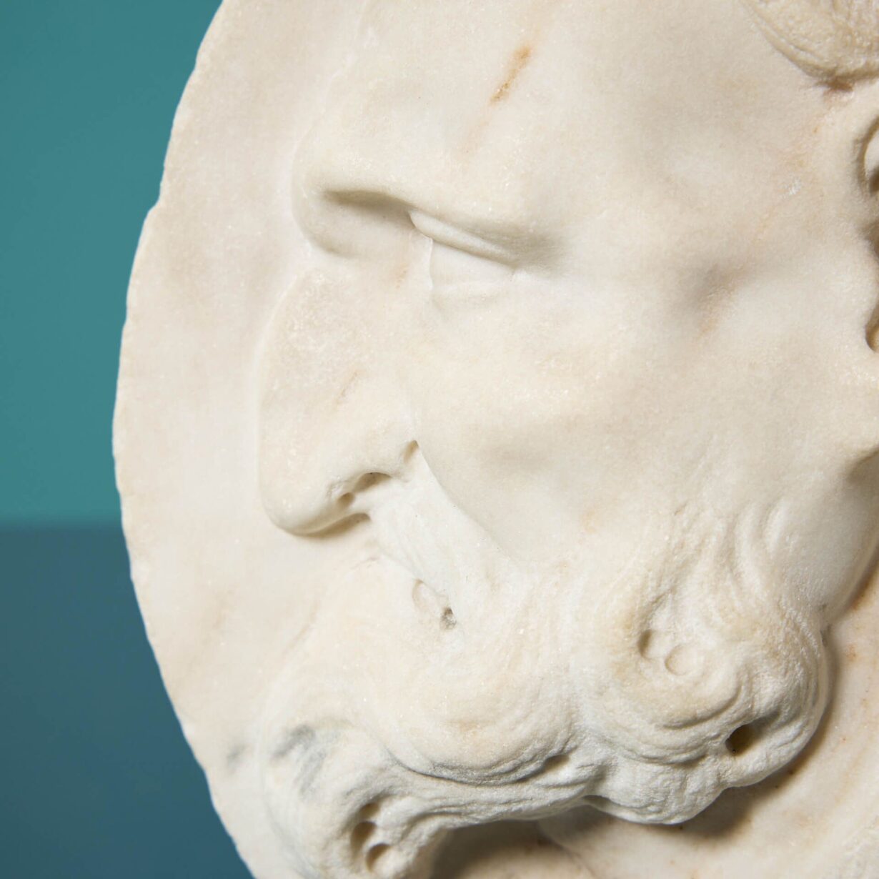 One of two similar marble medallions we are selling, this piece is handcarved with a profile portrait of a bearded neoclassical gentleman wearing a cap and gazing to the left.
