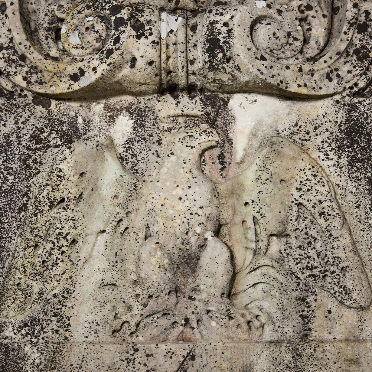 This large scale architectural crest bears the Arengo family coat of arms, depicting an eagle with wings spread atop a diagonal stripe crest with two stars, between two cornucopias and a scrolling acanthus top.