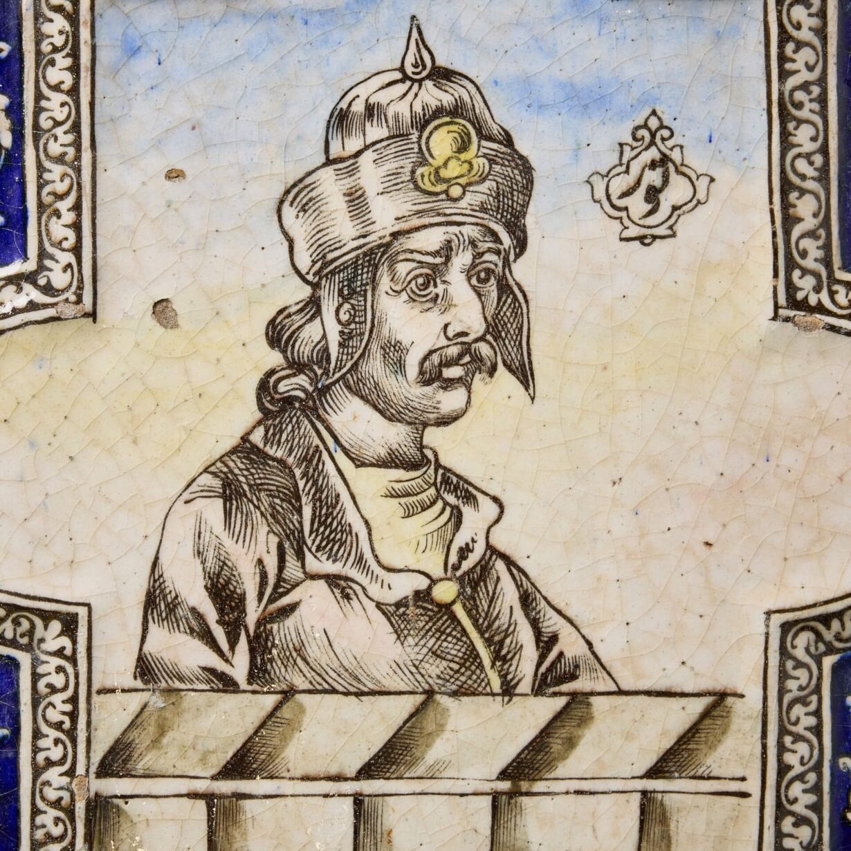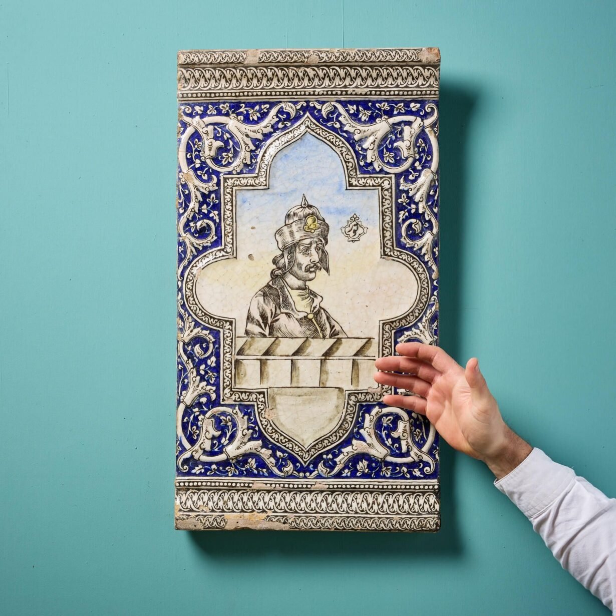 In a large scale painted with a depiction of a Persian prince within a shaped cartouche flanked by scrolling foliage and vines.