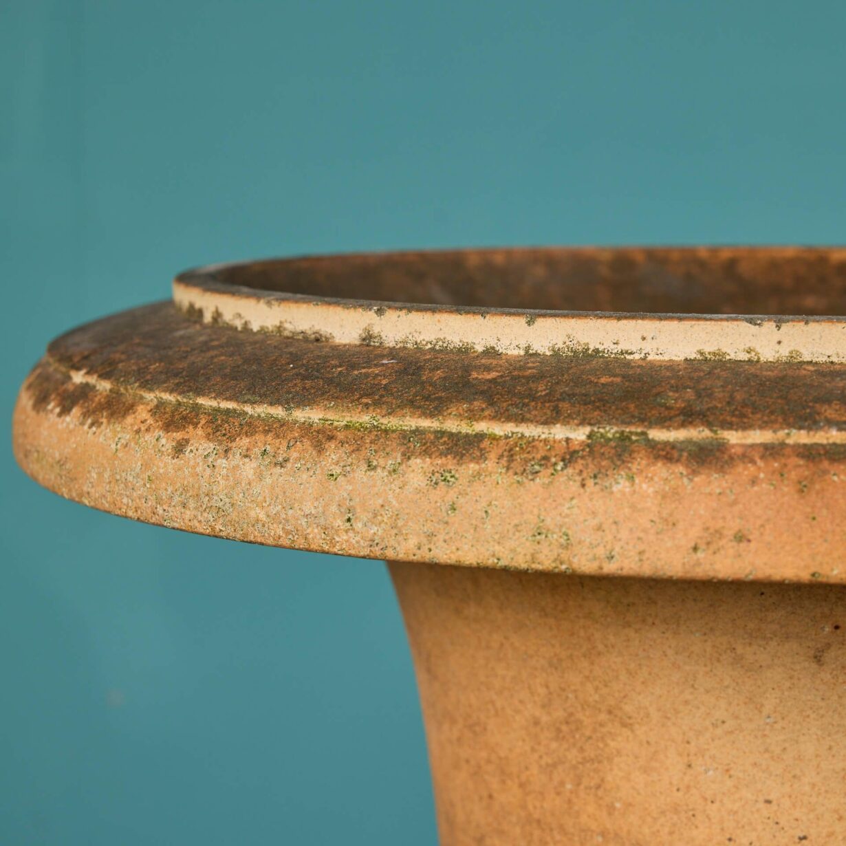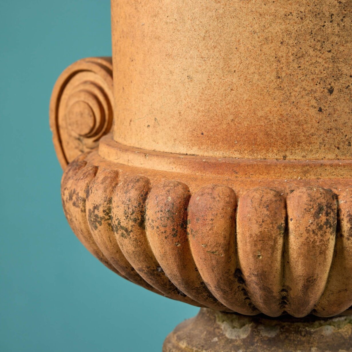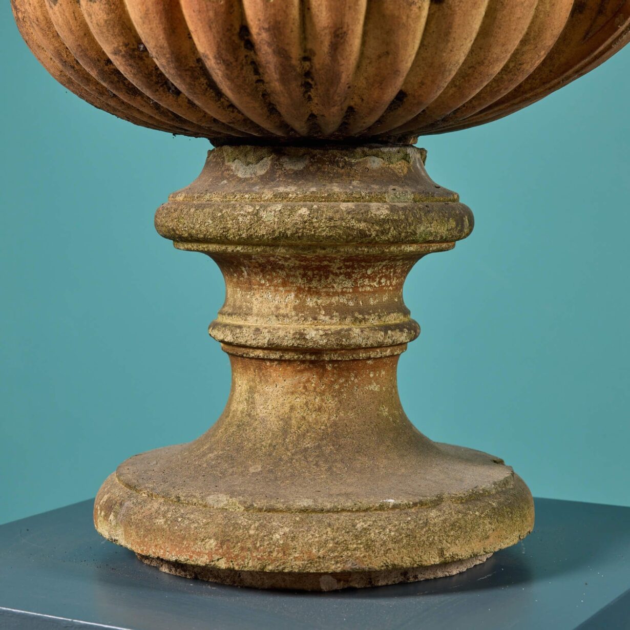 Circa 1860, this large campana urn features characteristic weathering and a rich buff terracotta colour that stands out as the centrepiece of any garden. In classic campana form, it features gadrooned detail above a socle base with striking flared urn above, ornamented with a pair of scrolling handles.