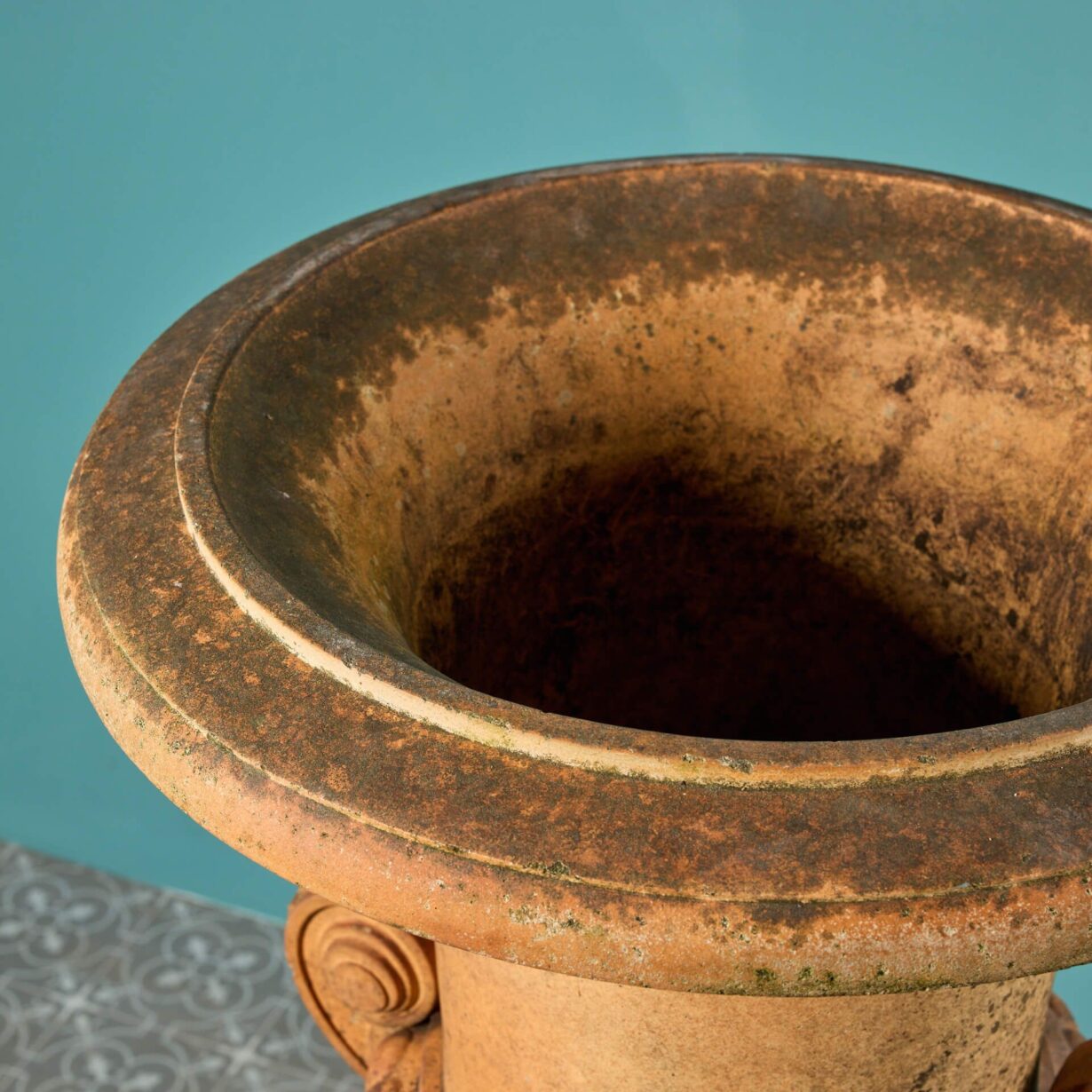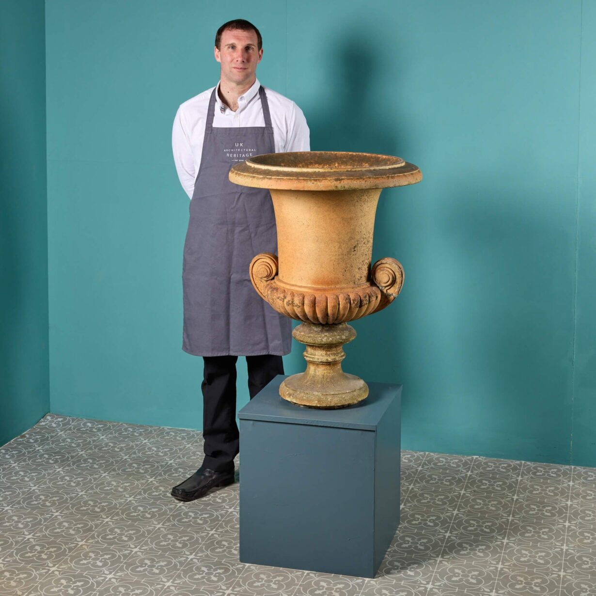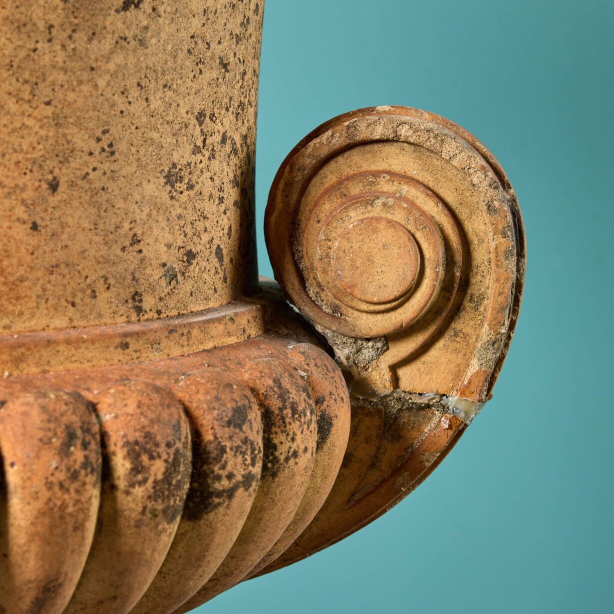 Circa 1860, this large campana urn features characteristic weathering and a rich buff terracotta colour that stands out as the centrepiece of any garden. In classic campana form, it features gadrooned detail above a socle base with striking flared urn above, ornamented with a pair of scrolling handles.