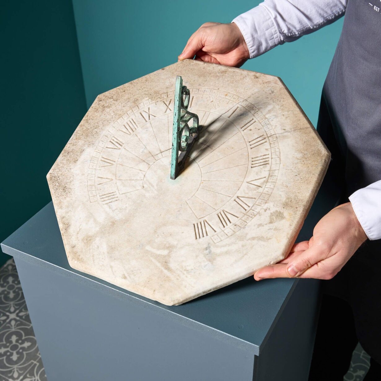 back to topA large antique Carrara marble sundial plate with a bronze gnomon, dating from the mid 19th century.
