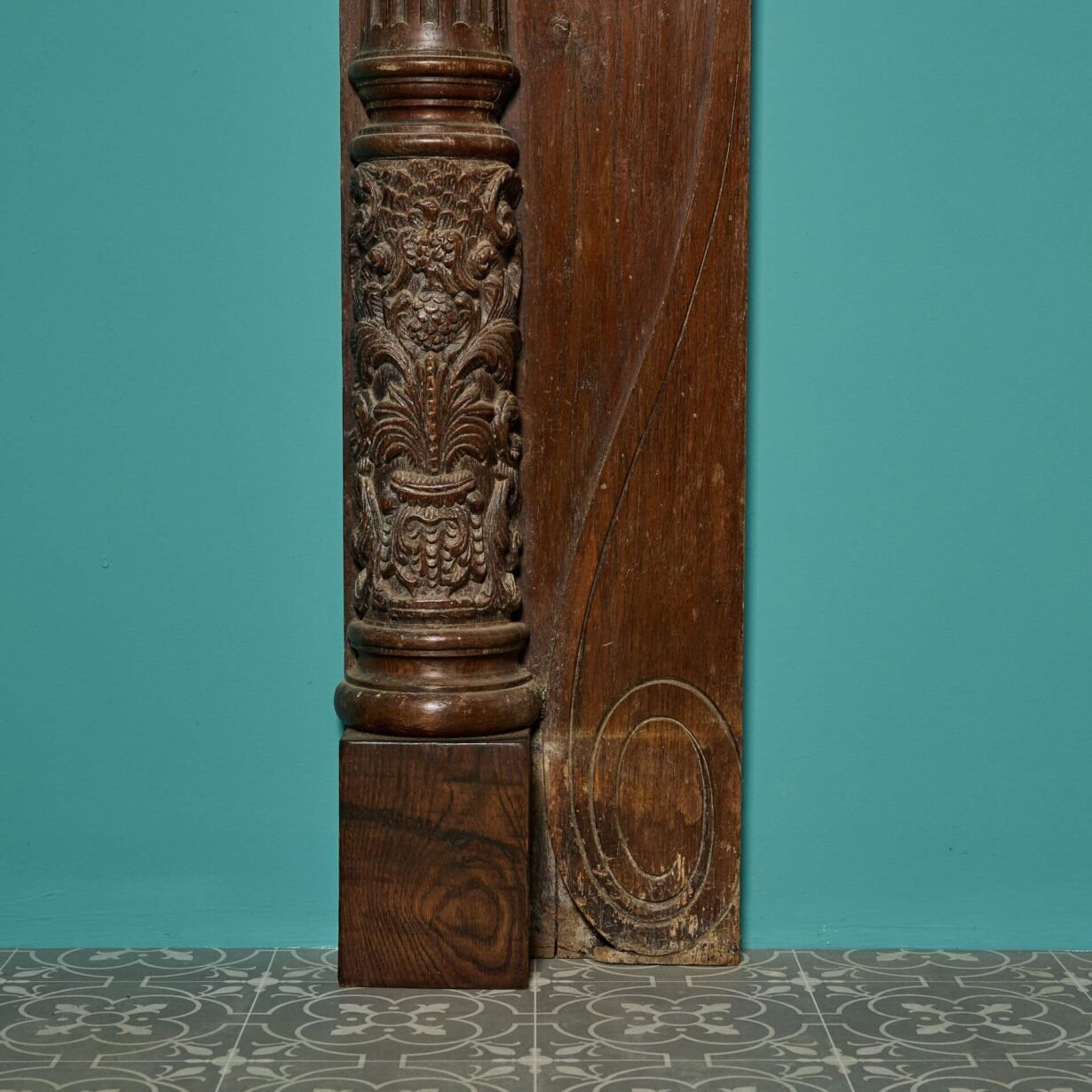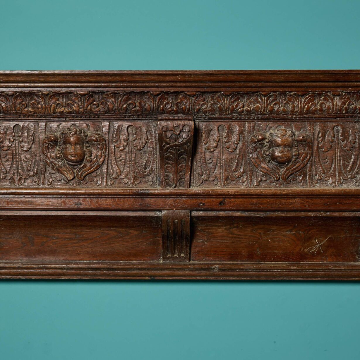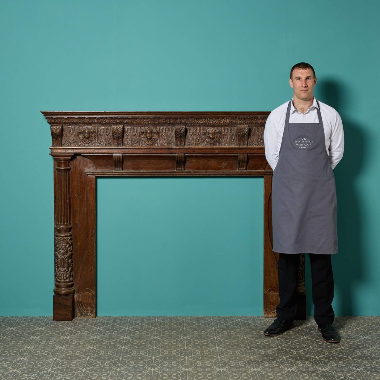 back to topA large antique English carved oak fire surround dating to around 1860, utilising earlier, possibly 16th and 17th century parts. This fire surround was reclaimed from a property in Malvern, Worcestershire.