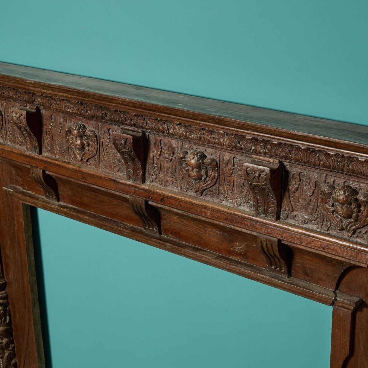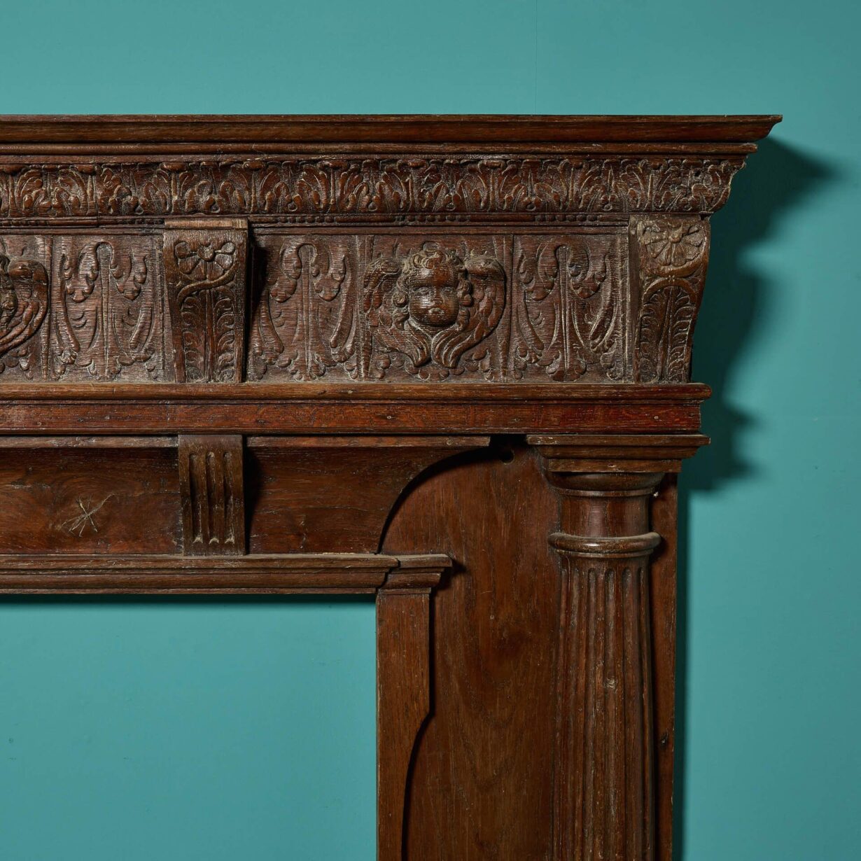 Ornately carved, this antique oak fireplace has a beautiful rich wood colour that will make a handsome feature of traditional country cottages and period style townhouses alike. The frieze is most decorative, carved with corbels, foliage and masks of winged putti, paired with elaborately carved column-style jambs, and large scrolls around the opening.