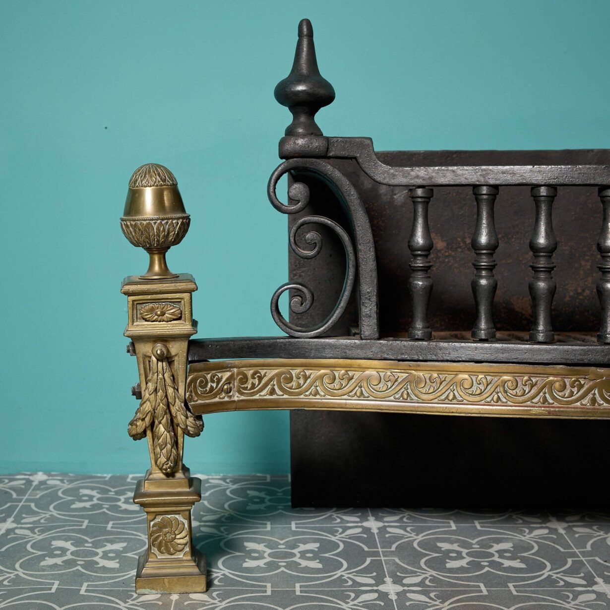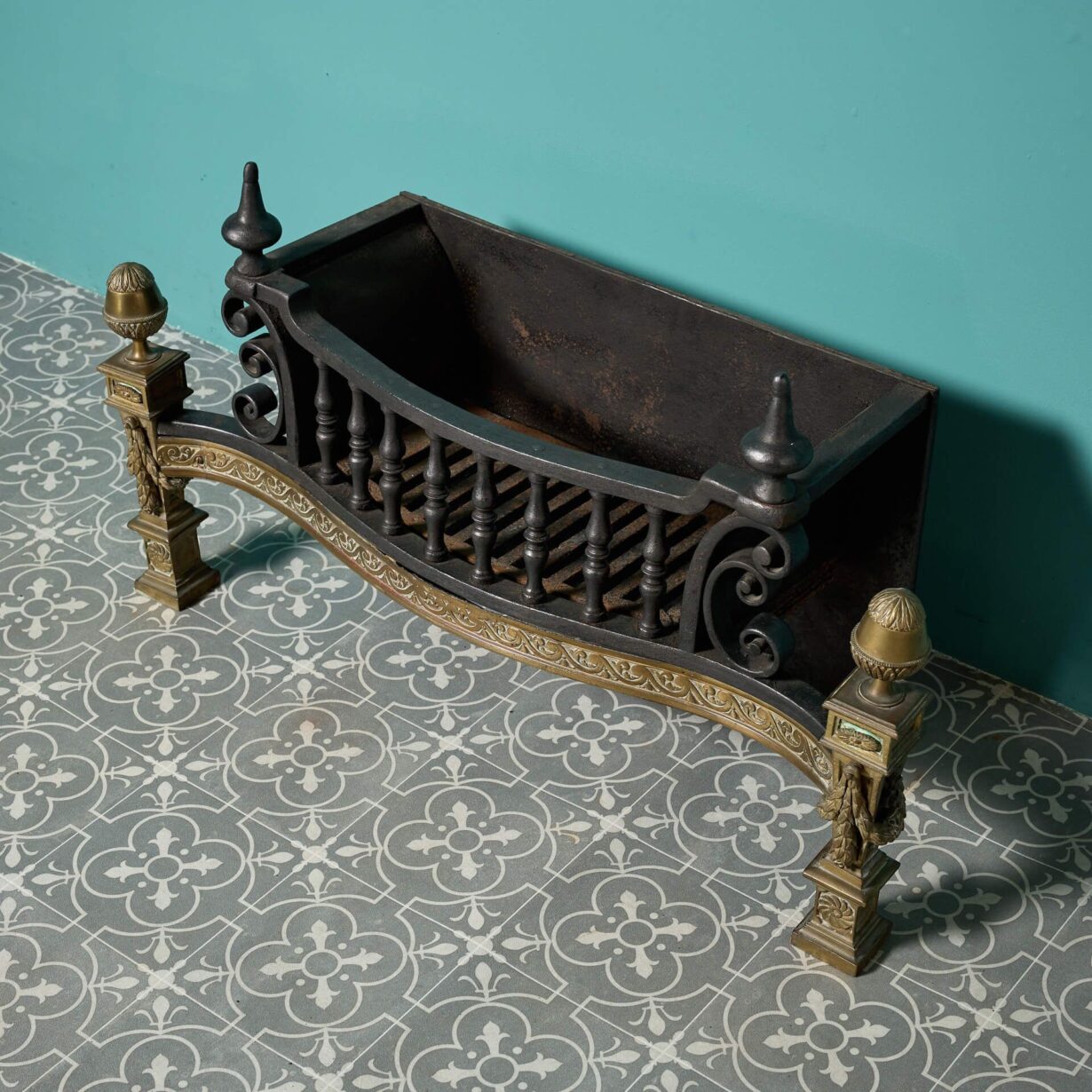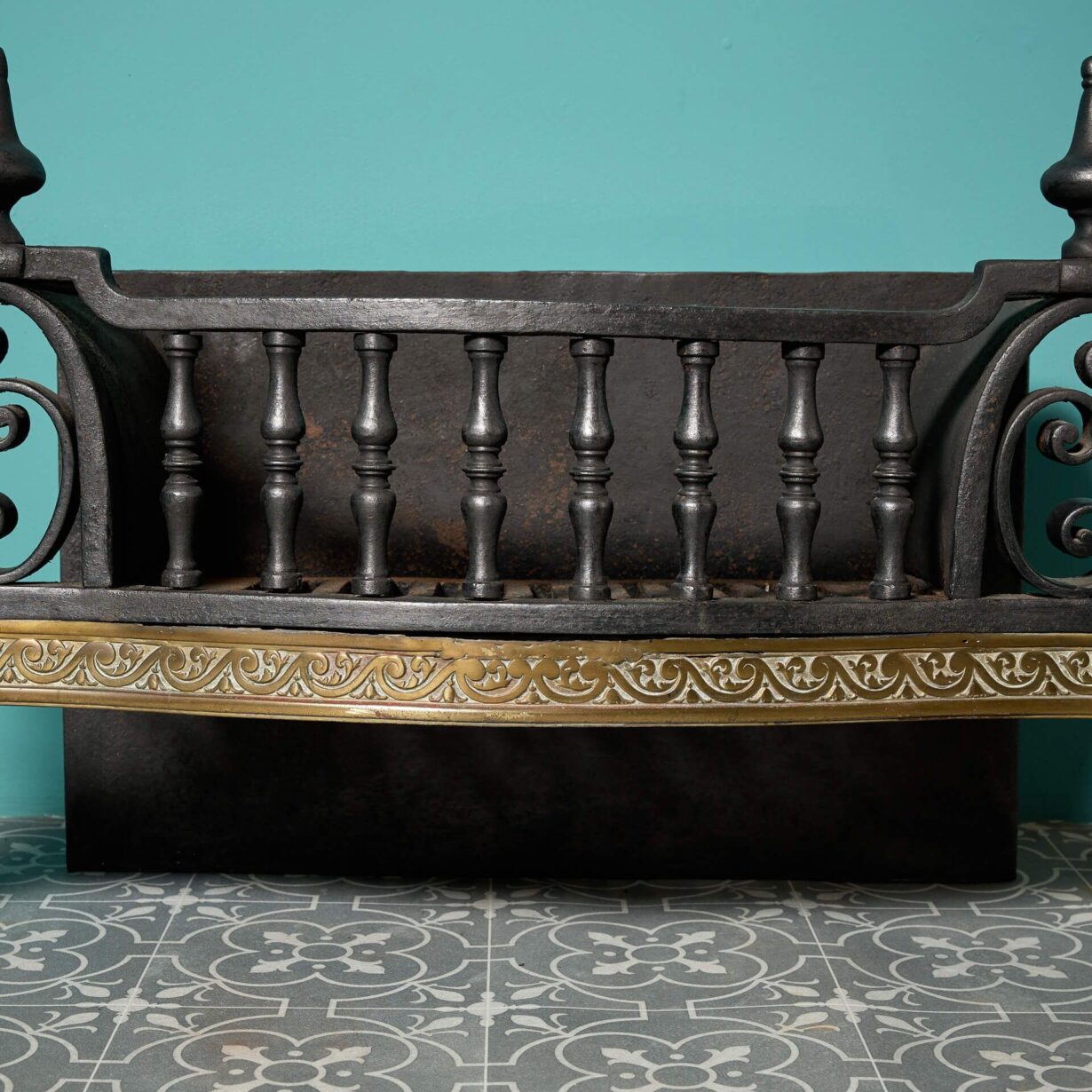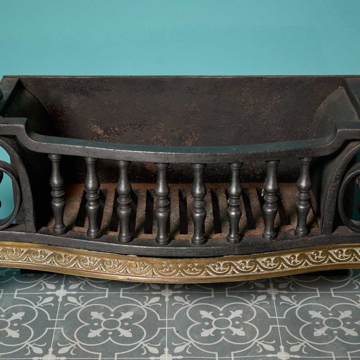 back to topAn antique cast iron fire grate with highly decorative brass and wrought iron decoration.