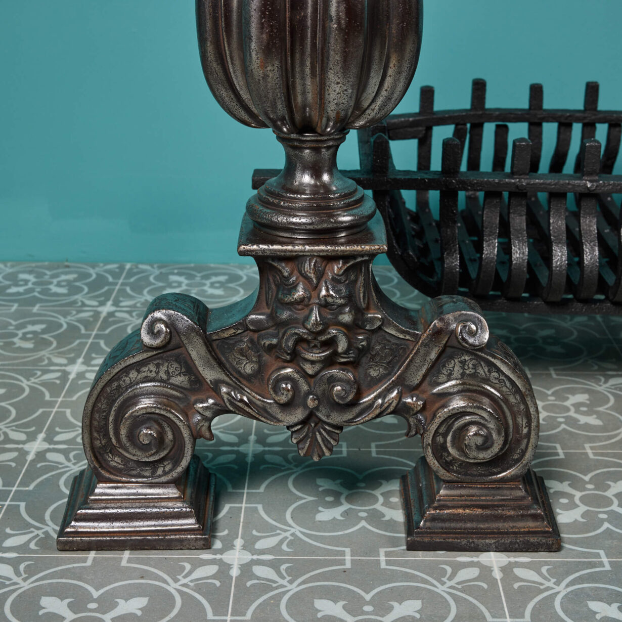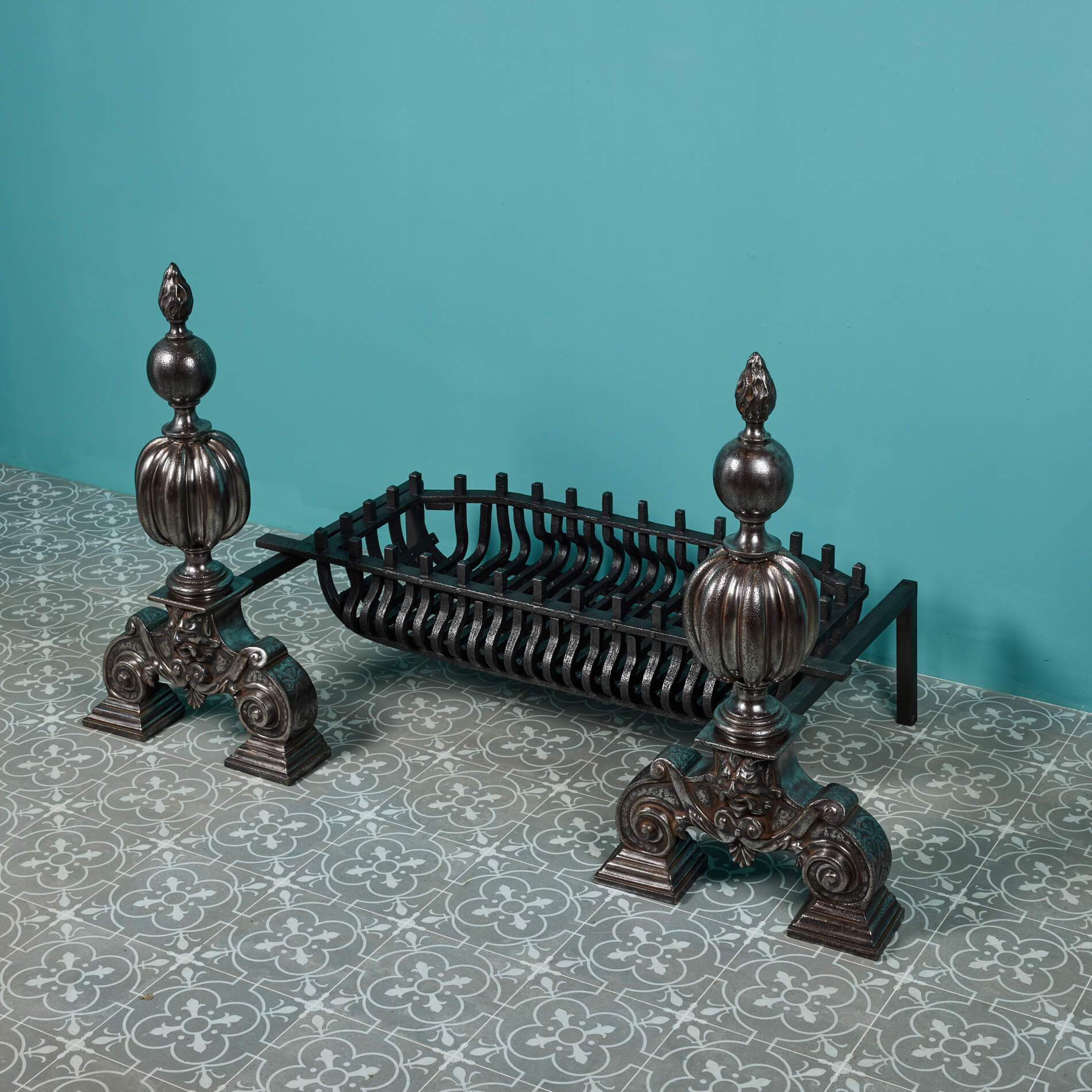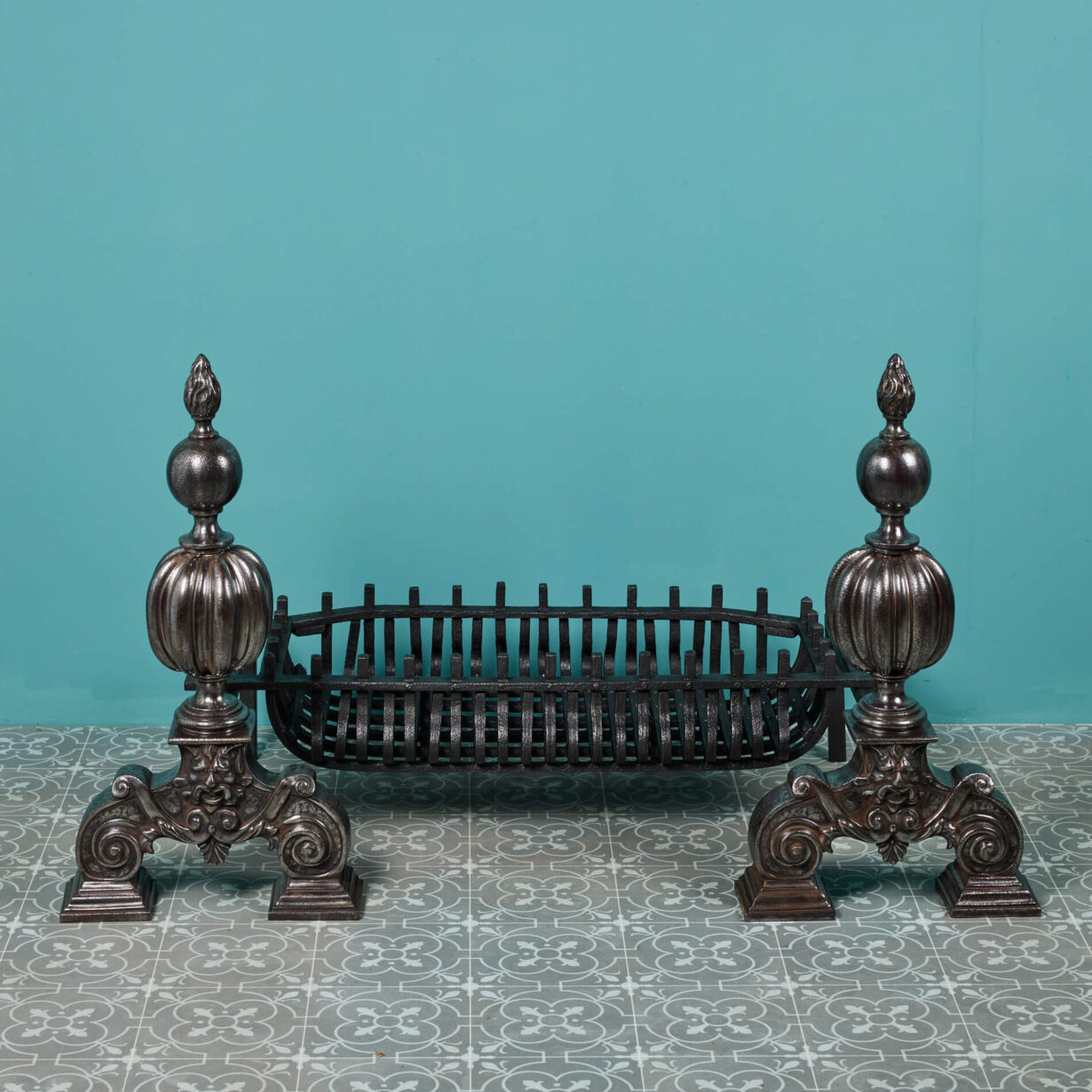 The grate is simply designed for style and purpose, finished with a black graphite polish and made in a wide basket shape to house the warm embers and heat of the fire. But it is the Victorian fire dogs that are the showpiece of this large fire grate. Cast in iron with a polished patina, the dogs follow a popular Victorian globe design, detailed with flame finials to the top and a grotesque mask to the scrolling feet that give a distinctly baroque look. Together, the fire dogs and basket make for a spectacular fireplace piece that encompasses both function and Victorian beauty.