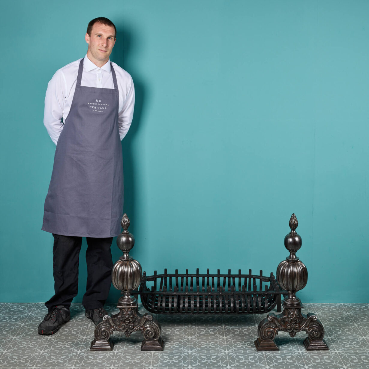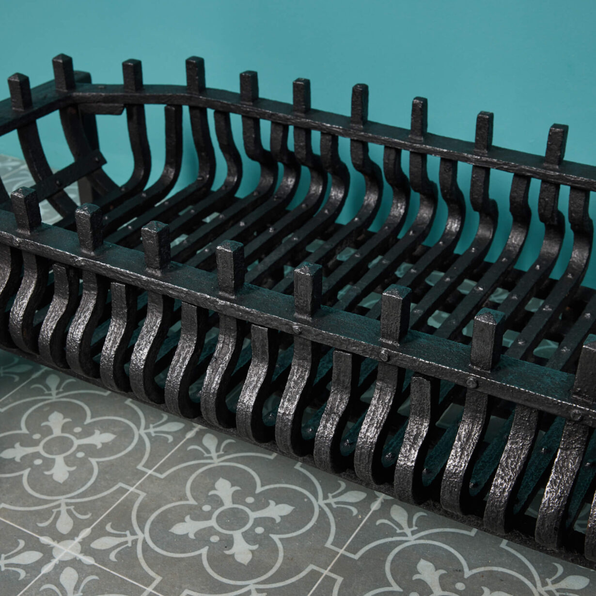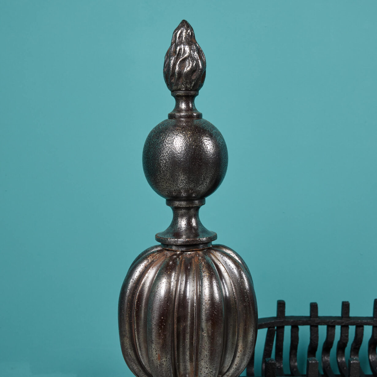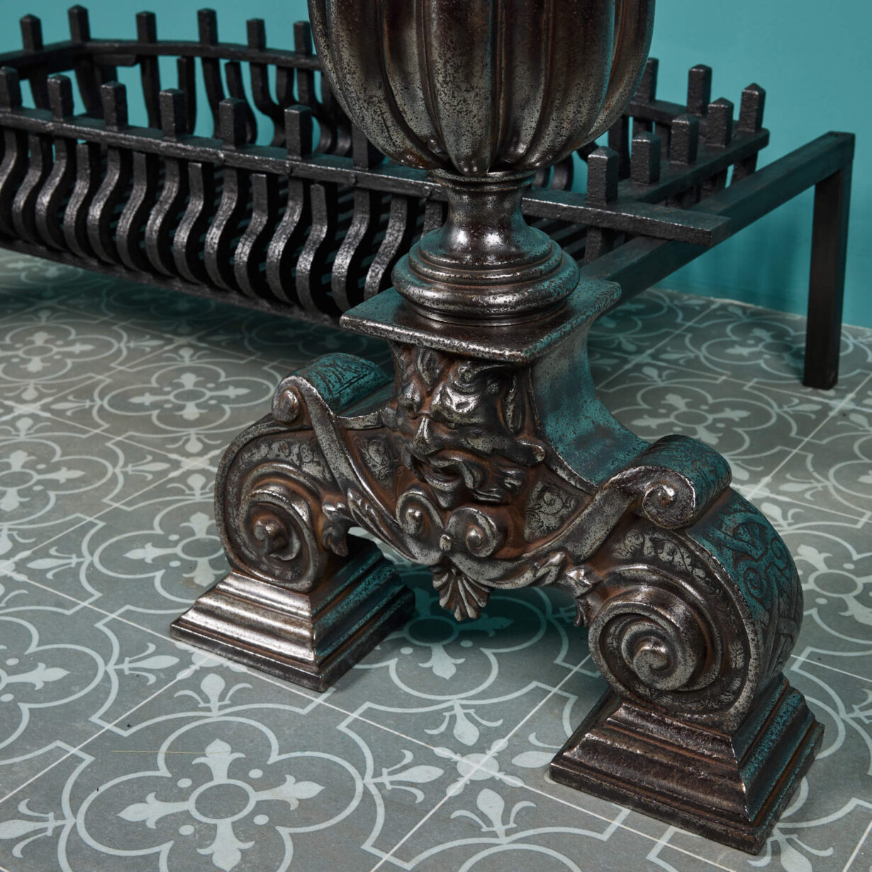 The grate is simply designed for style and purpose, finished with a black graphite polish and made in a wide basket shape to house the warm embers and heat of the fire. But it is the Victorian fire dogs that are the showpiece of this large fire grate. Cast in iron with a polished patina, the dogs follow a popular Victorian globe design, detailed with flame finials to the top and a grotesque mask to the scrolling feet that give a distinctly baroque look. Together, the fire dogs and basket make for a spectacular fireplace piece that encompasses both function and Victorian beauty.