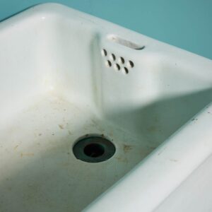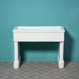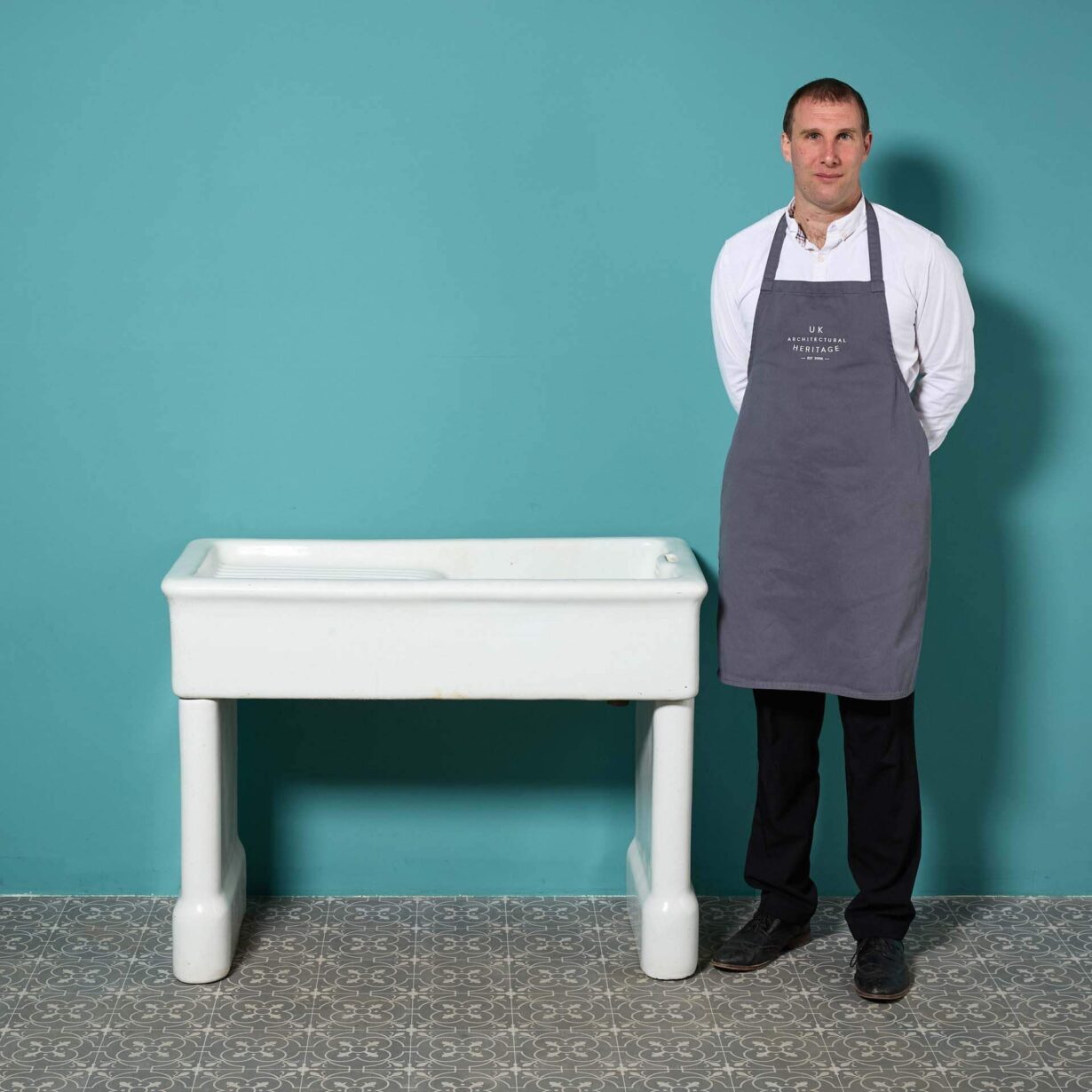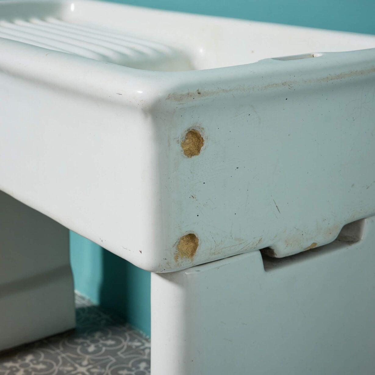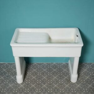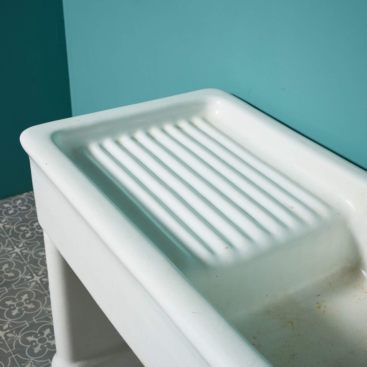 back to topA large antique glazed stoneware Belfast sink with drainer on two matching legs – a handsome addition to a contemporary country style utility, traditional boot room or farmhouse kitchen!