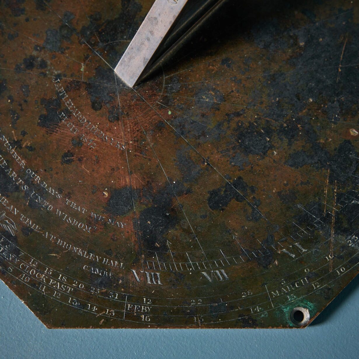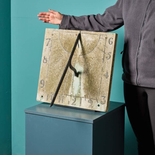 Made in bronze, this horizontal sundial plate has stood the test of time for over 150 years. Though weathered with a natural patina, the sundial’s intricate engraving is still clear and distinguishable, telling the story of an old English country house: