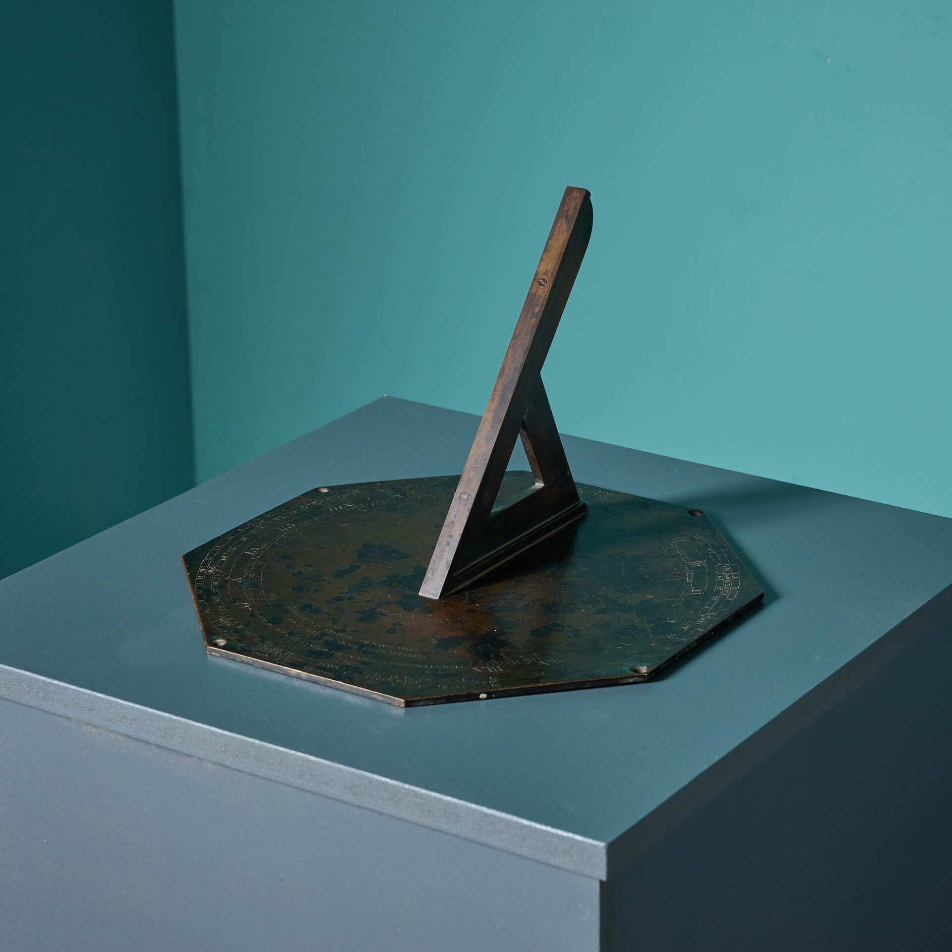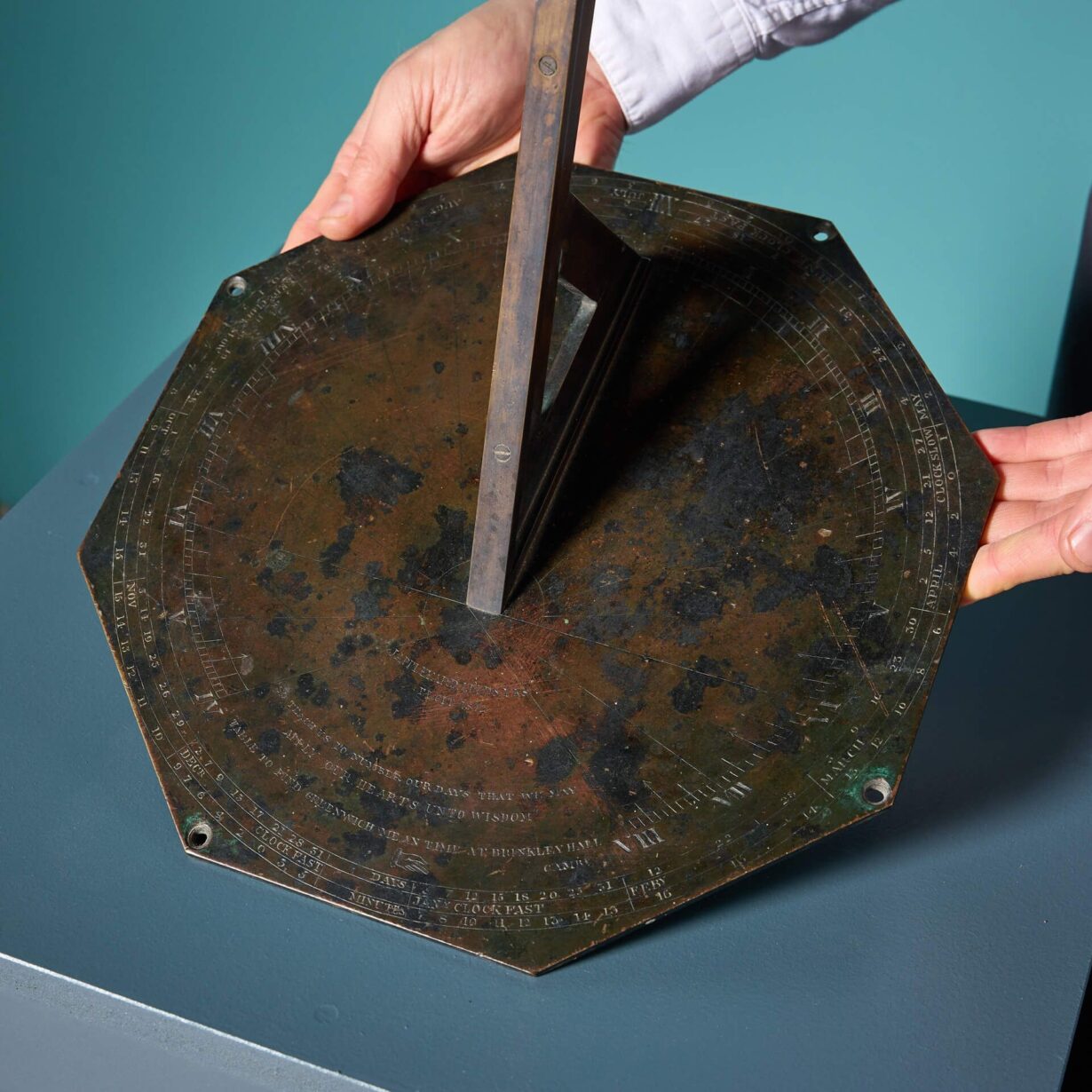 back to topA large antique octagonal bronze sundial inscribed ‘J. Appleyard, Leeds,1872’, originally from Brinkley Hall, Cambridge, a Grade II listed building with origins dating back to the late 18th century.