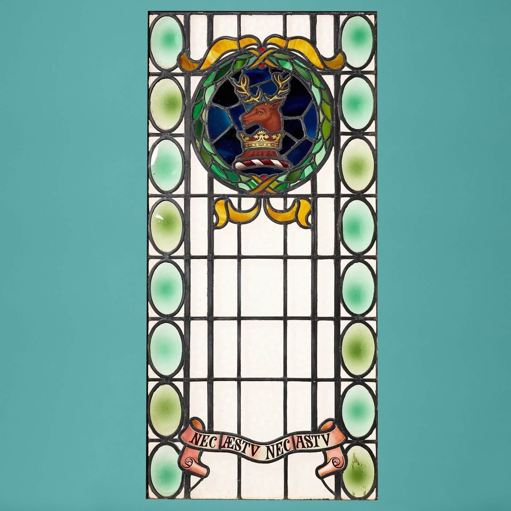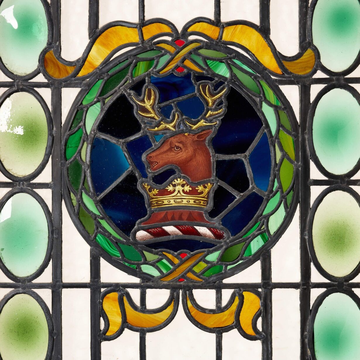 back to topA large antique stained glass window of a crest depicting a stag in a wreath. Dating to circa 1900, this large panel exhibits vibrant handprinted colours. Pale green oval domes sit on top of the clear textured background.