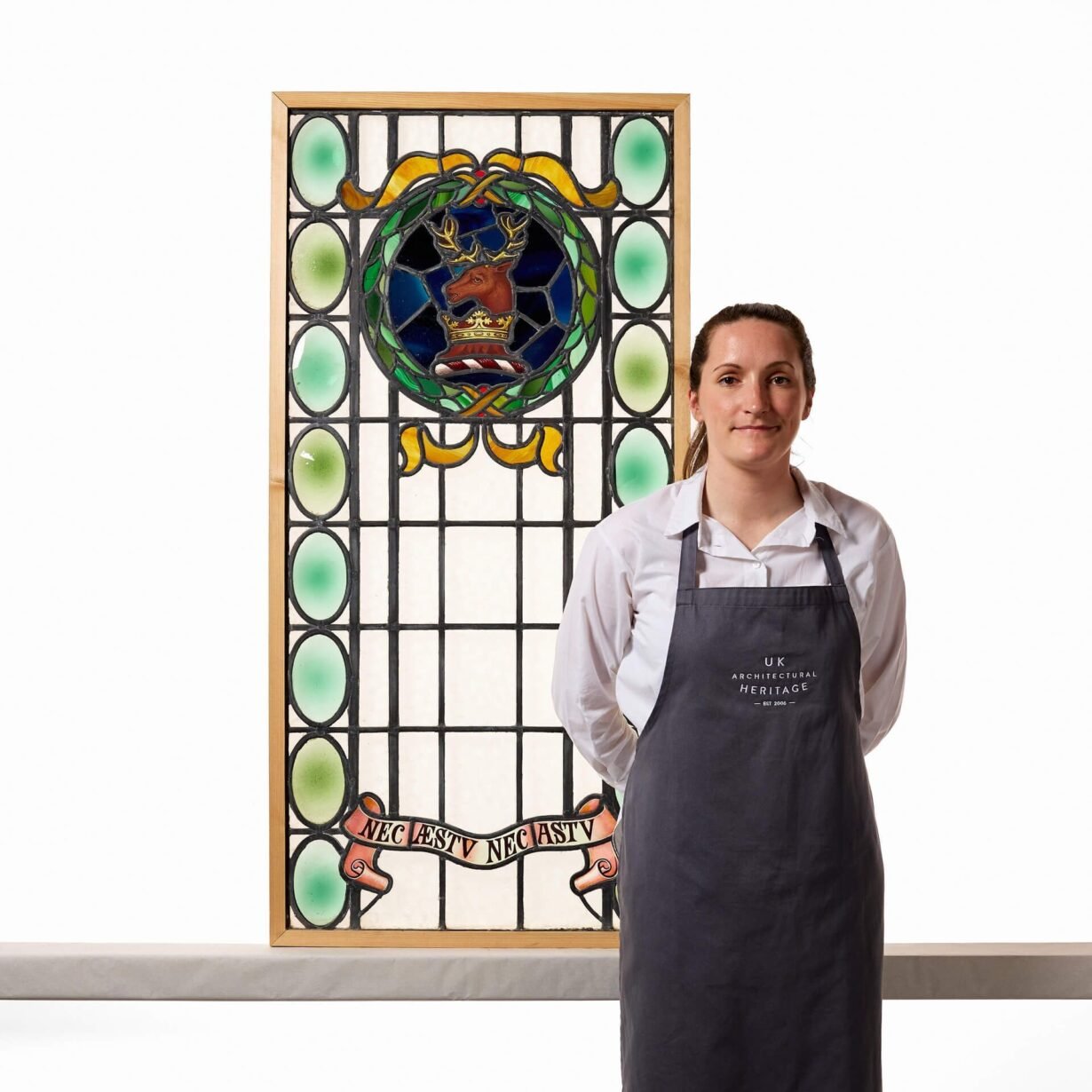 Currently housed in a temporary pine frame – the overall dimensions are for the stained glass only, not the frame.