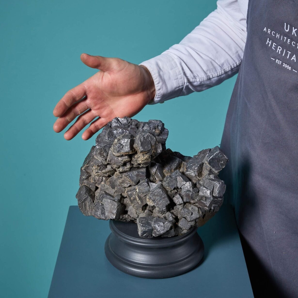 Known for its grey colour with metallic lustre highlights, galena is the primary ore of lead. This large-scale specimen is naturally occurring with formations unique to this piece, making a striking sculptural display piece or collector’s item.