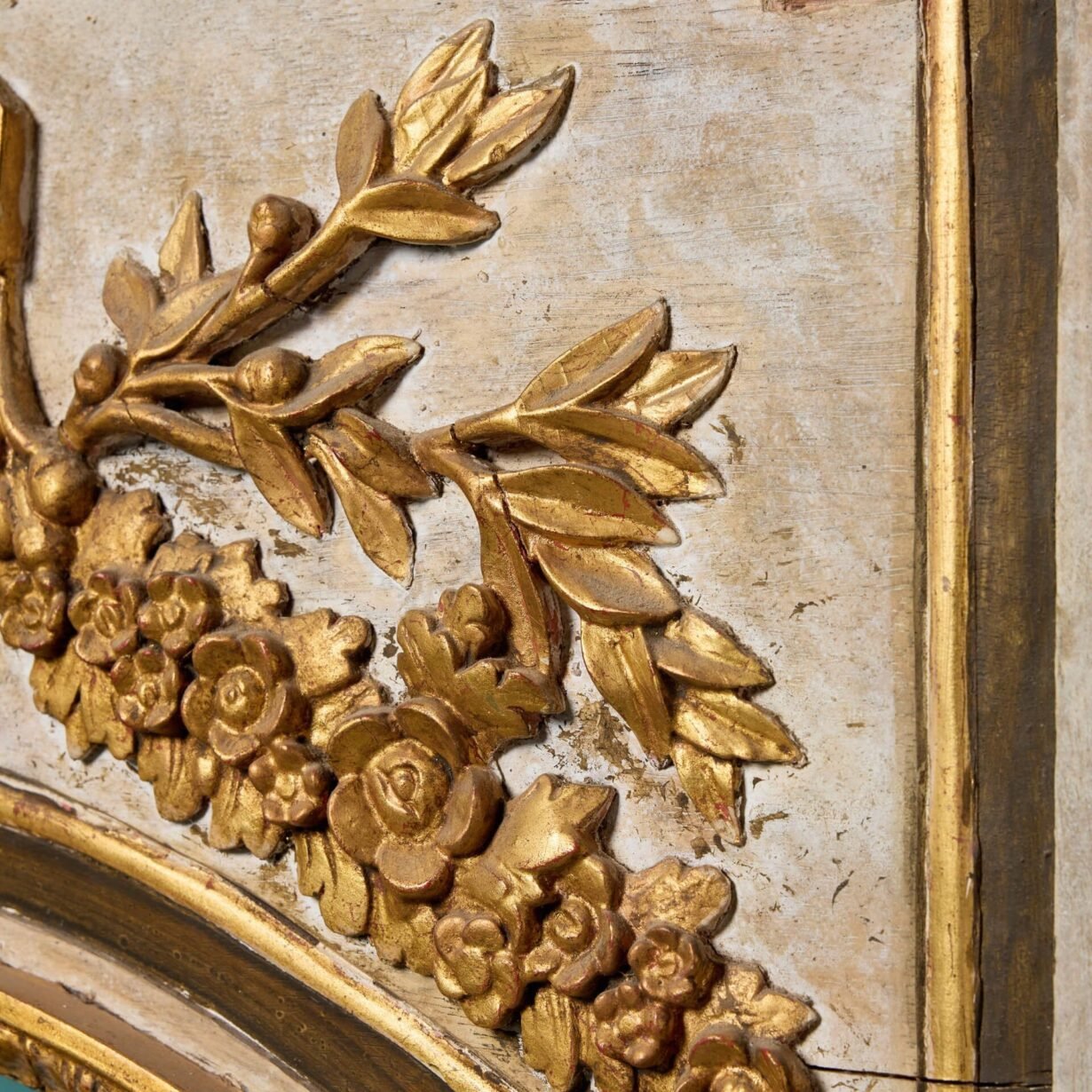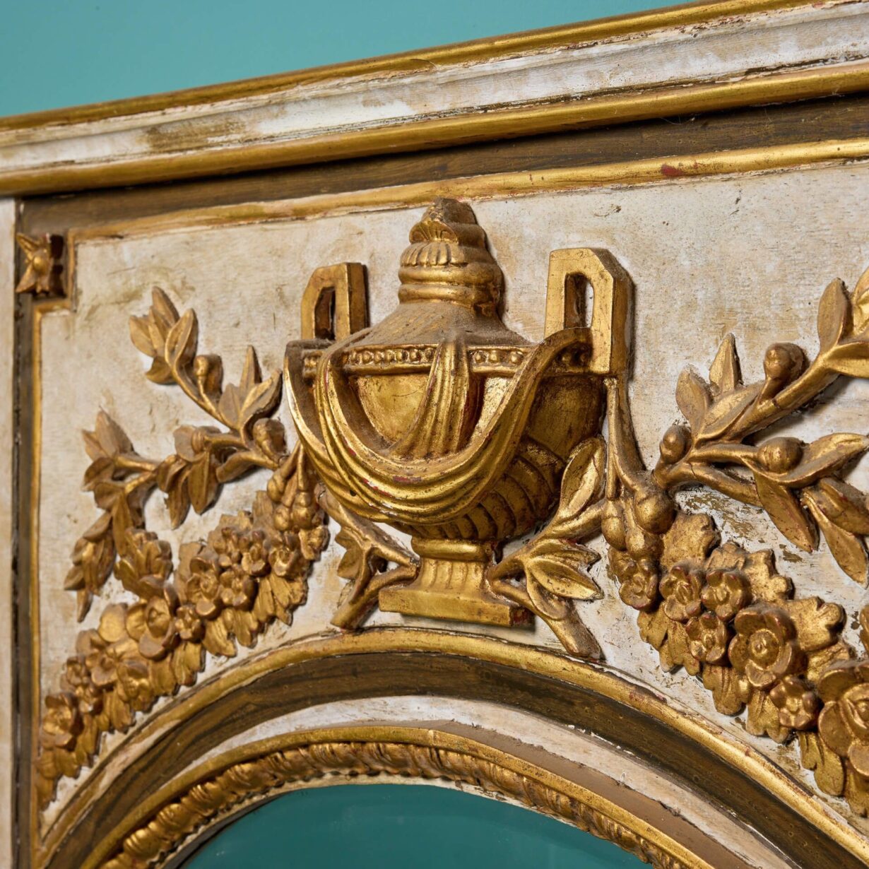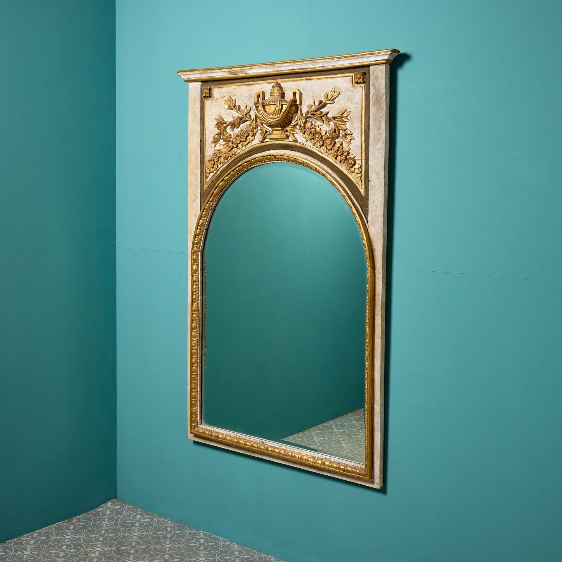 back to topAn elaborately decorated large carved, gilded French pier mirror circa 1870. This statement antique wall mirror has a French trumeau look, featuring an arched bevelled glass mirror below a deeply carved gilt urn in high relief flanked by floral garlands. The walnut frame has a painted polychrome finish, highlighting the striking gold hue of the gilding to bring grandeur to any interior setting.