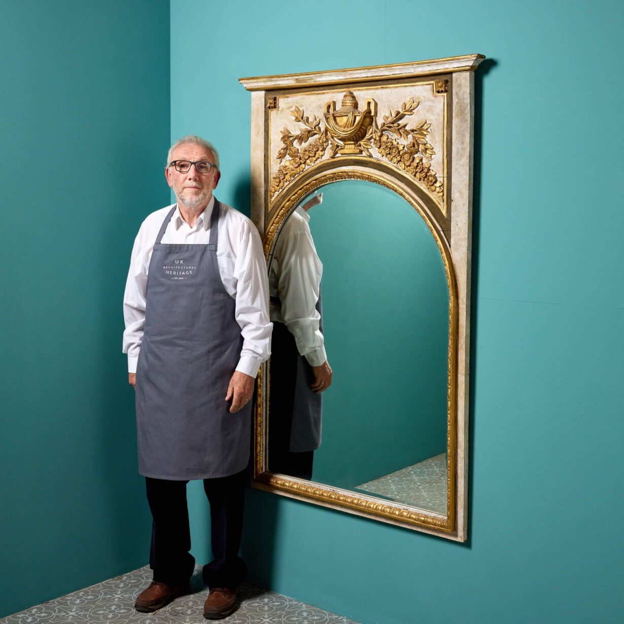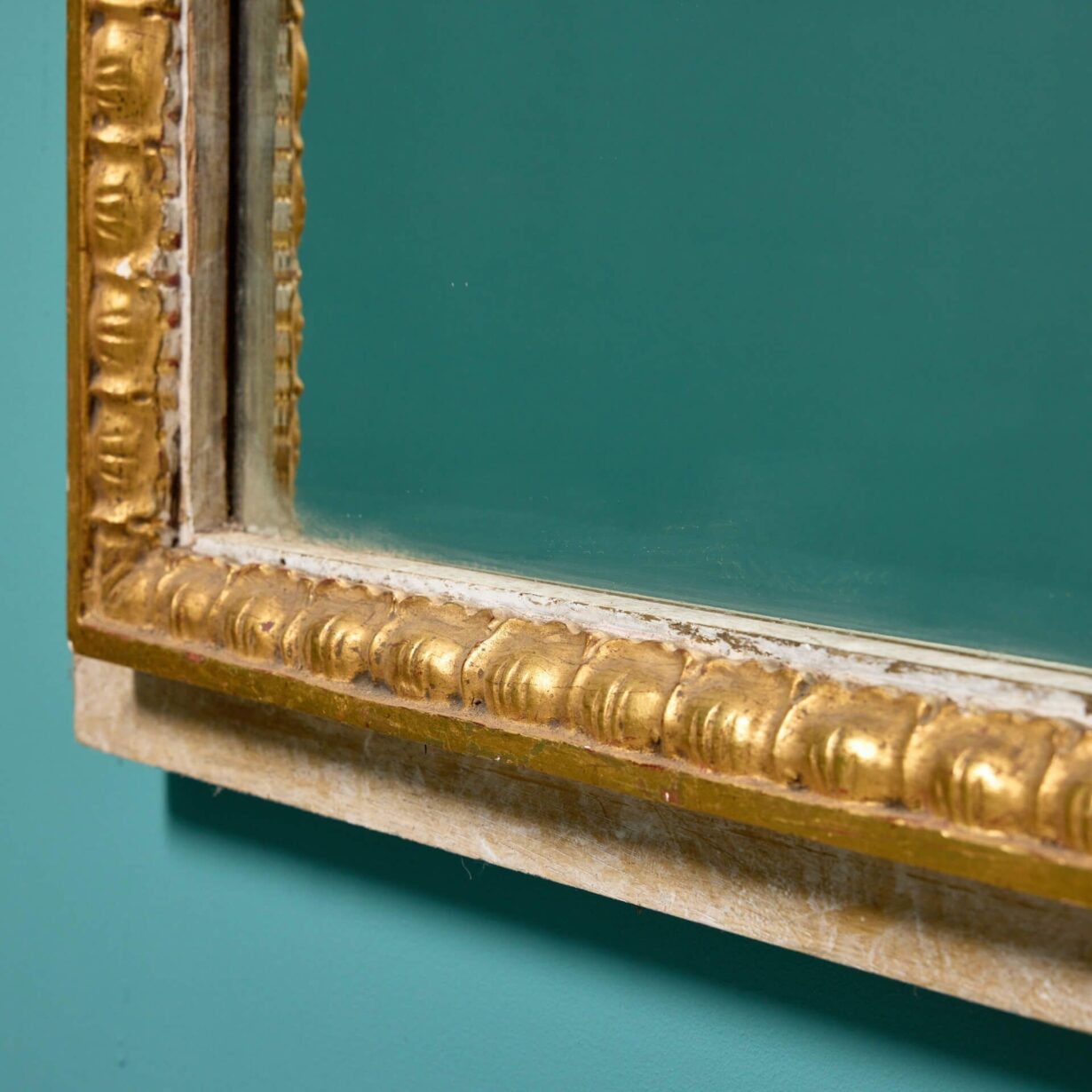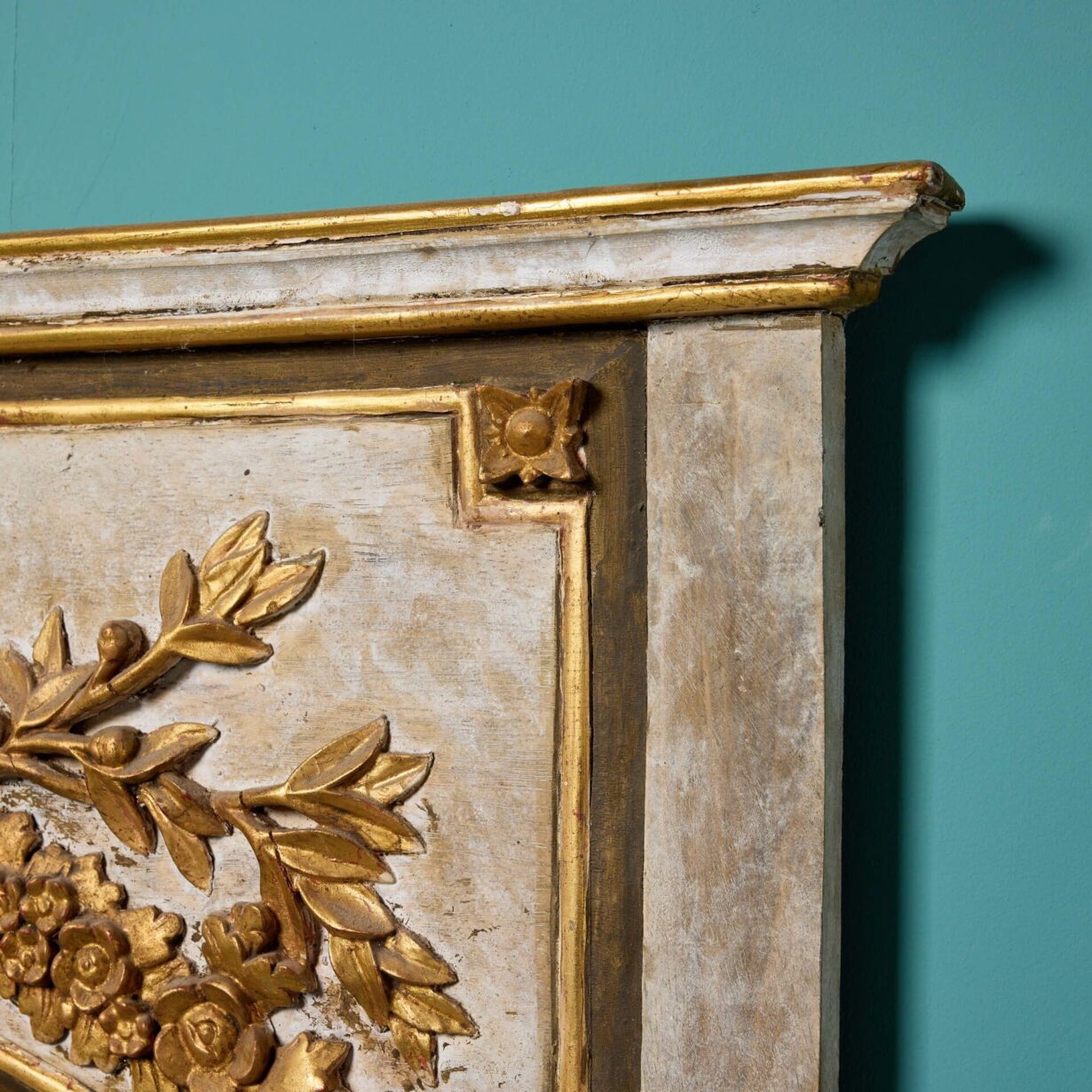 back to topAn elaborately decorated large carved, gilded French pier mirror circa 1870. This statement antique wall mirror has a French trumeau look, featuring an arched bevelled glass mirror below a deeply carved gilt urn in high relief flanked by floral garlands. The walnut frame has a painted polychrome finish, highlighting the striking gold hue of the gilding to bring grandeur to any interior setting.