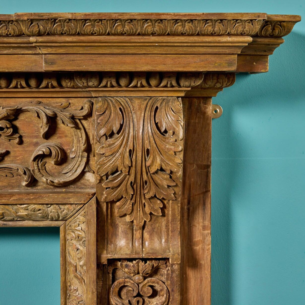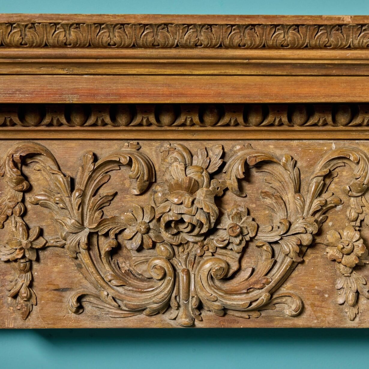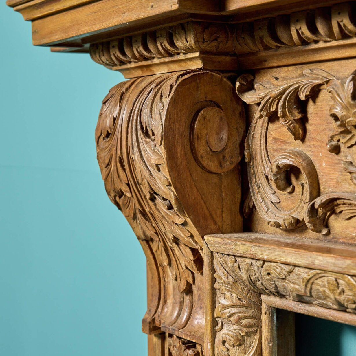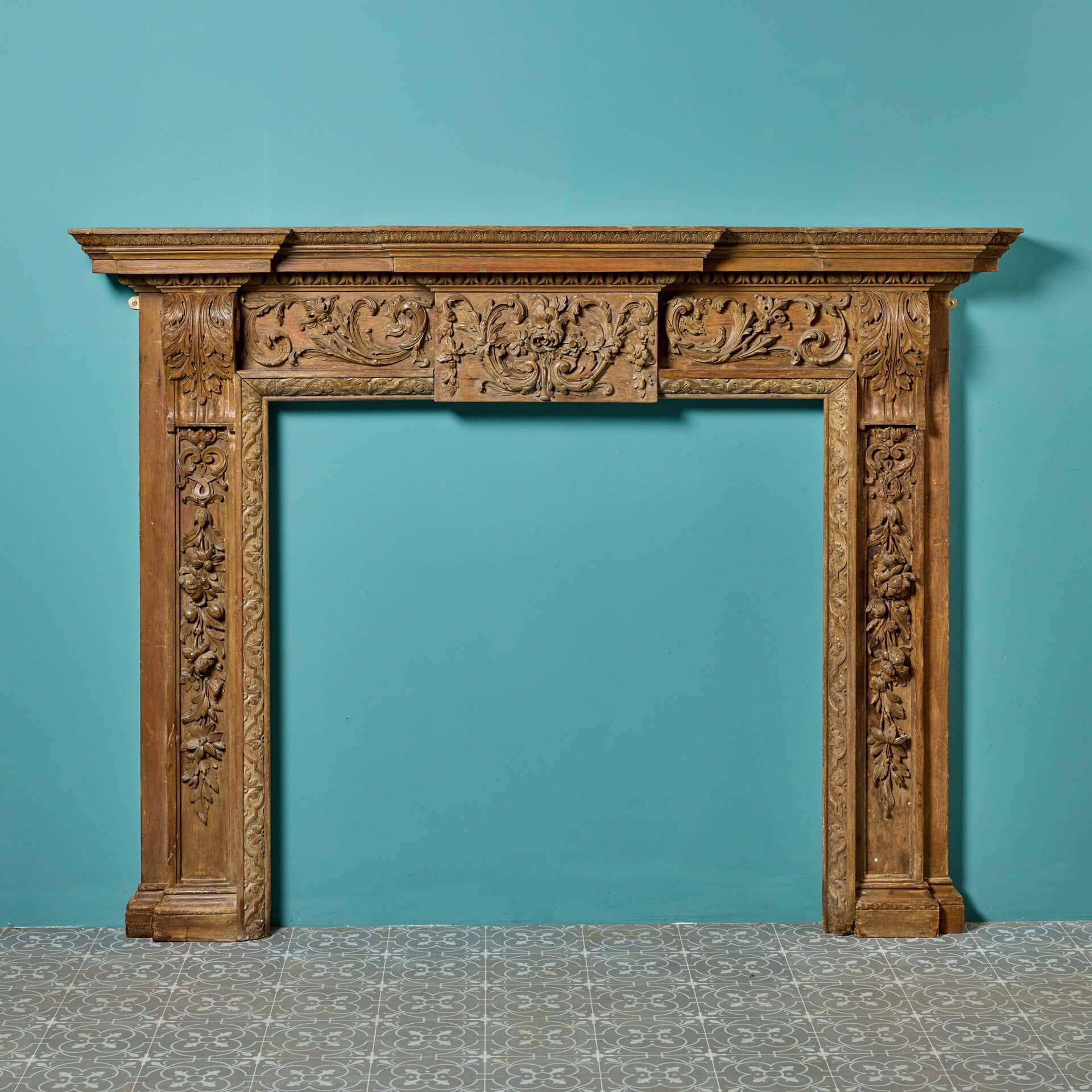 back to topA large-scale Georgian pine fire surround with neoclassical style undertones, exquisitely carved with scrolls and foliage throughout circa 1800. Crafted in pine, this impressive fireplace is exceptionally decorative, carved with c-shaped scrolls to the end blocks and embellished with very deep carving across the tablet, frieze and jambs. It is an original Georgian fireplace of spectacular design, offering a glimpse into the craftsmanship of late 18th century England.