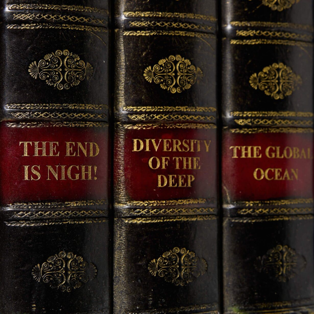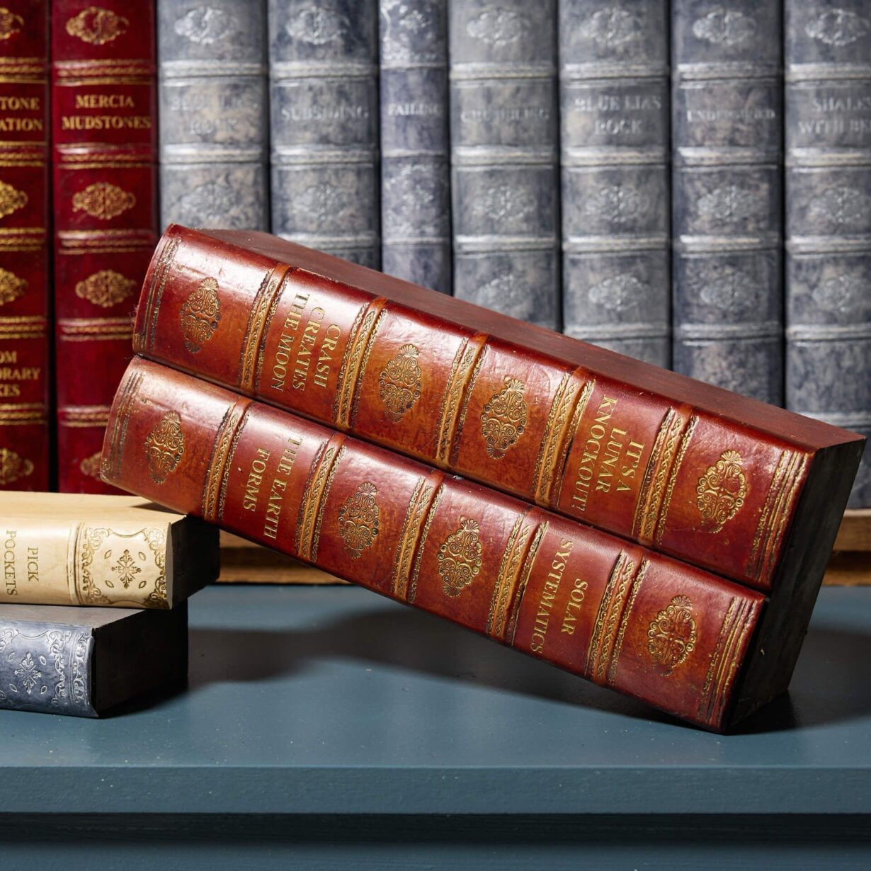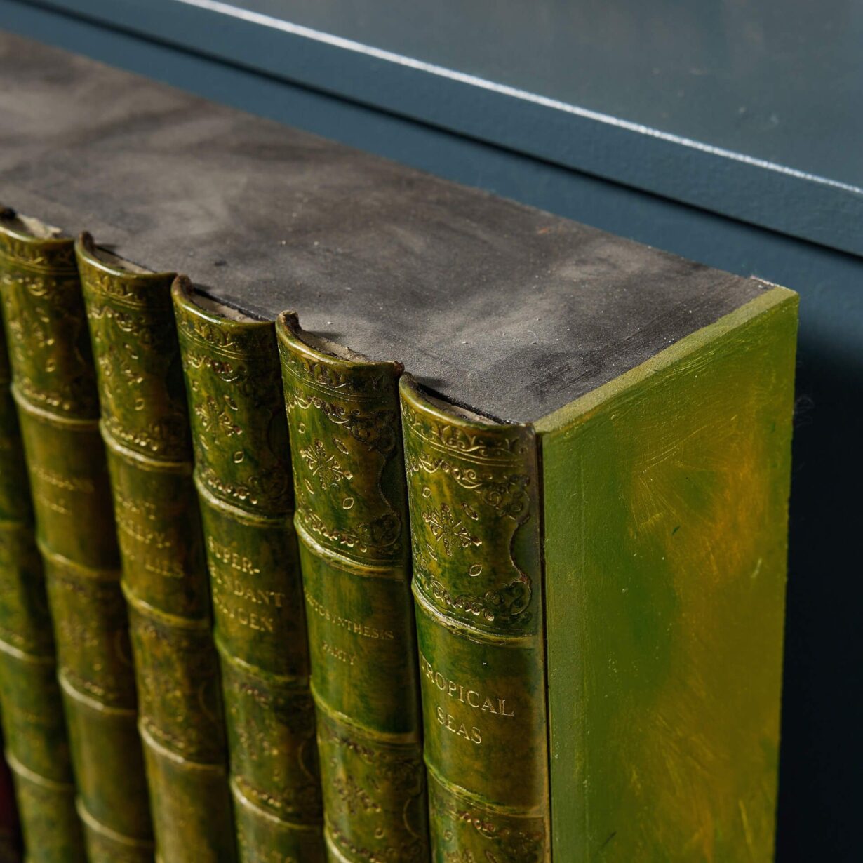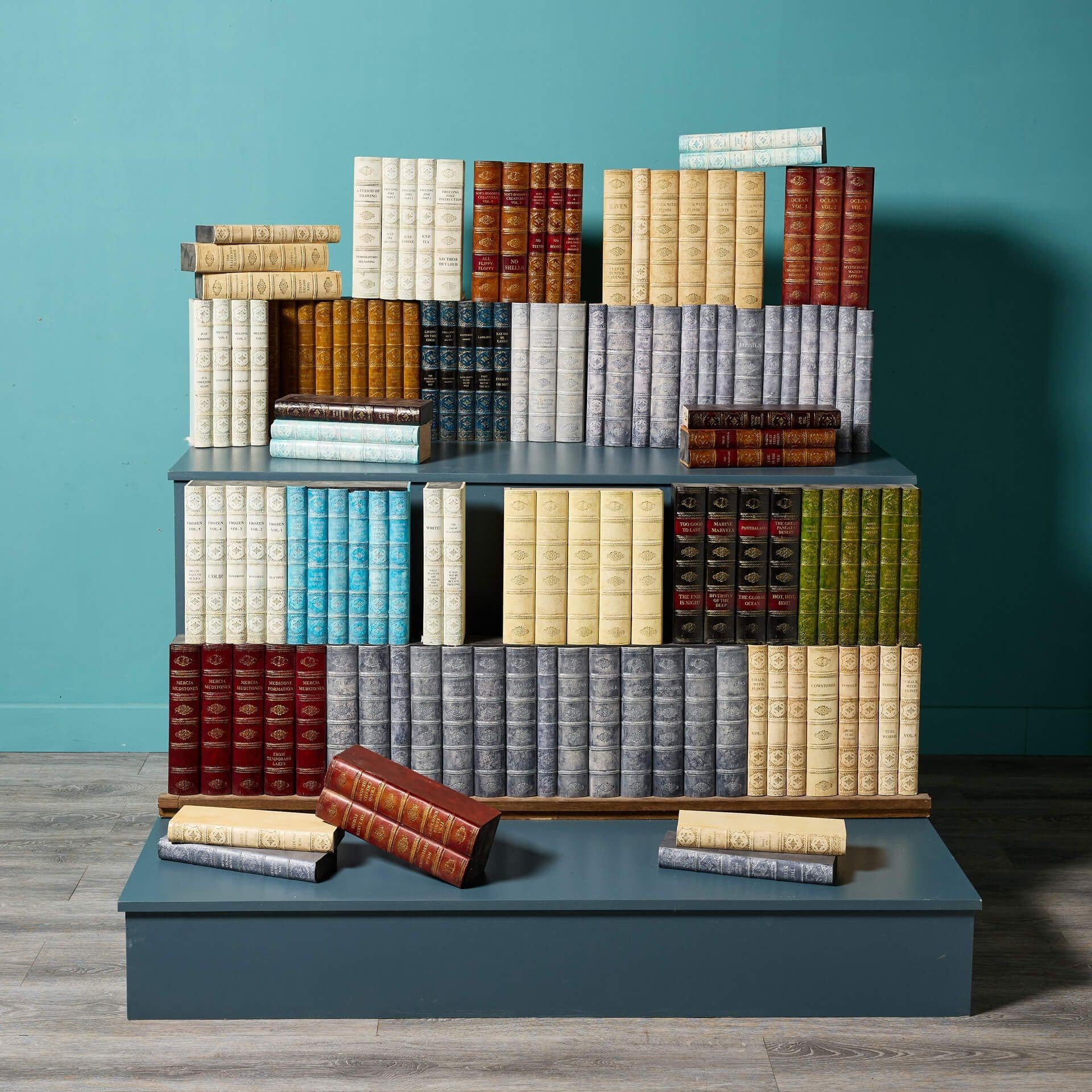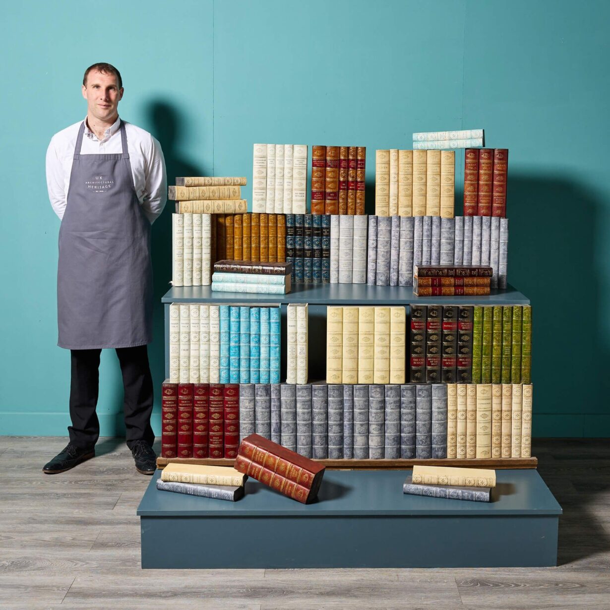This is just one set of large faux book runs we are selling, each made of resin/composite book spines in various colours and attached to manmade board, imitating aged Victorian and Georgian library books.