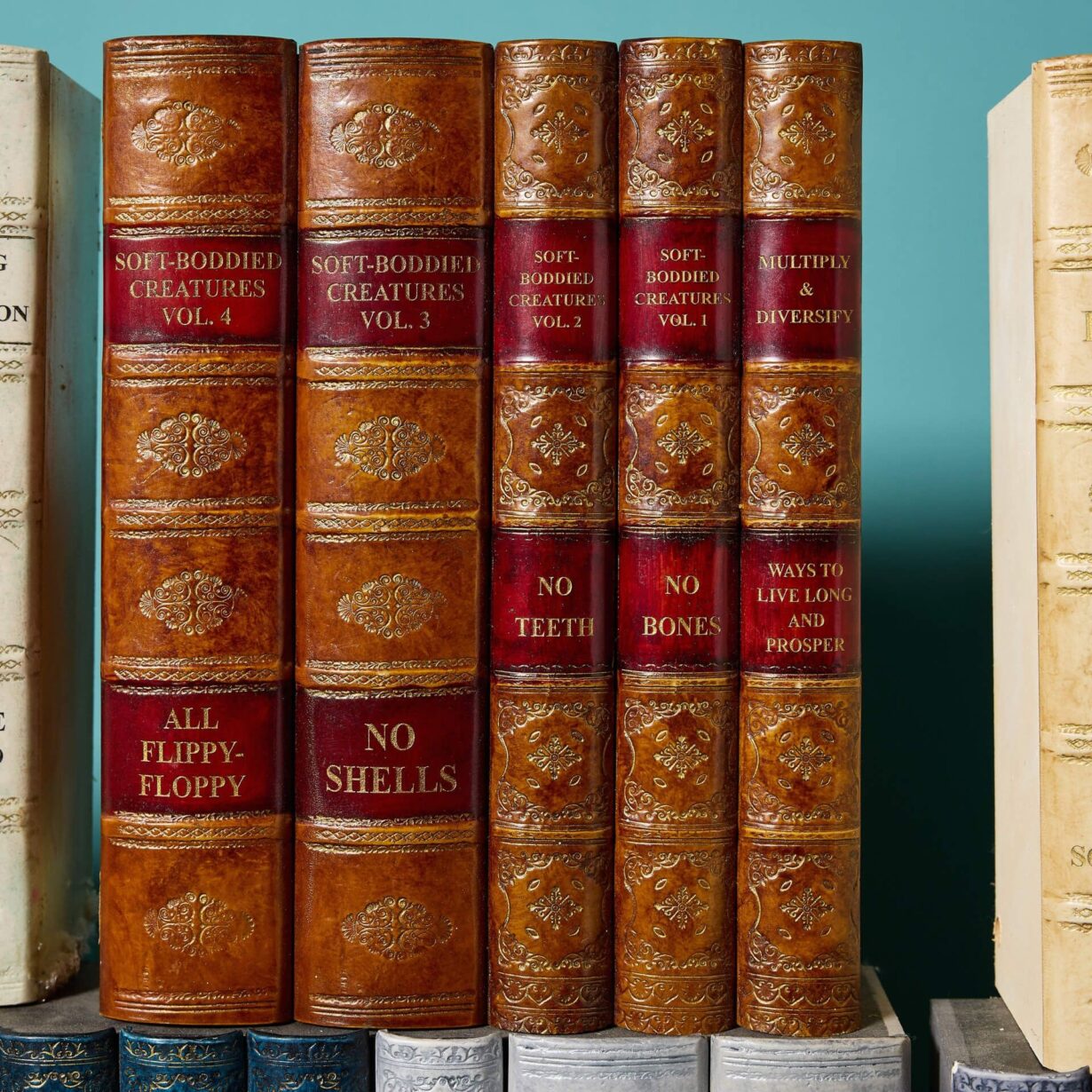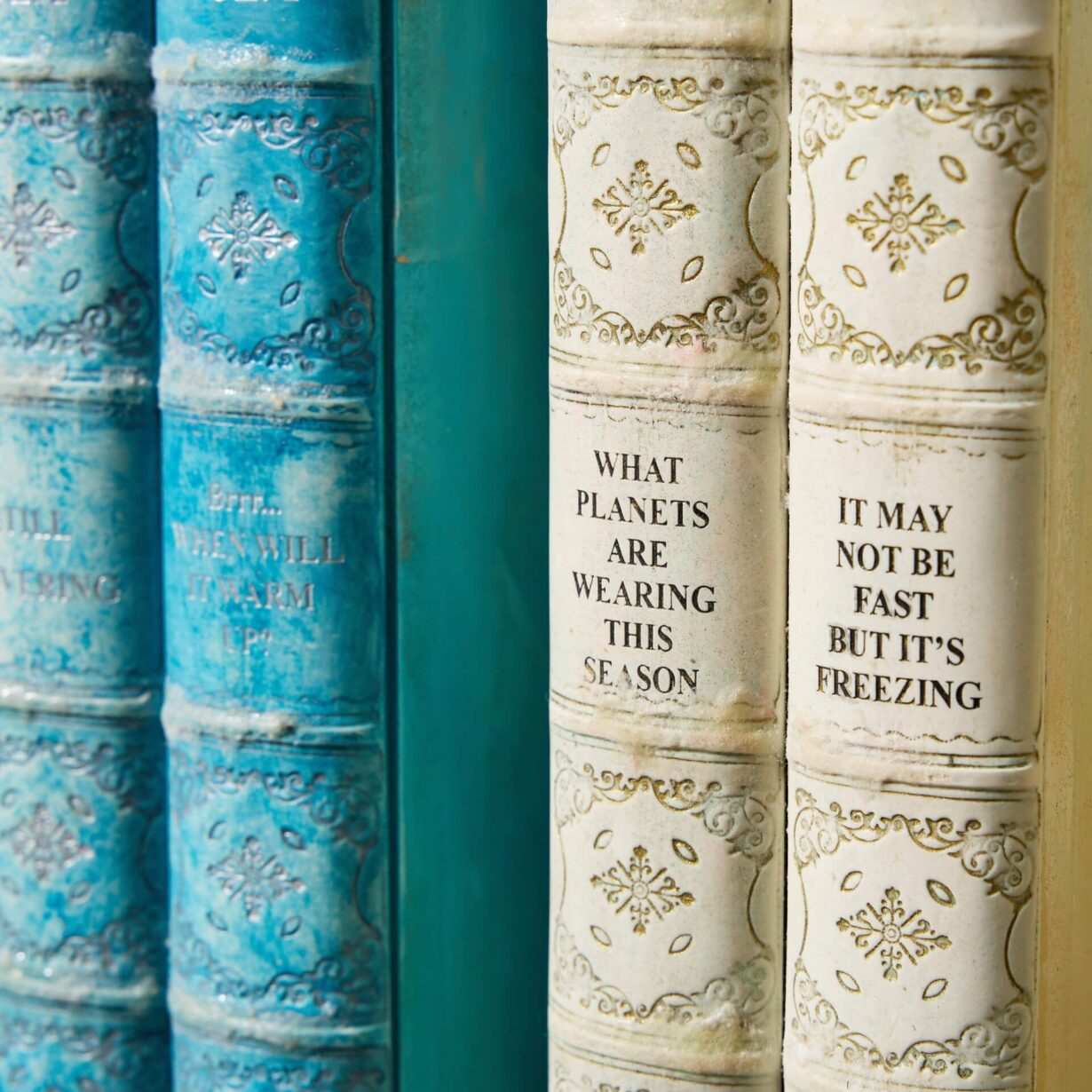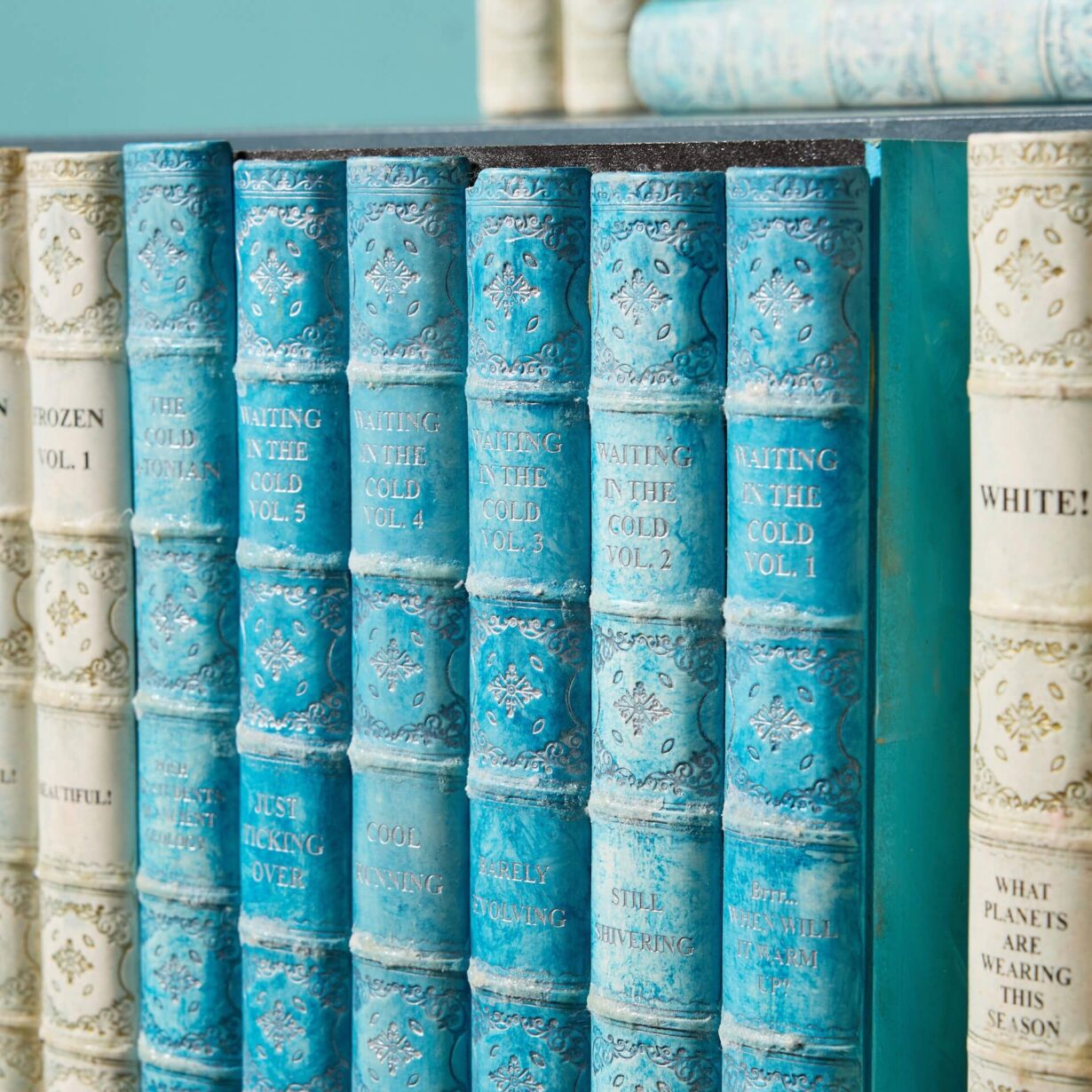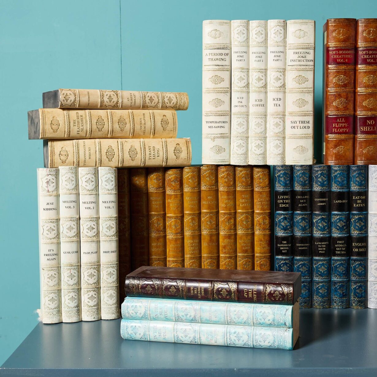 Highlights of this collection include cream, blue-grey, green and red spines and humorous and amusing titles of natural history and historical interest such as “Waiting in the Cold Vol. 2: Still Shivering” and “What Planets are Wearing this Season”.