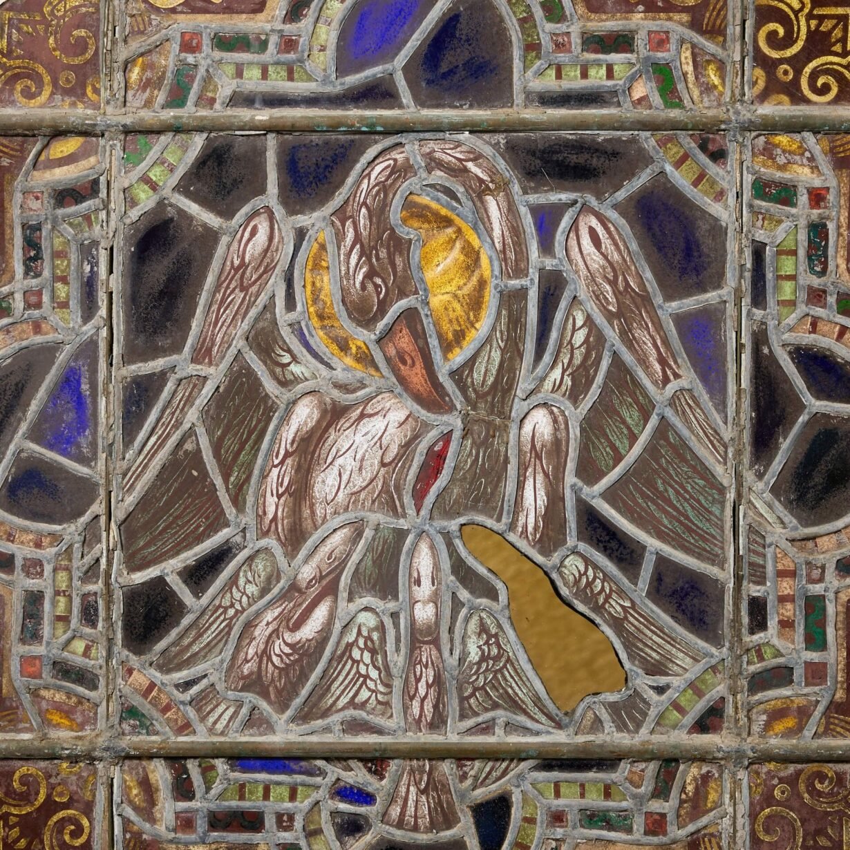 back to topA large ø101cm antique ecclesiastical roundel stained glass panel depicting the pelican of piety. If looking for multiple, we are also selling other roundels in a very similar design.