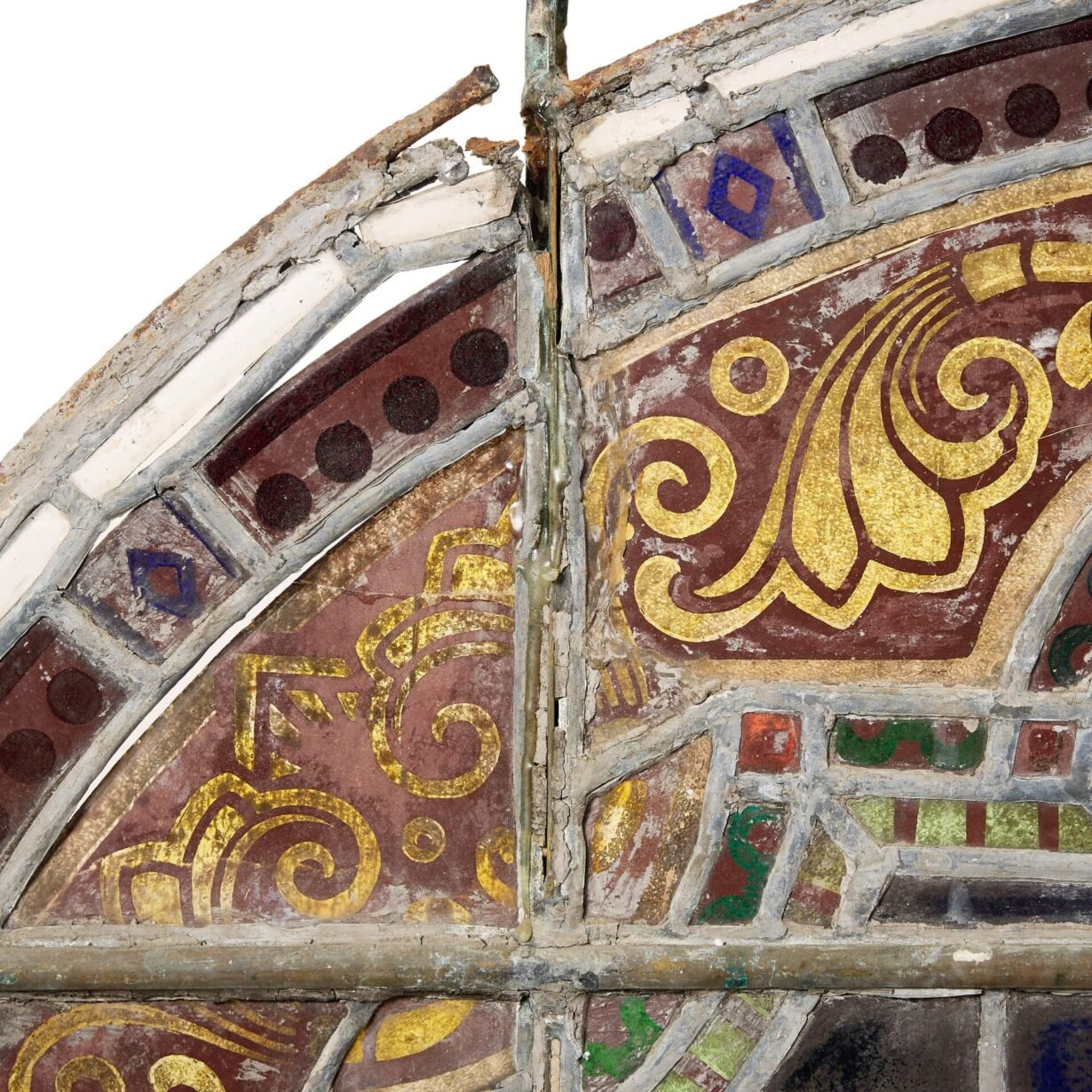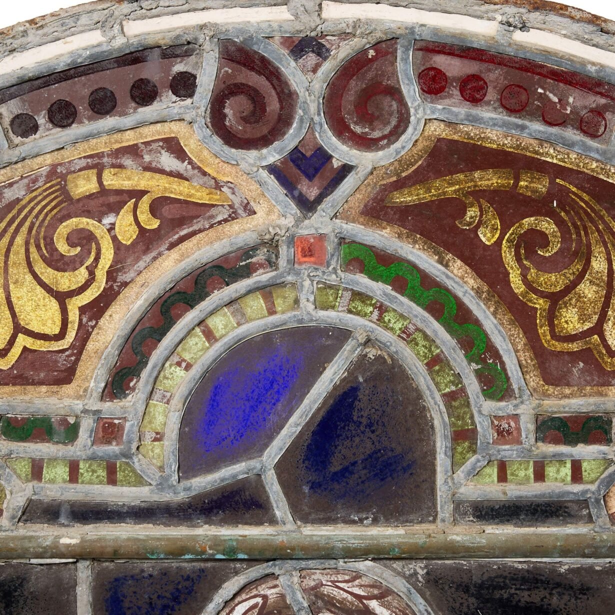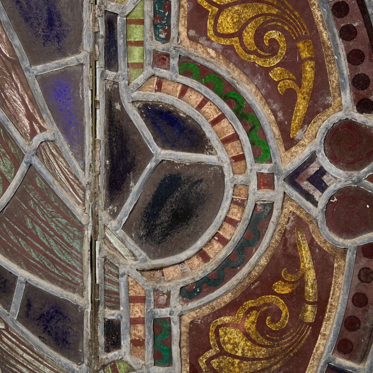 This antique stained glass window features a vibrant array of coloured glass panes that’ll be brought to life by natural light.