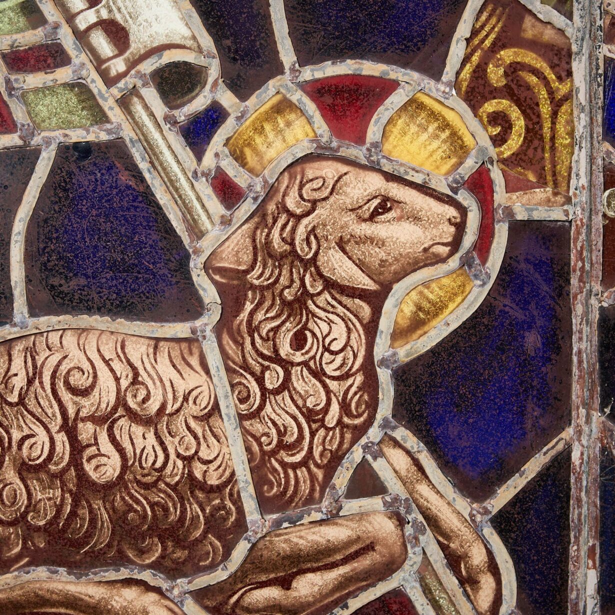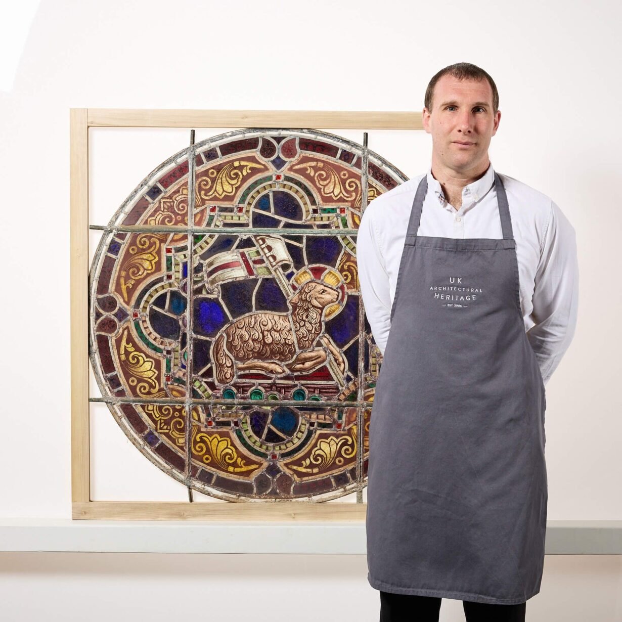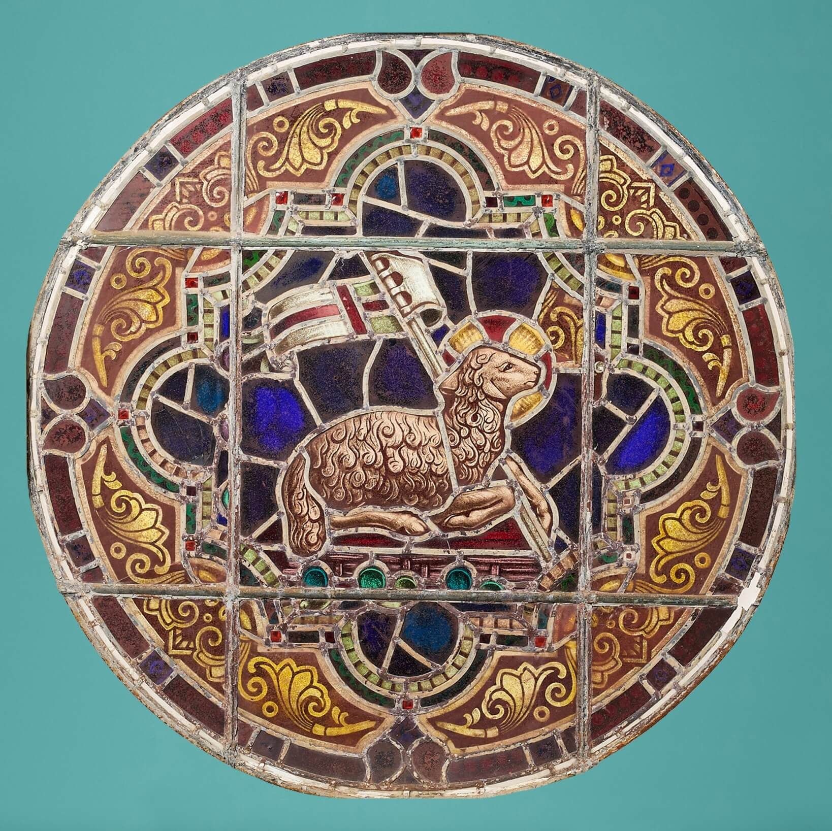 back to topA large ø101cm antique ecclesiastical roundel stained glass panel depicting a stylised lamb holding a flag bearing the St George’s Cross. If looking for multiple, we are also selling other roundels in a very similar design.