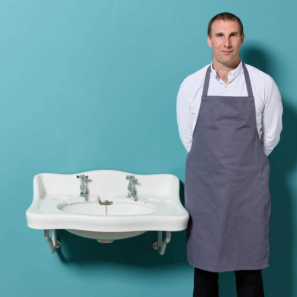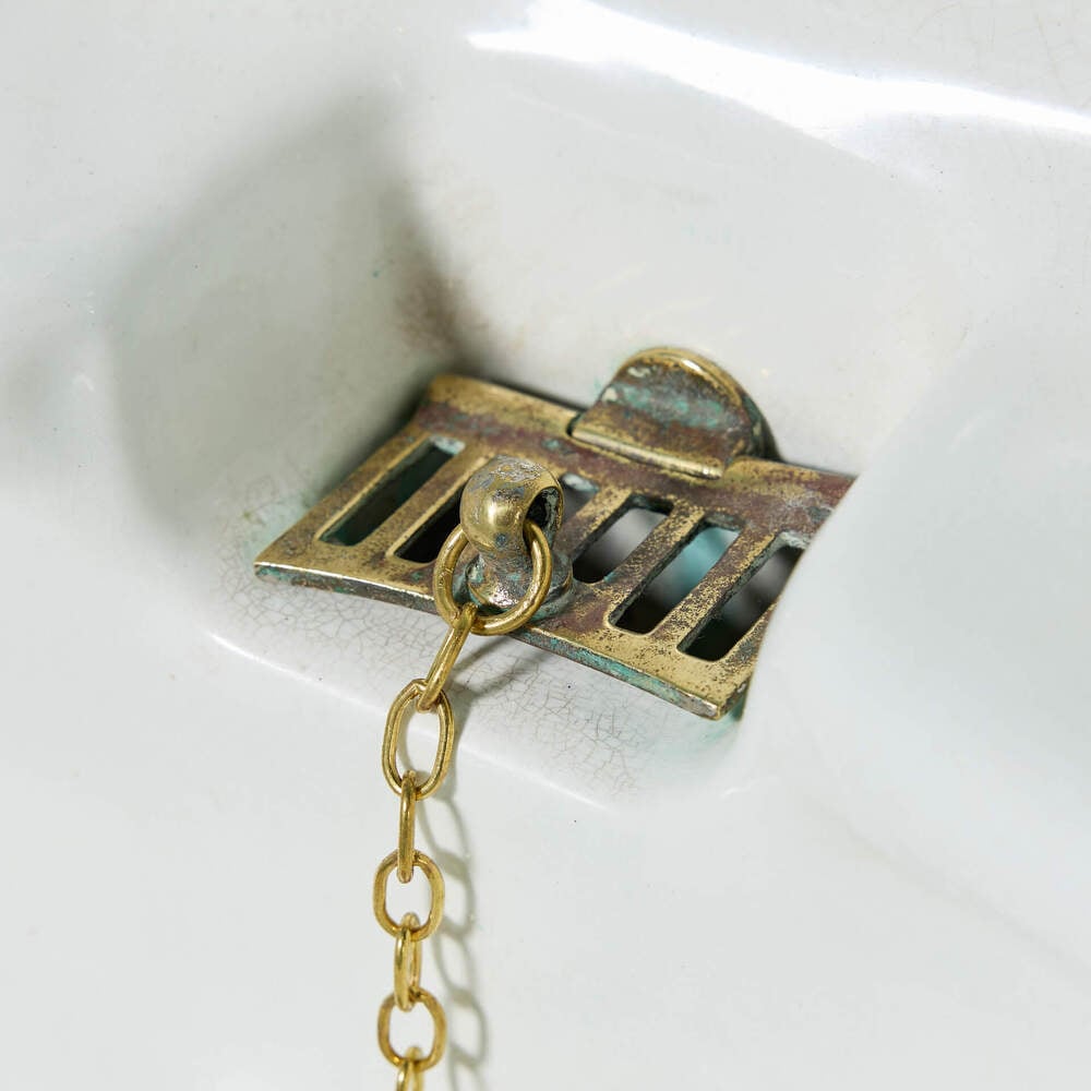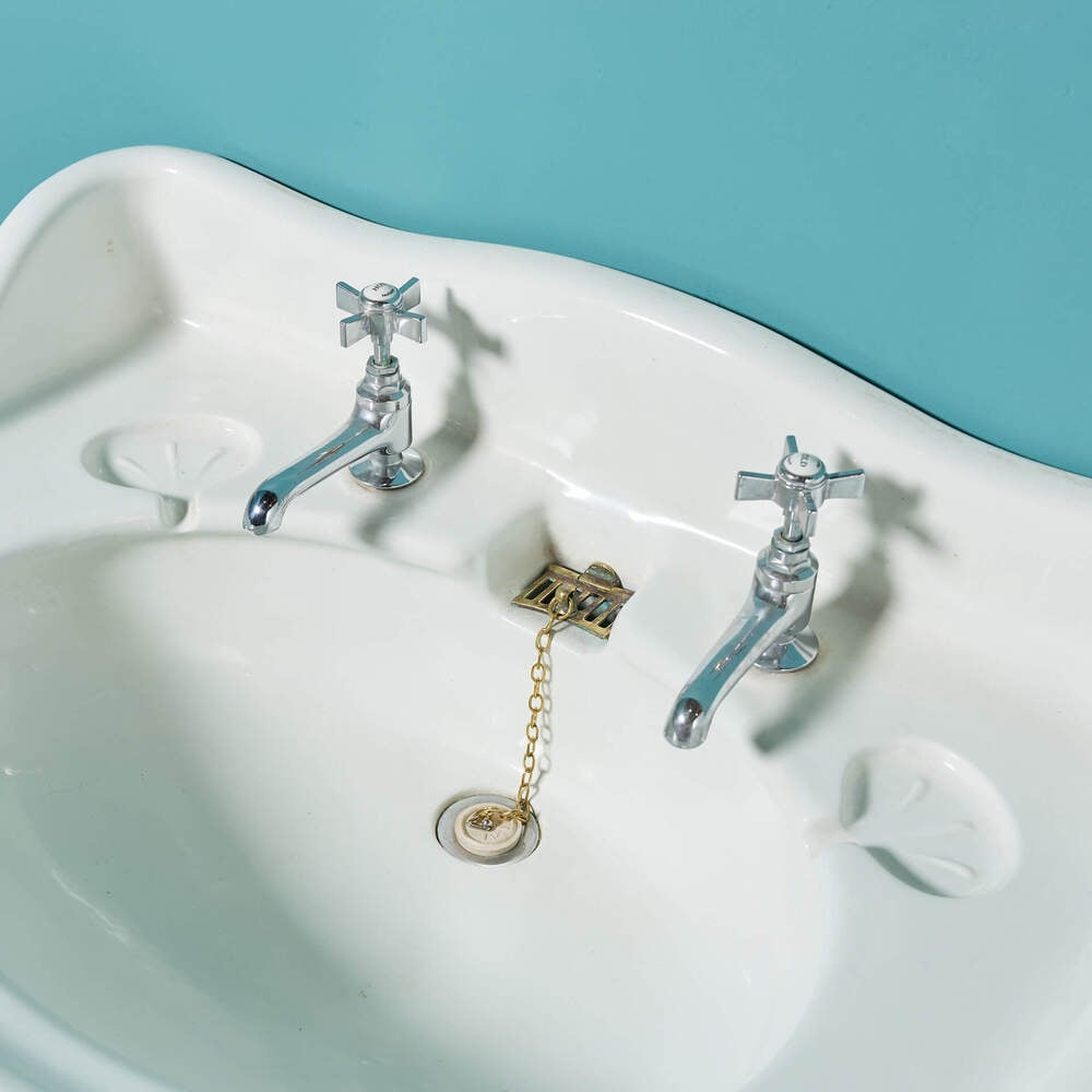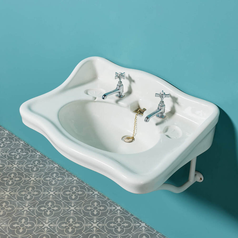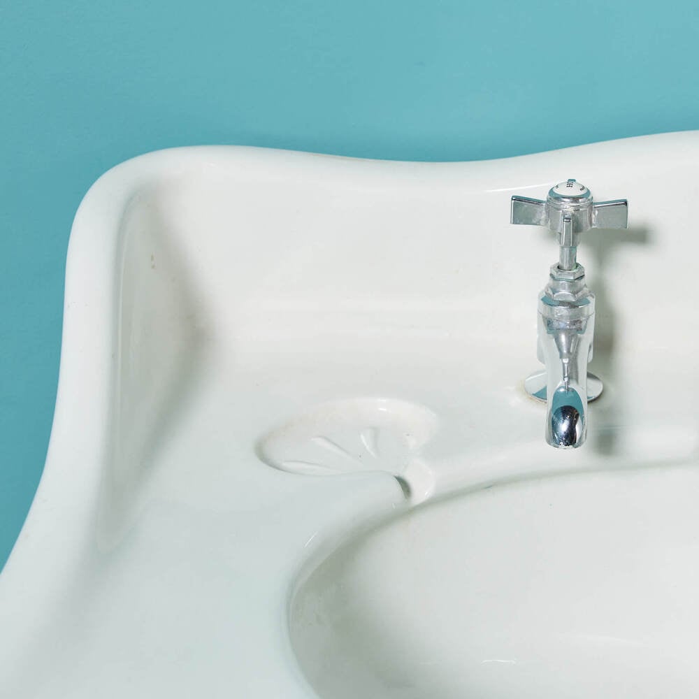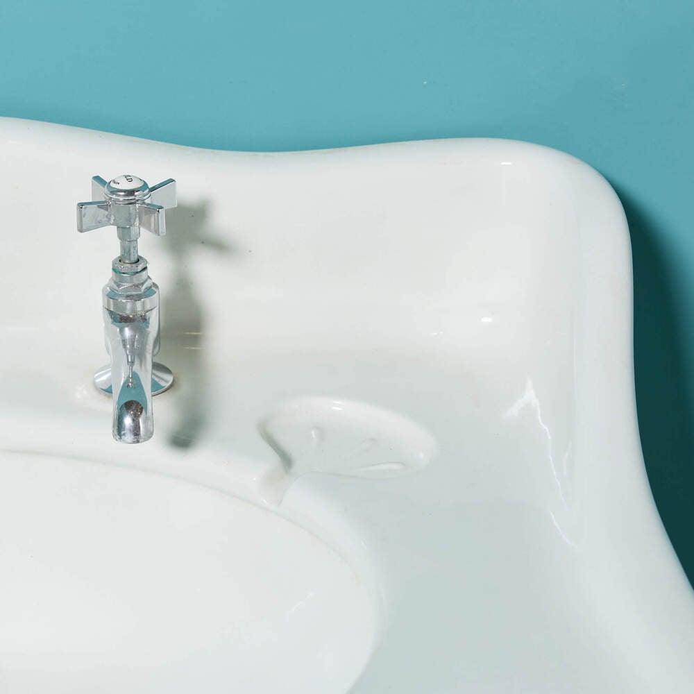 With its sweeping backsplash and rounded corners, this antique sink offers a pleasing design to suit many styles of bathroom. Features include modern taps and two dainty oval shaped soap dishes.