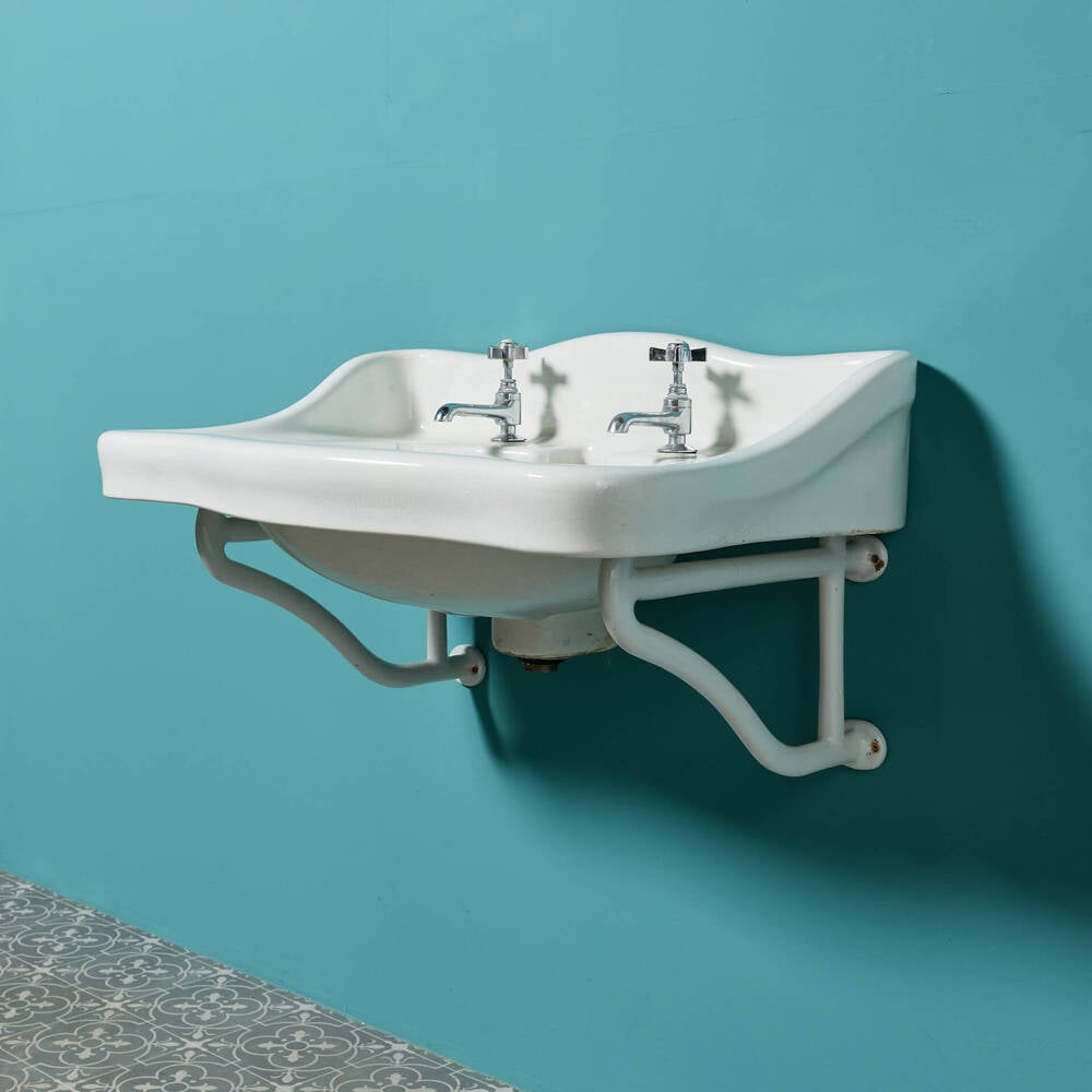 back to topA very large scale Edwardian 1920s ceramic washbasin with two enamelled cast iron brackets ready for wall mounting.