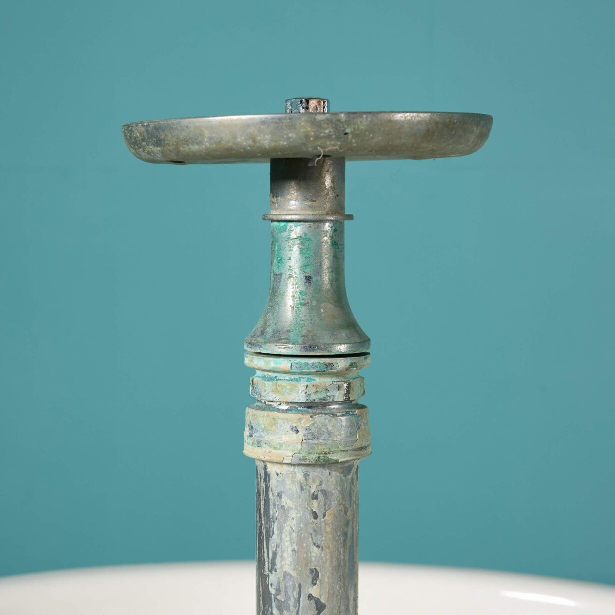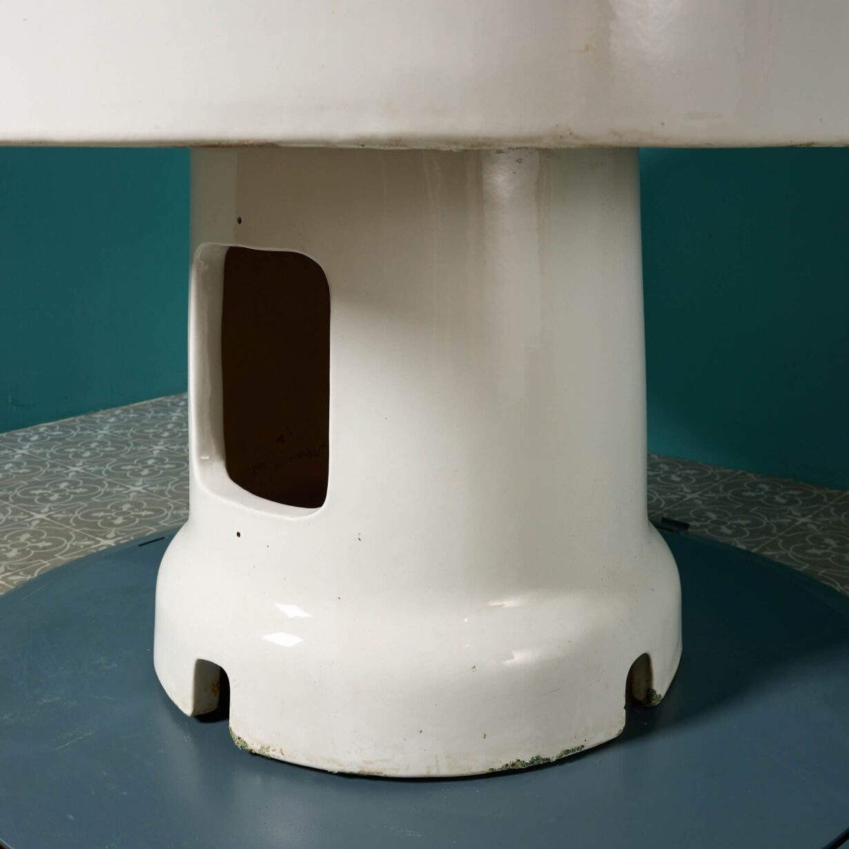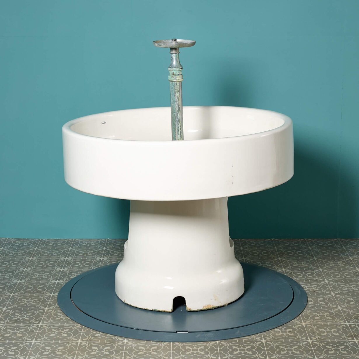 It is made from glazed stoneware and has a nickel-plated brass riser to the centre, the water designed to drain away at the base of the riser. Freestanding, the large round basin sits upon a pedestal base with two uncovered openings for access.