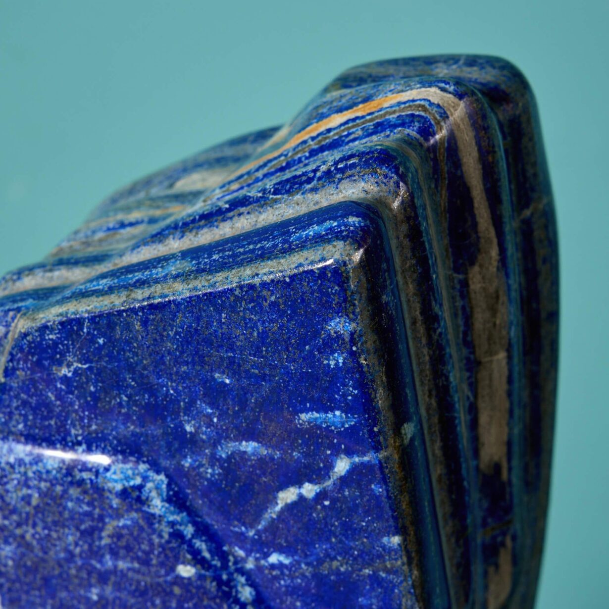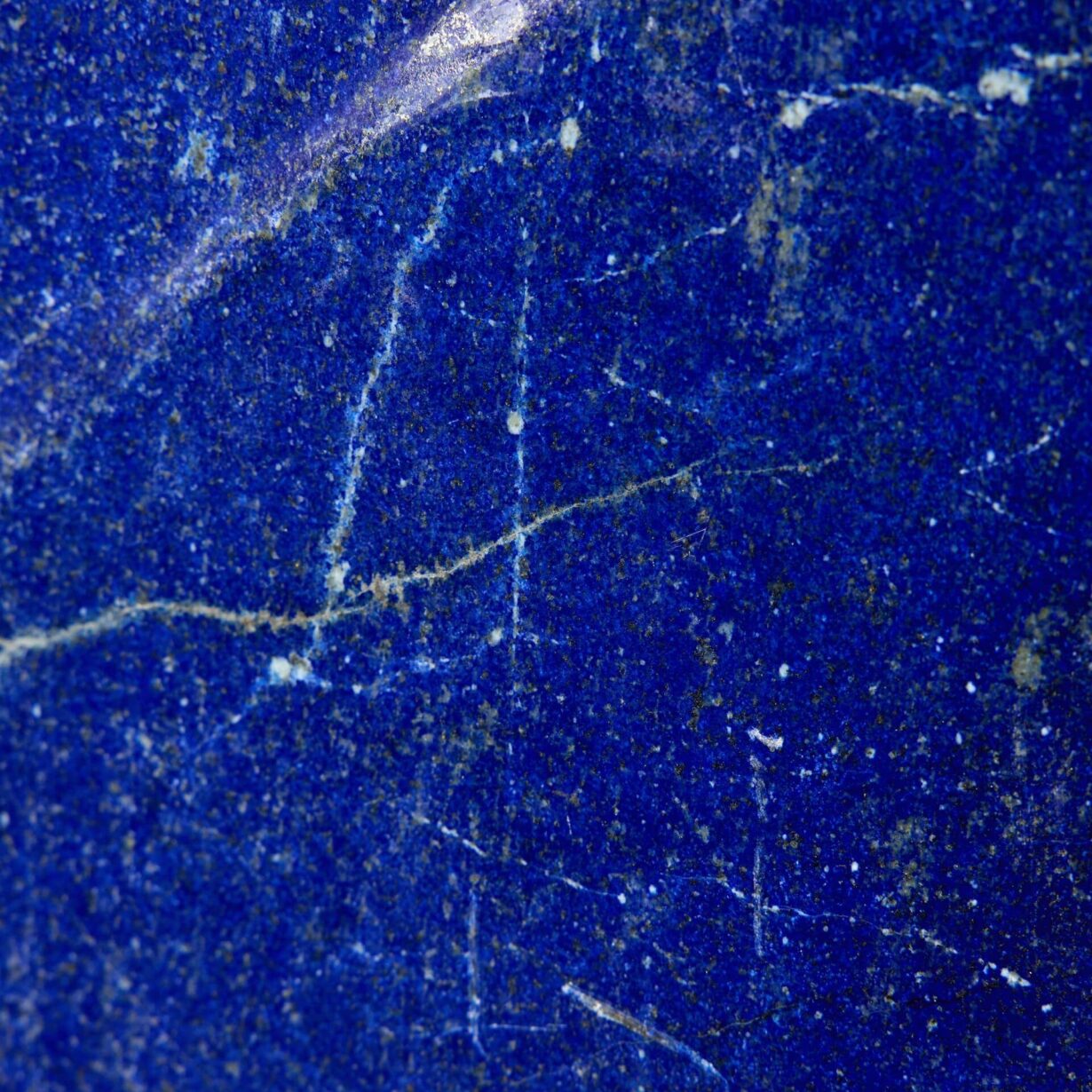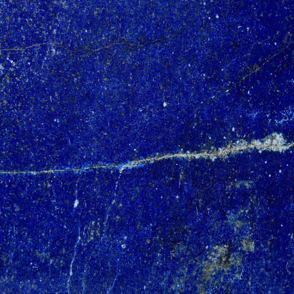 Lazurite is the main component of lapis lazuli and accounts for the stone’s intense blue colour. The best quality lapis lazuli is intense dark blue, with minor patches of white calcite and brassy yellow pyrite.