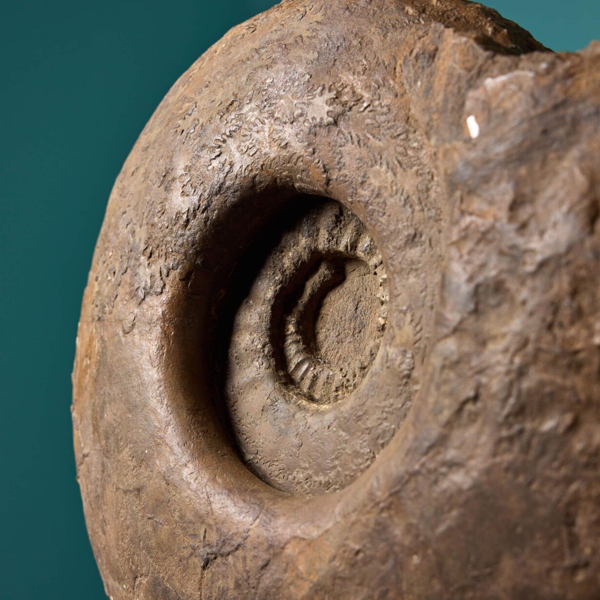 Dating from the Jurassic period (145 million years ago), this large ammonite fossil has a deep, burnished brown colour with a distinctly coiled shape, which is particularly pronounced at the centre. Look closely and you’ll observe highlights of feathered jigsaw-like texture to the outer coil, formed by compression over millions of years.