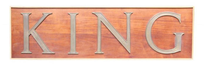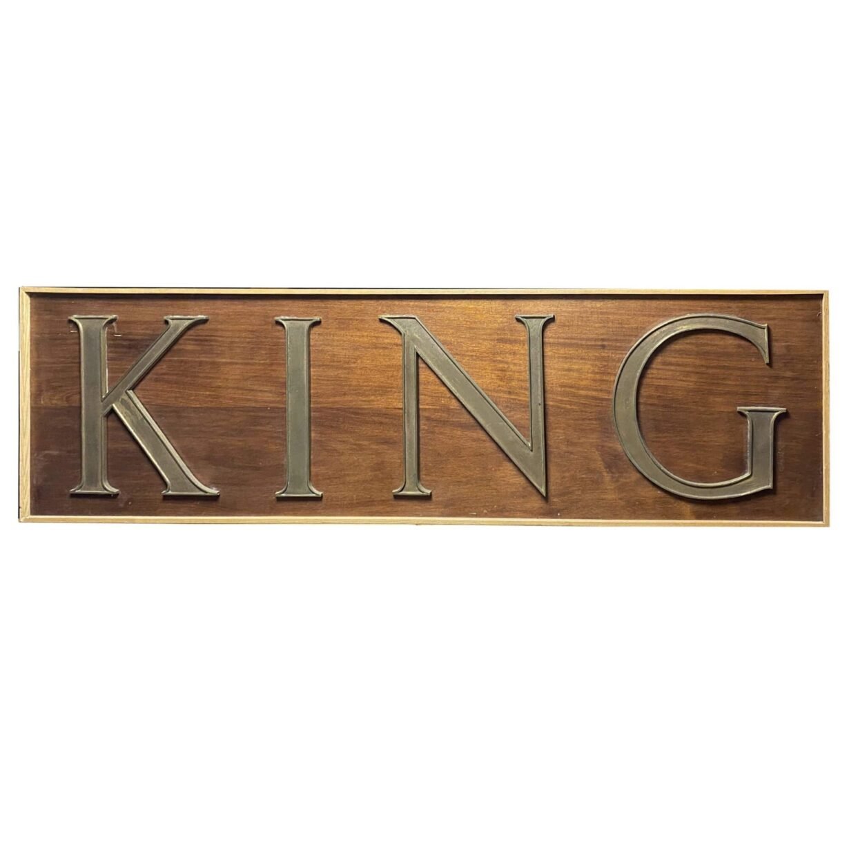 back to topA large reclaimed ‘King’ wall hanging sign dating to the early 20th century. Bold and stylish cast bronze letters are mounted onto a smooth mahogany board to create a striking Edwardian style plaque, perfect for a castle or manor house House. This unique decorative piece is a timeless accessory that would take pride of place in any period property or a modern home looking to add striking period features.