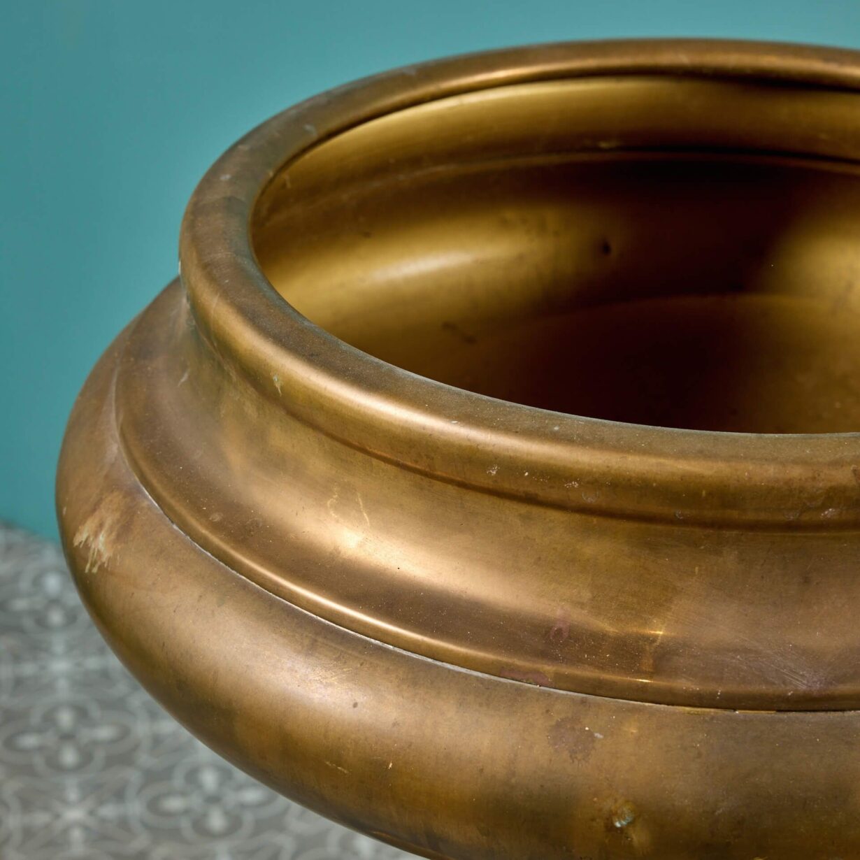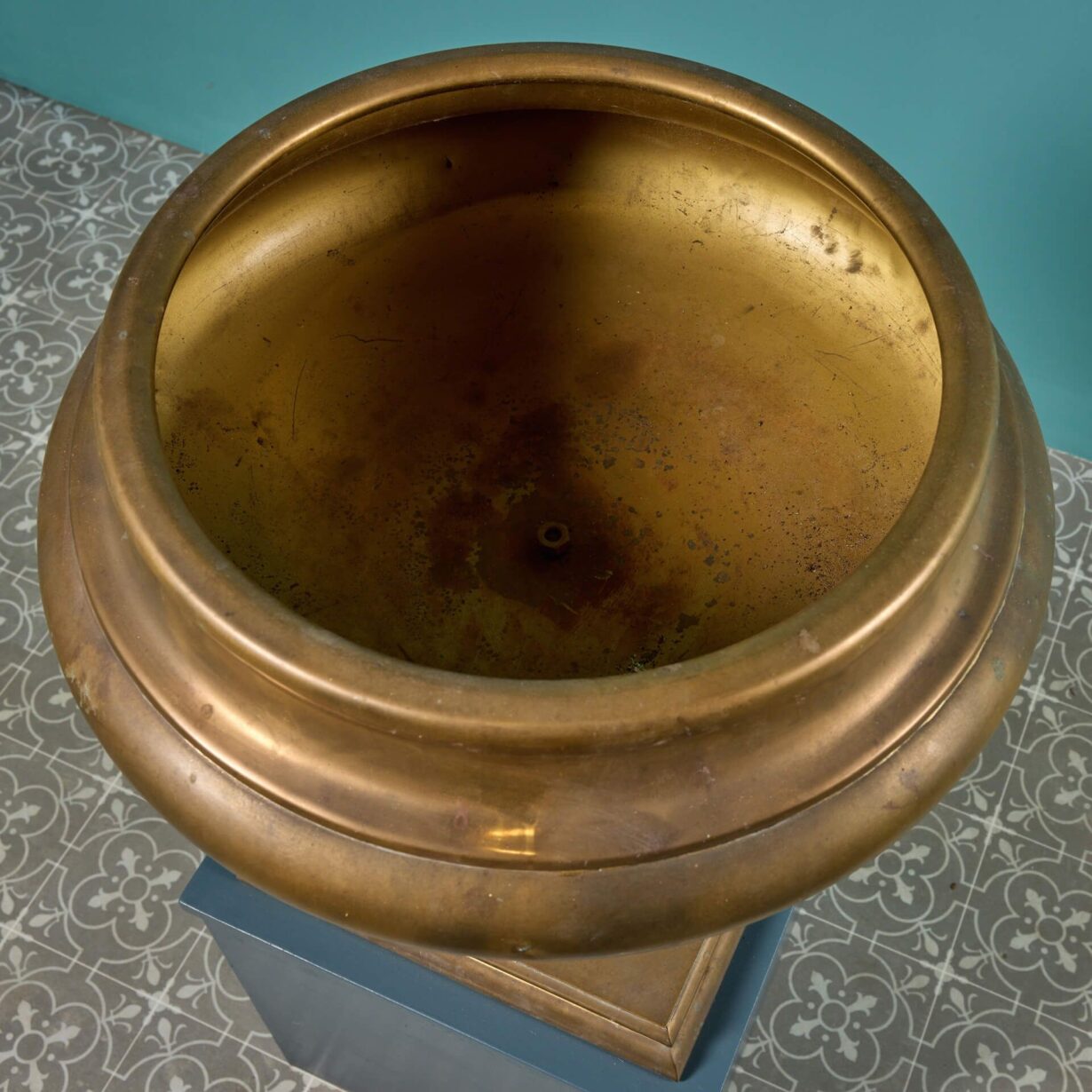 back to topA large mid century brass urn or vase with an oxidised finish circa 1950. This large brass urn makes a striking centrepiece on a plinth or sideboard, as impressive styled alone as it is filled with fresh flowers. Alternatively, it could be used a lavish champagne bucket or wine cooler!