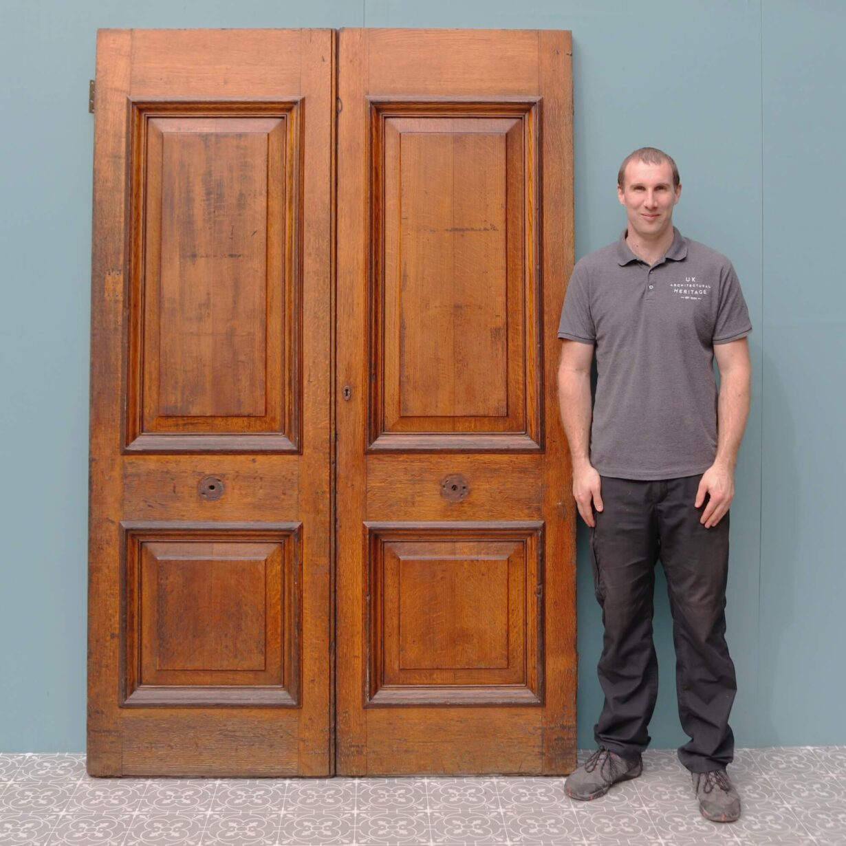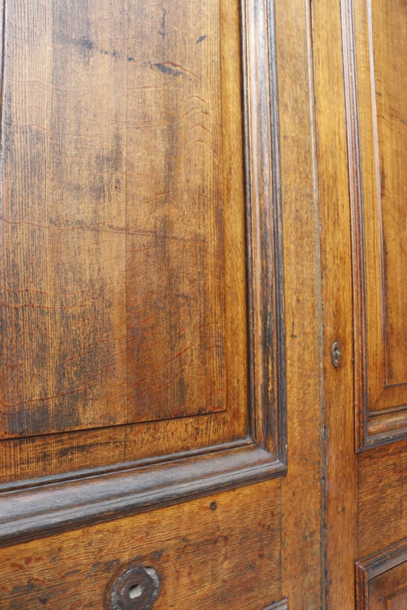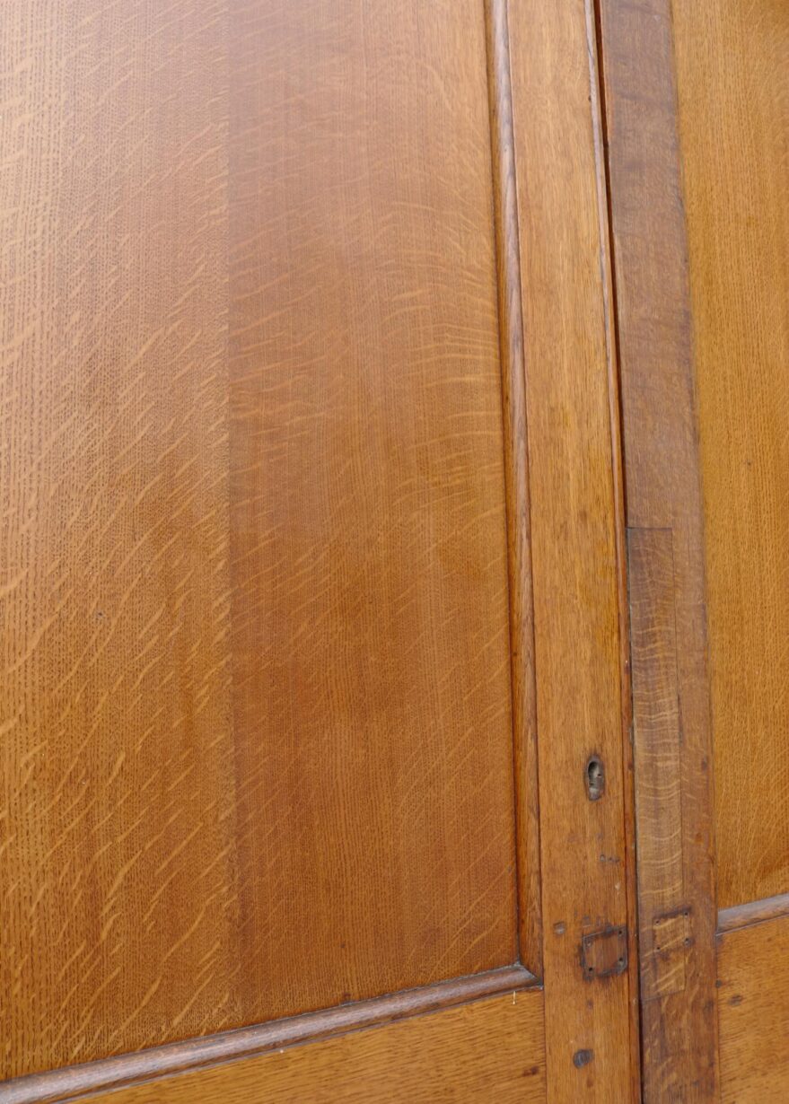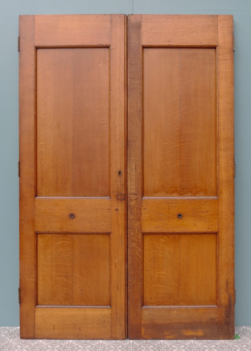 back to topThis handsome pair of large antique double front doors set the stage as an impressive entrance to an Edwardian or Victorian townhouse. Dating from the early 20th century, these double doors have a warm and inviting colour that showcases the unique beauty of the cuts of oak used to construct the doors when they were made in the early 1900s. Each door is detailed with two raised and fielded panels evocative of the Edwardian and Victorian periods. Markings remain where handles once sat at the centre of each door.