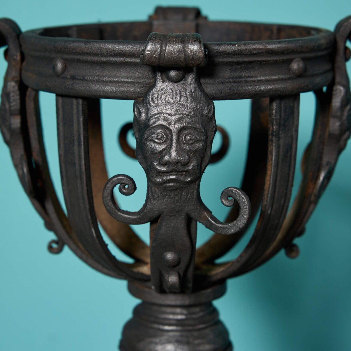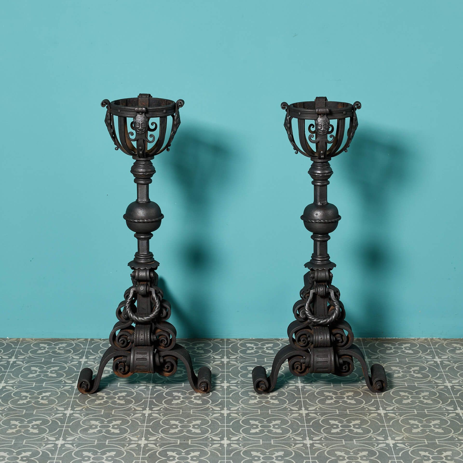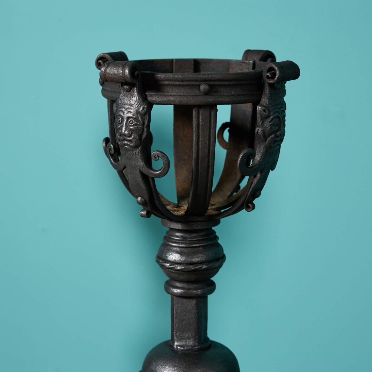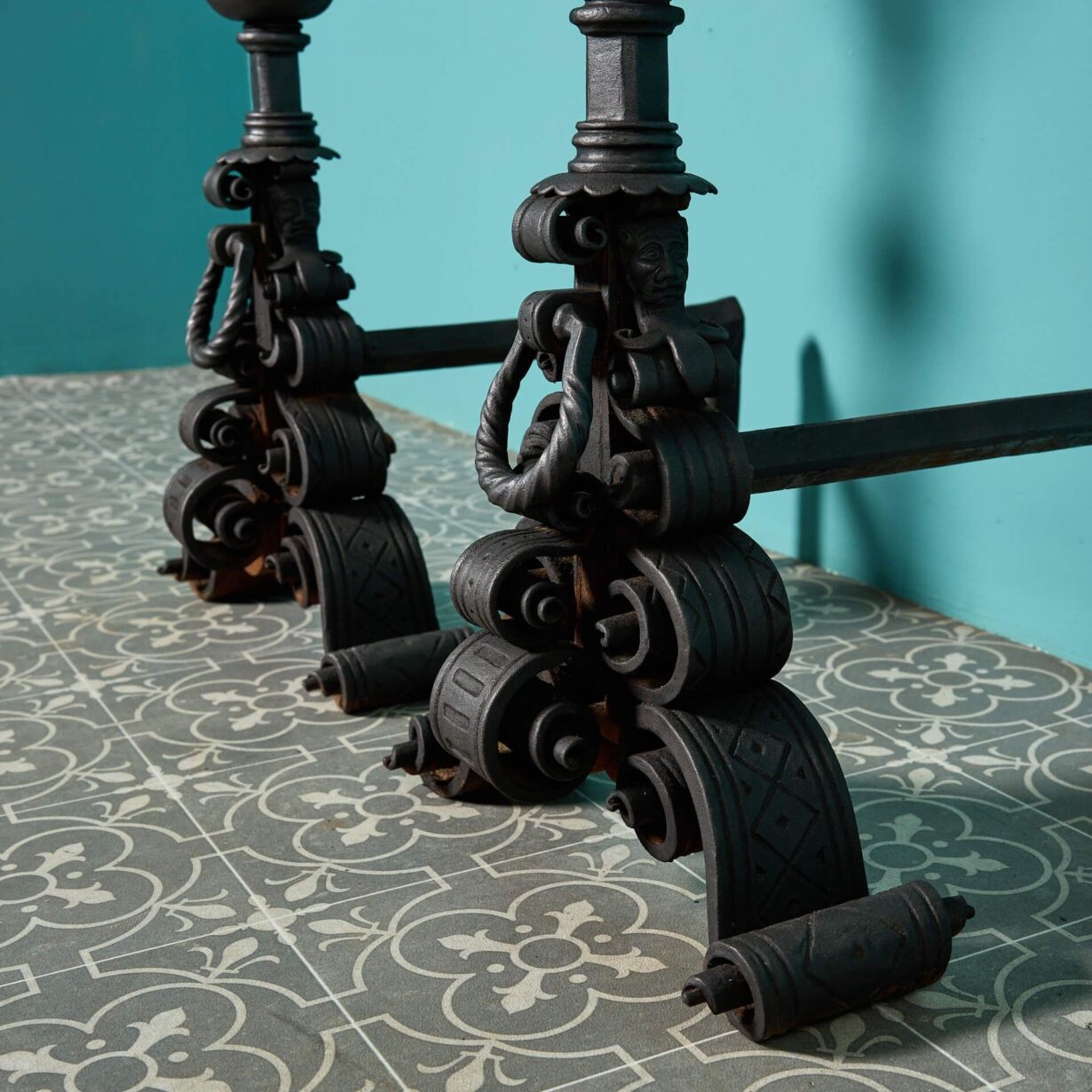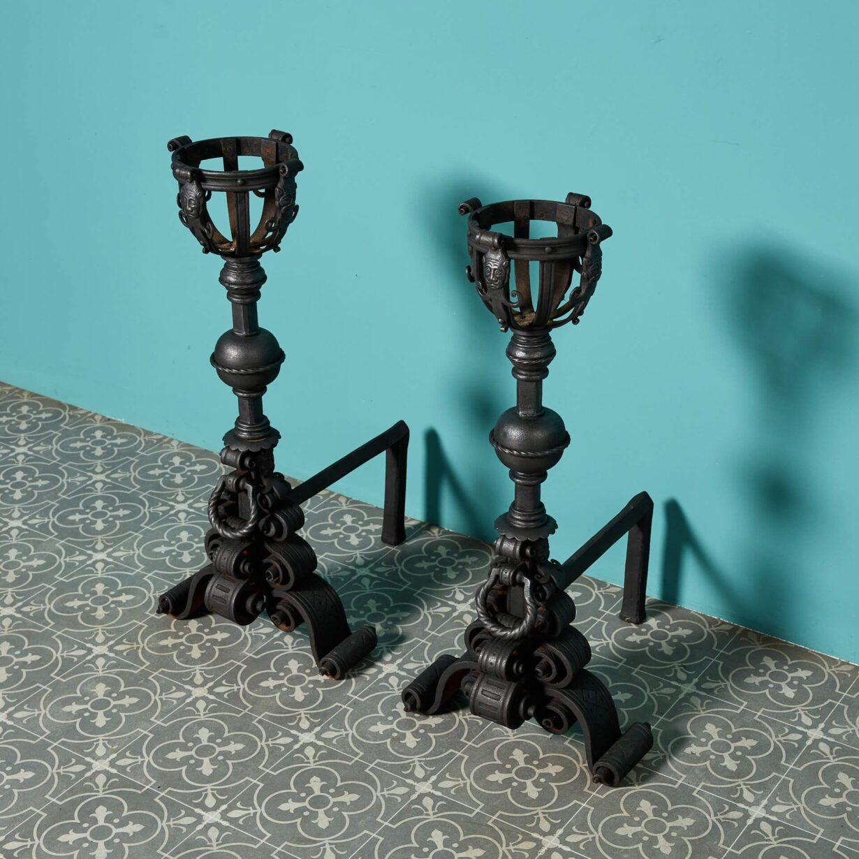 back to topA large and ornate pair of 19th century English rococo style fire dogs, ex. Tucker collection. Ornately handcrafted, these antique andirons make an instant statement with their elaborate wrought iron craftsmanship, the large cup-shaped tops detailed with grotesque masks above ornate scrolling bases with knocker-style handles. Perfect for pairing with a large and equally as elaborate fireplace.