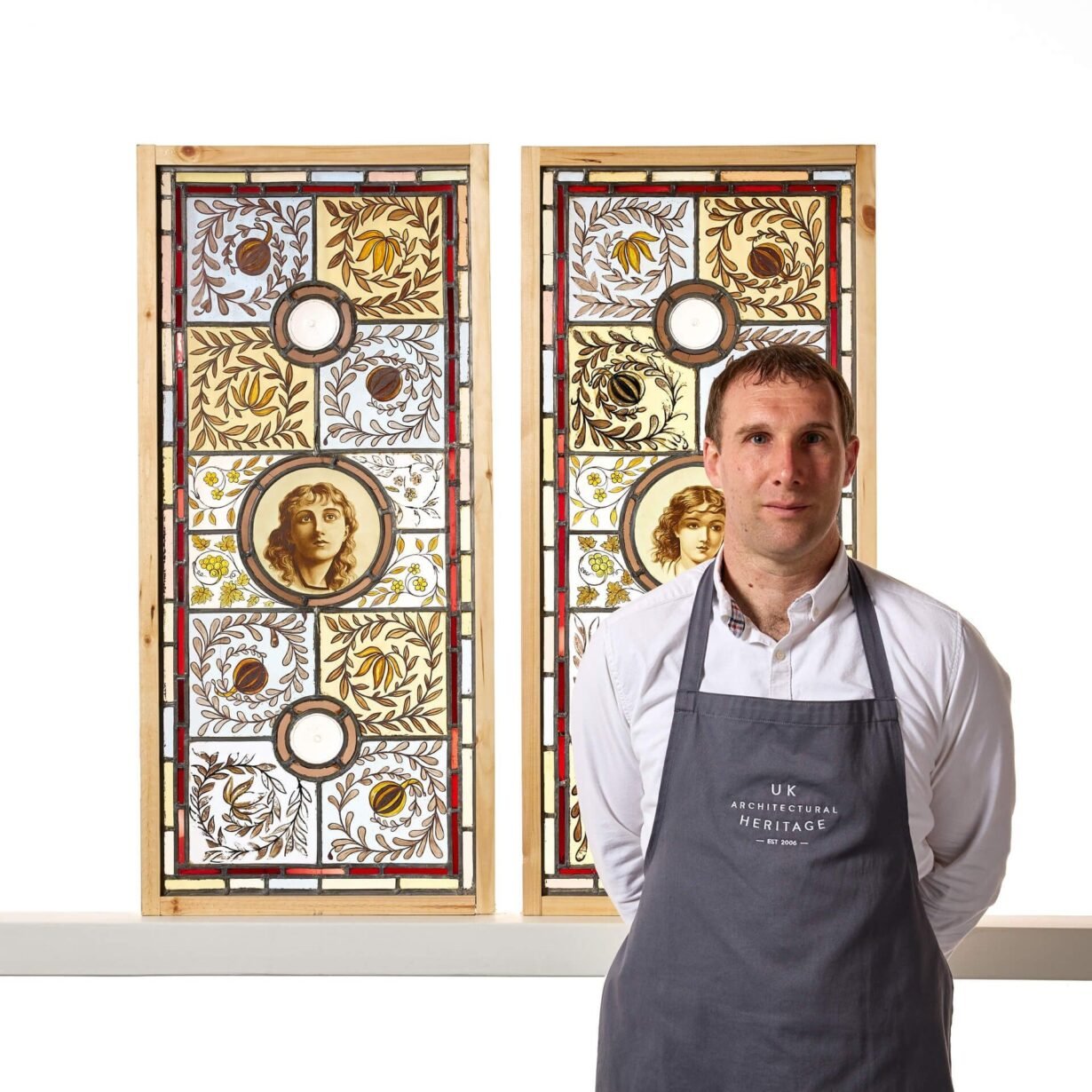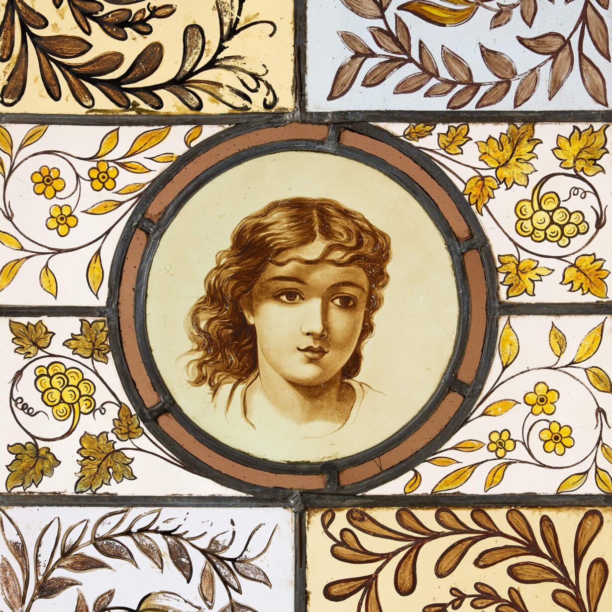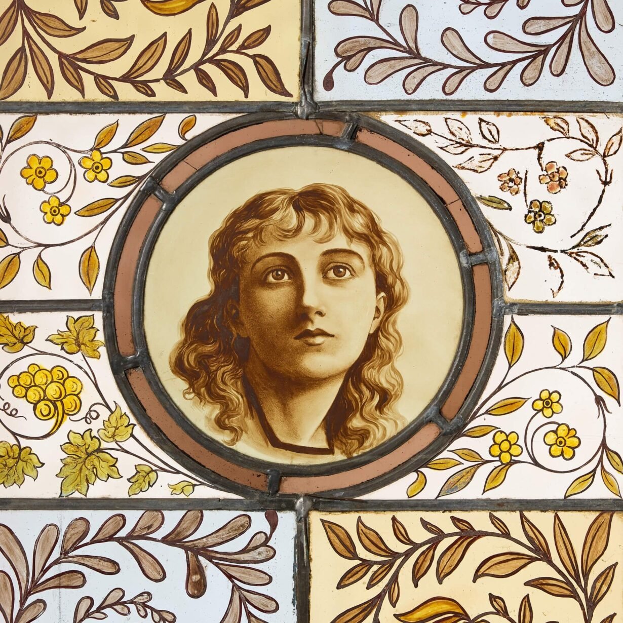 back to topA large pair of Arts and Crafts style floral stained glass panels depicting young female faces.