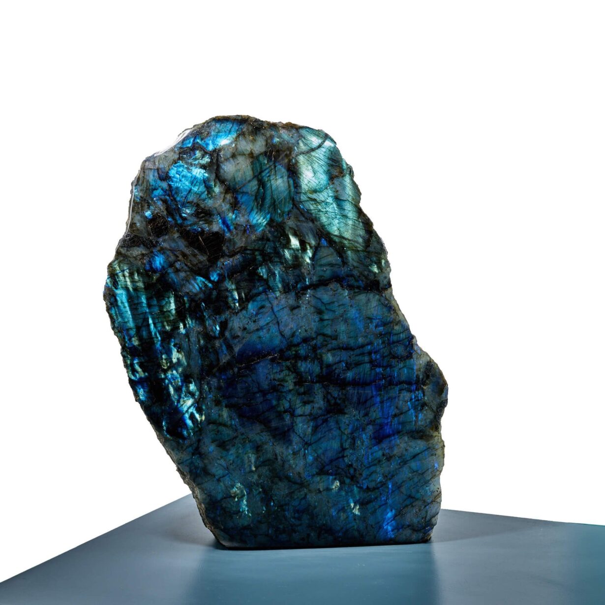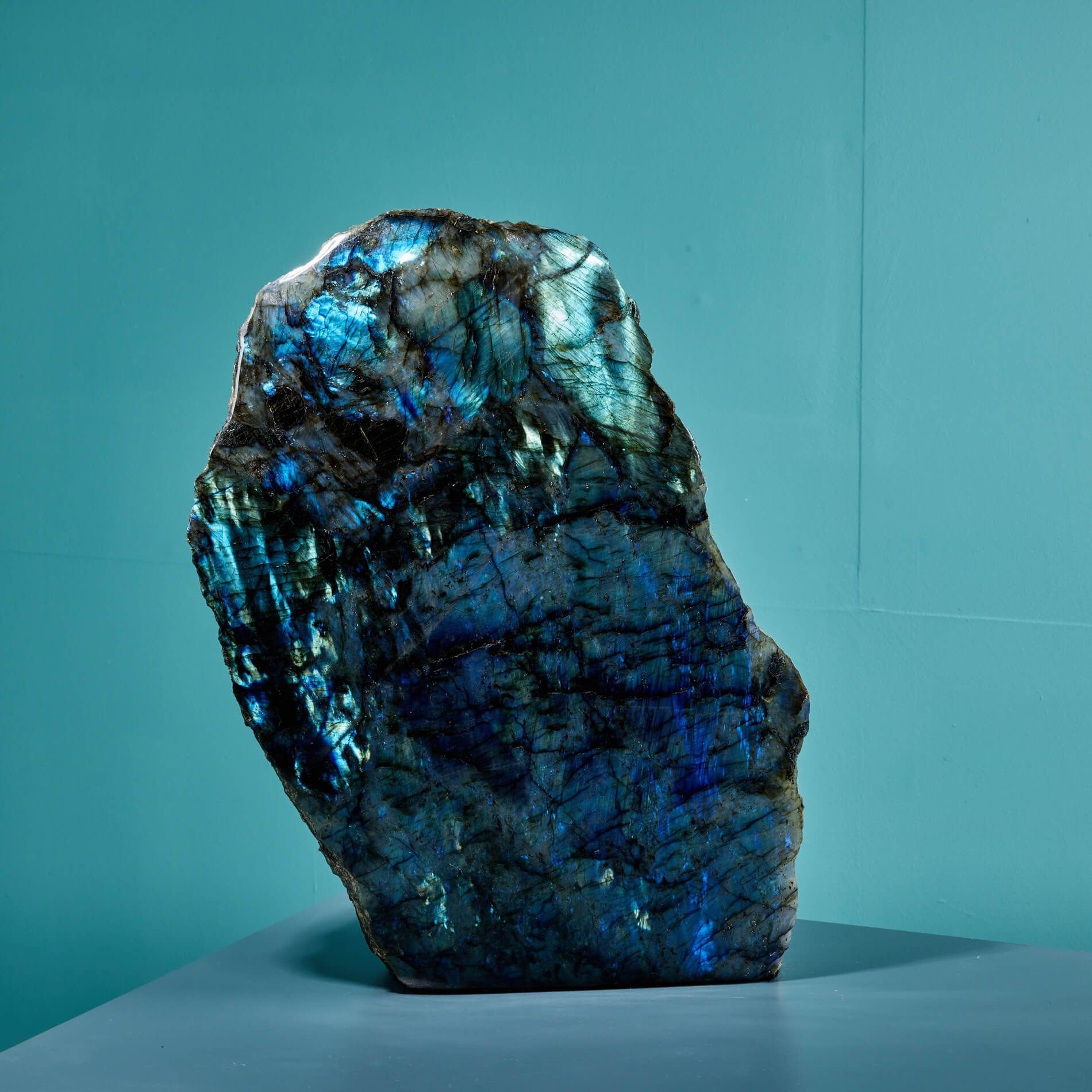 back to topA spectacular naturally formed large polished labradorite freeform sourced from Madagascar. Characterised by its iridescent colours, principally blue, this huge high grade labradorite mineral is a stunning specimen, the lustrous colours fluctuating as it is observed from different angles. It is freestanding, making a striking sculptural piece for an interior, with a polished face to one side and a natural living edge reverse.