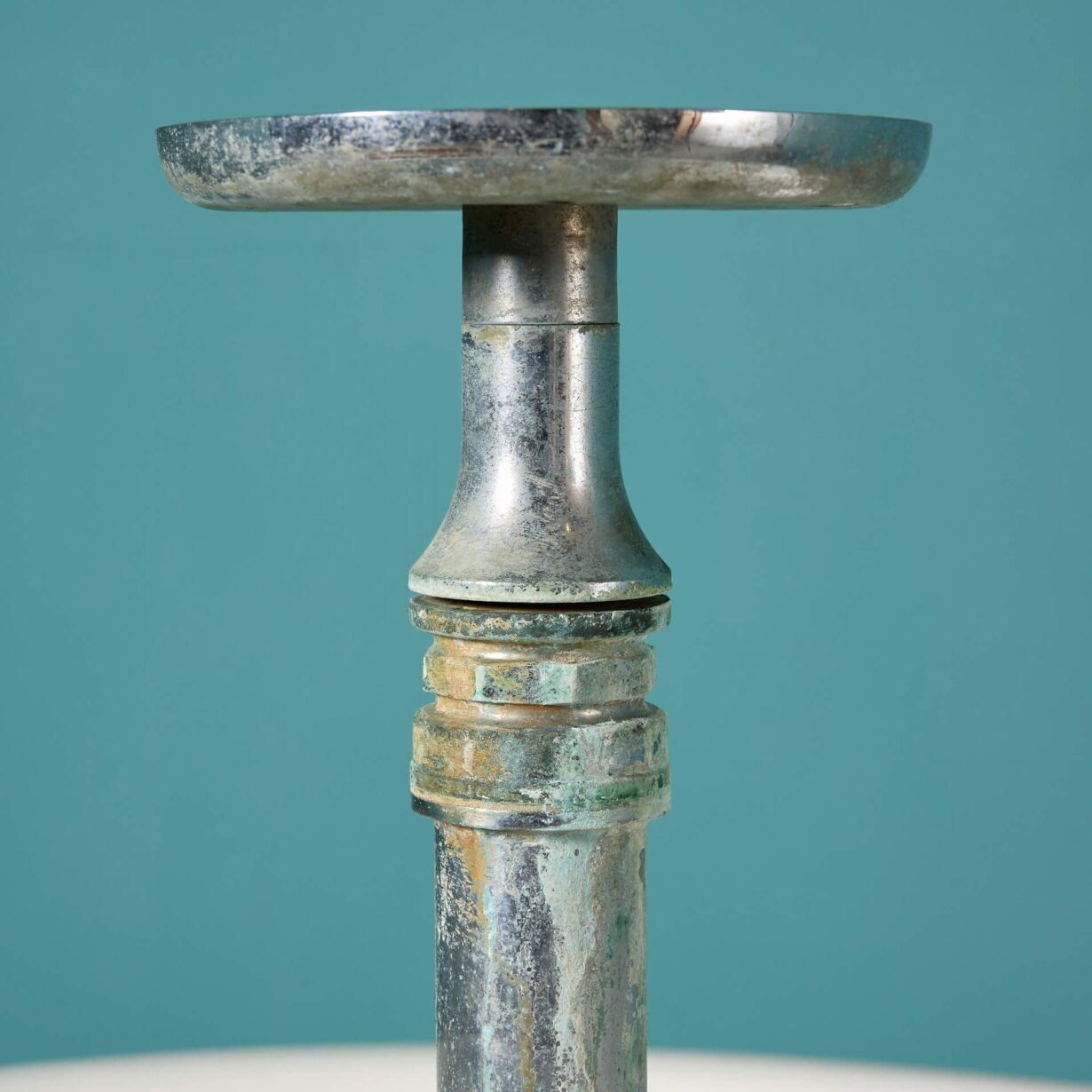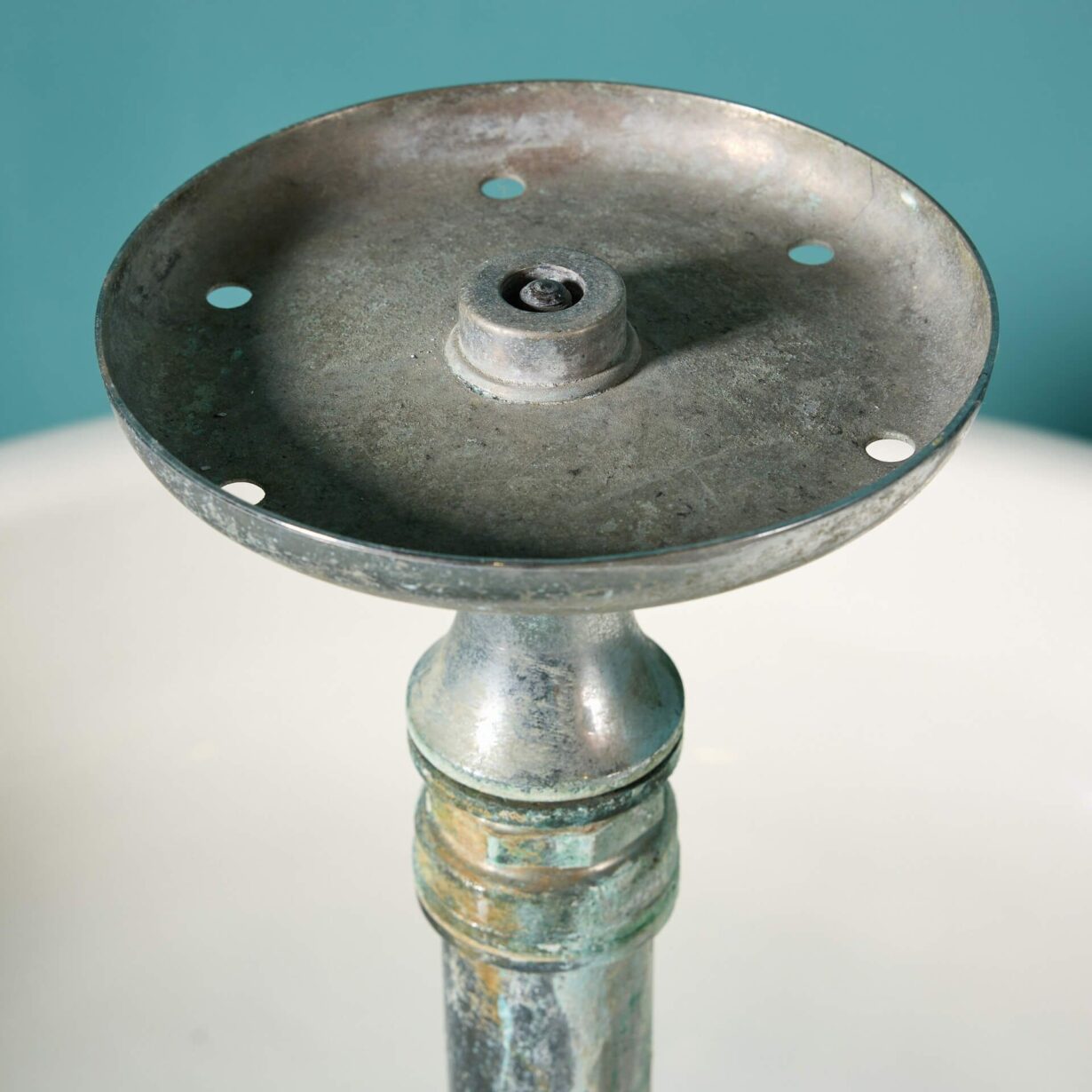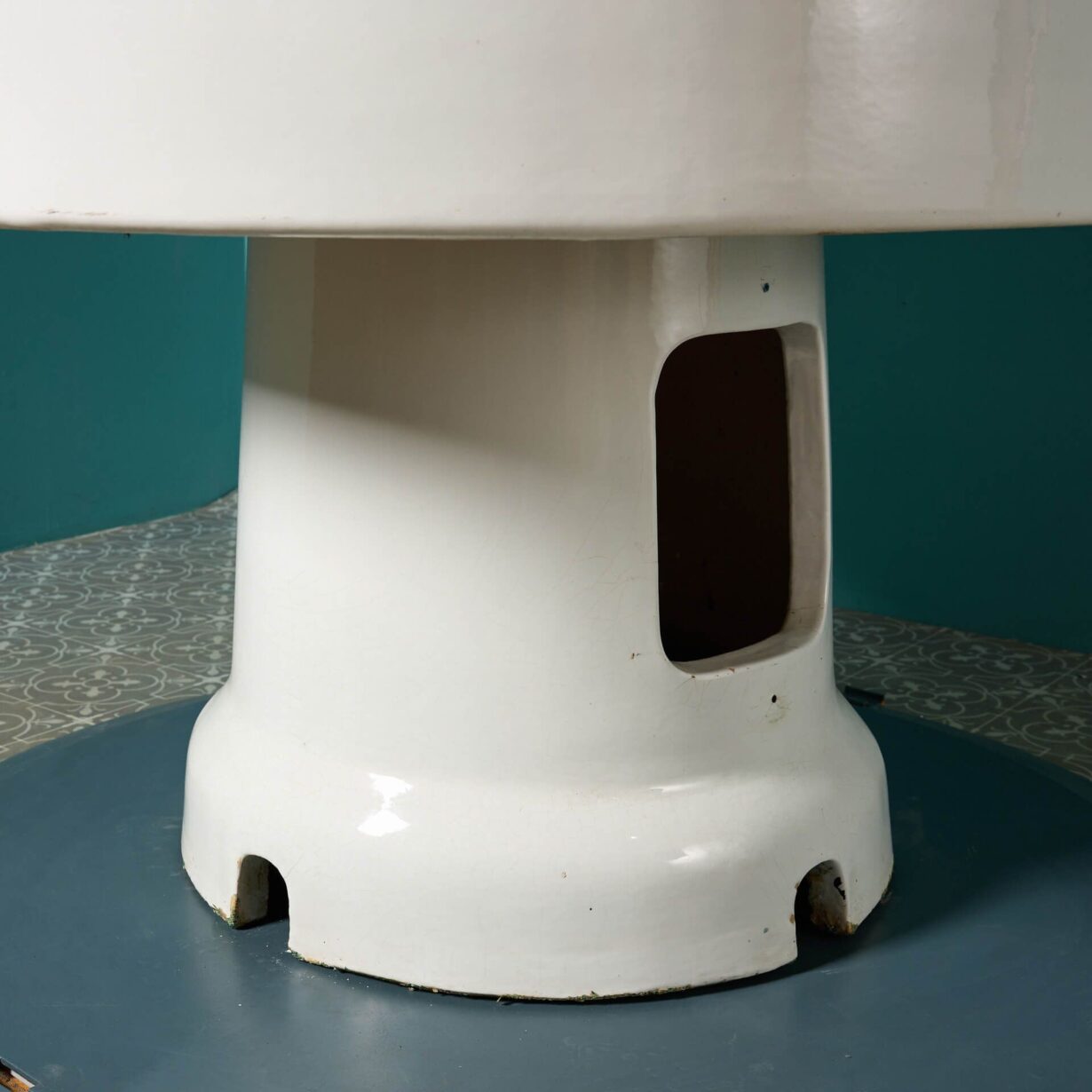 It is made from glazed stoneware and has a nickel-plated brass riser to the centre, the water designed to drain away at the base of the riser. Freestanding, the large round basin sits upon a pedestal base with two uncovered openings for access.